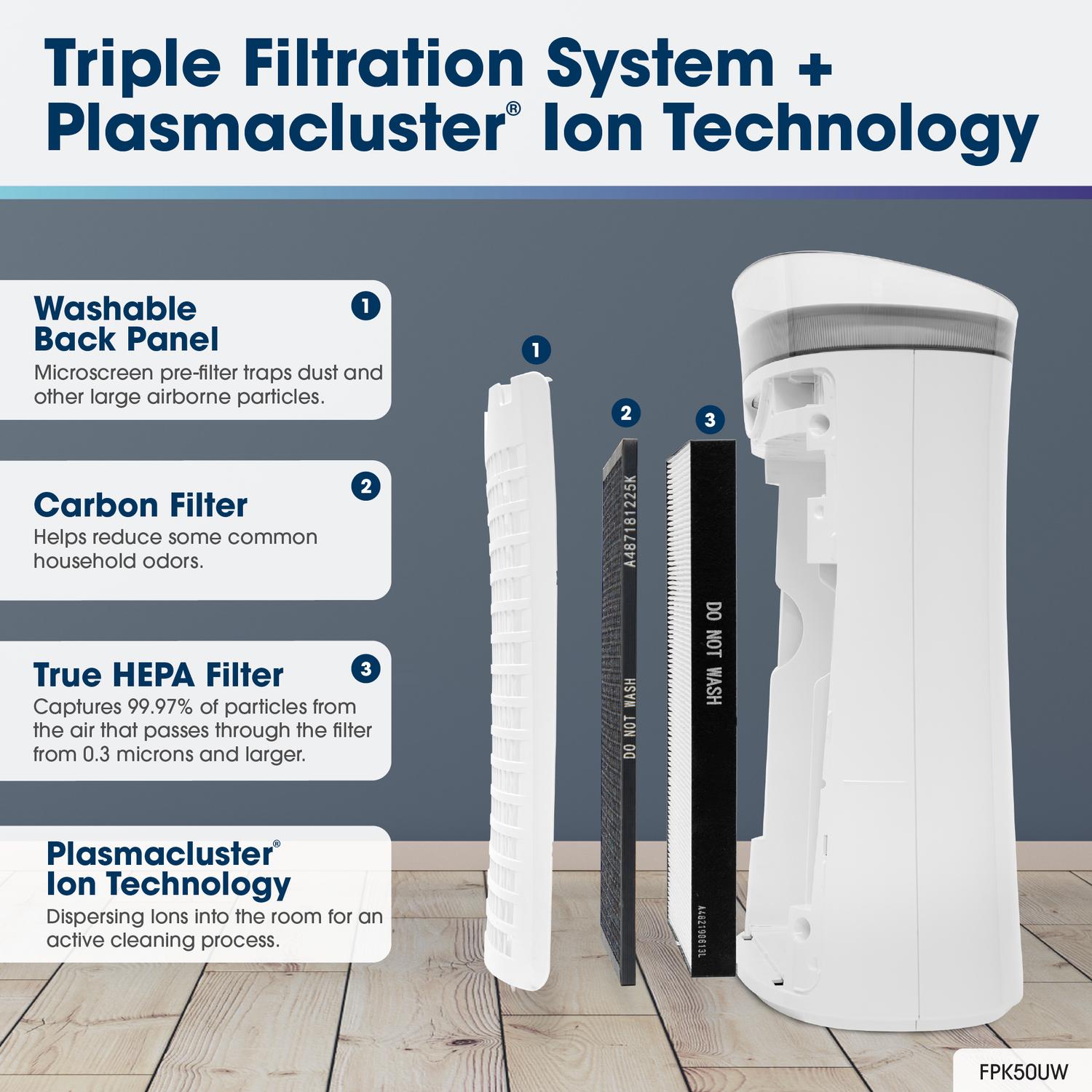 Beyond passive filtration, our FPK50UW features Plasmacluster(TM) Ion Technology for an active cleaning process. SHARP Plasmacluster(TM) Ion Technology has been tested around the world by laboratories in the United States, United Kingdom, Germany, Japan, South Korea, China, and Vietnam.
