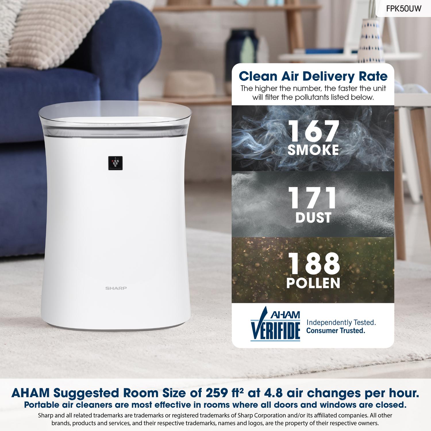 The Plasmacluster(TM) 7000 Series FPK50UW Air Purifier by SHARP is your choice for medium-sized rooms. Effective up to 1,253 sq. ft. at one air change per hour, the FPK50UW will filter the air in the AHAM Suggested Room Size of 259 sq. ft. at 4.8 air changes per hour.