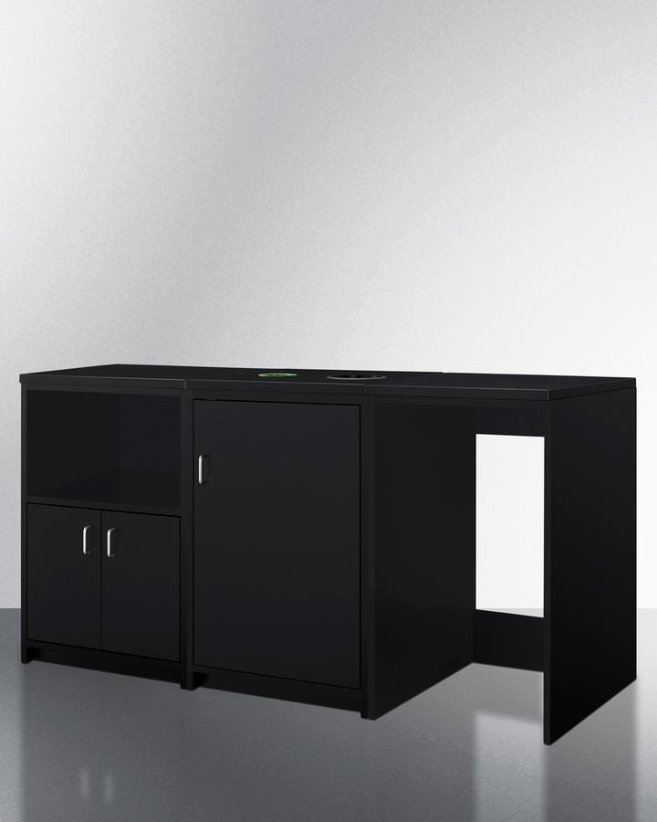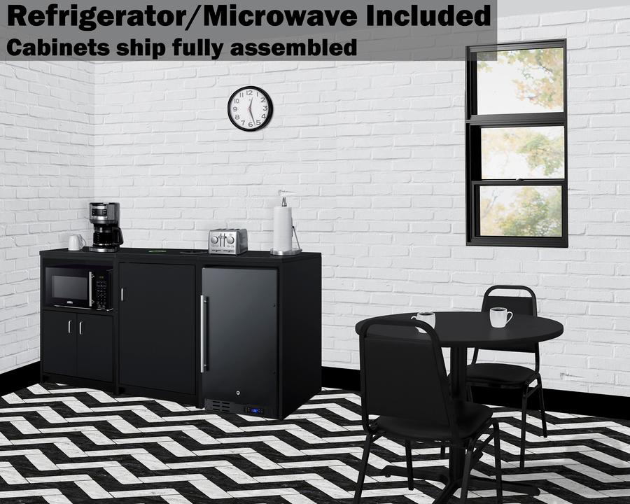 Summit's selection of American-made casework brings new convenience to break room design with fully assembled cabinetry that lets you create the perfect coffee station, office lounge, or refreshment center. The CWSUITE64R is comprised of five pieces: refrigerator cabinet (model CWR2ADA), Summit FF1843BADA all-refrigerator, trash bin cabinet CWC5ADA, microwave SM903BSA, and storage cabinet CWM1ADA. The cabinetry ships full assembled and individually packaged, allowing you to rearrange the layout to best suit the needs of your space. The cabinet height is 34" in order to comply with ADA guidelines for accessibility. Each cabinet piece is manufactured in the USA from engineered wood in a jet black laminate finish. The trash cabinet includes two bins and two counter holes to allow easy separation of rubbish and recycling. The CWM1ADA cabinet features lower cabinet storage with a French door swing and a cutout to house the microwave or another small appliance, such as a coffeemaker. The pre-installed hole in the rear lets you run power cords without bending. Microwave SM903BSA features a built-in outlet to accept a 2 or 3-prong cord, allowing easy 1-plug operation that will temporarily shut off the other second device while the microwave is in use to prevent power surges. It also comes with two USB ports to charge mobile devices. Refrigerator FF1843BADA offers a full 2.7 cu.ft. of storage capacity, with no-frost operation, digital temperature control, and LED lighting. It comes in a black finish with a reversible locking door. In addition to this suite design, Summit offers more styles and sizes. You can also build your own by combining any combination of our modular casework cabinets and appliances. All furniture ships fully assembled. Browse the full Summit portfolio to create the perfect solution for break rooms, schools, welcome lounges, and more.