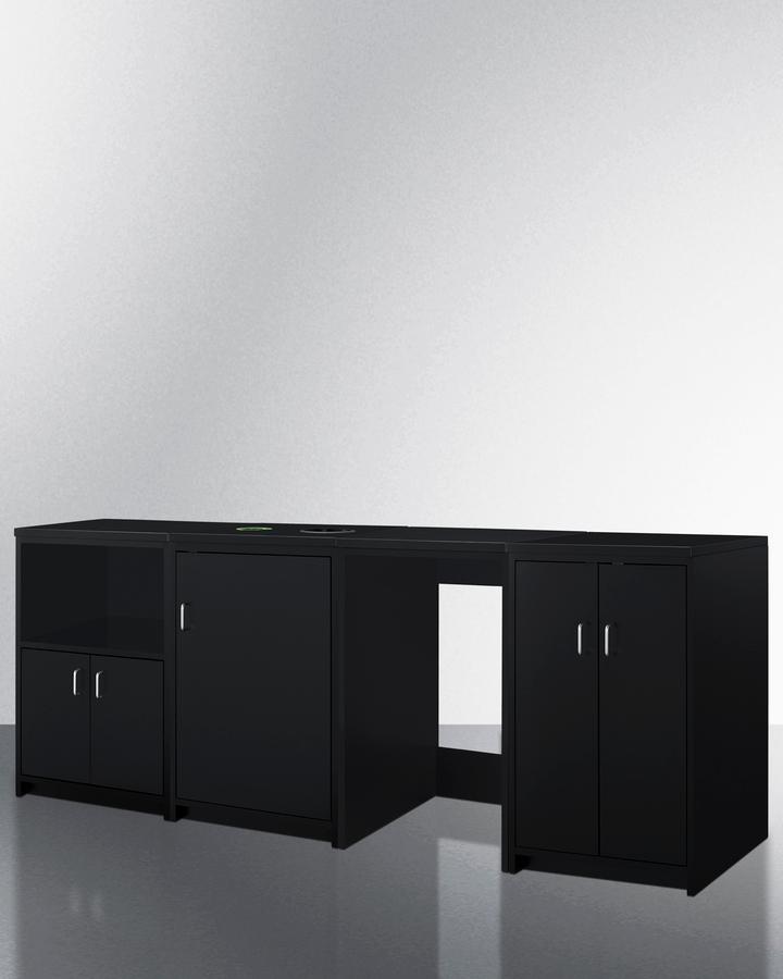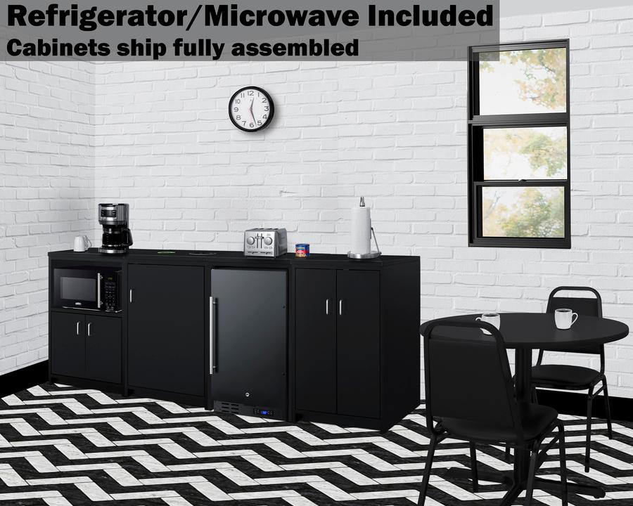 Summit's selection of American-made casework brings new convenience to break room design with fully assembled cabinetry that lets you create the perfect coffee station, office lounge, or refreshment center. The CWSUITE85R is comprised of six pieces: refrigerator cabinet (model CWR2ADA), Summit FF1843BADA all-refrigerator, trash bin cabinet CWC5ADA, microwave SM903BSA, and storage cabinets CWC1ADA and CWM1ADA. The cabinetry ships full assembled and individually packaged, allowing you to rearrange the layout to best suit the needs of your space. The cabinet height is 34" in order to comply with ADA guidelines for accessibility. Each cabinet piece is manufactured in the USA from engineered wood in a jet black laminate finish. The trash cabinet includes two bins and two counter holes to allow easy separation of rubbish and recycling. The CWC1ADA cabinet features a French door swing and adjustable shelf, while the CWM1ADA cabinet features lower cabinet storage with a French door swing and a cutout to house the microwave or another small appliance, such as a coffeemaker. The pre-installed hole in the rear lets you run power cords without bending. Microwave SM903BSA features a built-in outlet to accept a 2 or 3-prong cord, allowing easy 1-plug operation that will temporarily shut off the other second device while the microwave is in use to prevent power surges. It also comes with two USB ports to charge mobile devices. Refrigerator FF1843BADA offers a full 2.7 cu.ft. of storage capacity, with no-frost operation, digital temperature control, and LED lighting. It comes in a black finish with a reversible locking door. In addition to this suite design, Summit offers more styles and sizes. You can also build your own by combining any combination of our modular casework cabinets and appliances. All furniture ships fully assembled. Browse the full Summit portfolio to create the perfect solution for break rooms, schools, welcome lounges, and more.