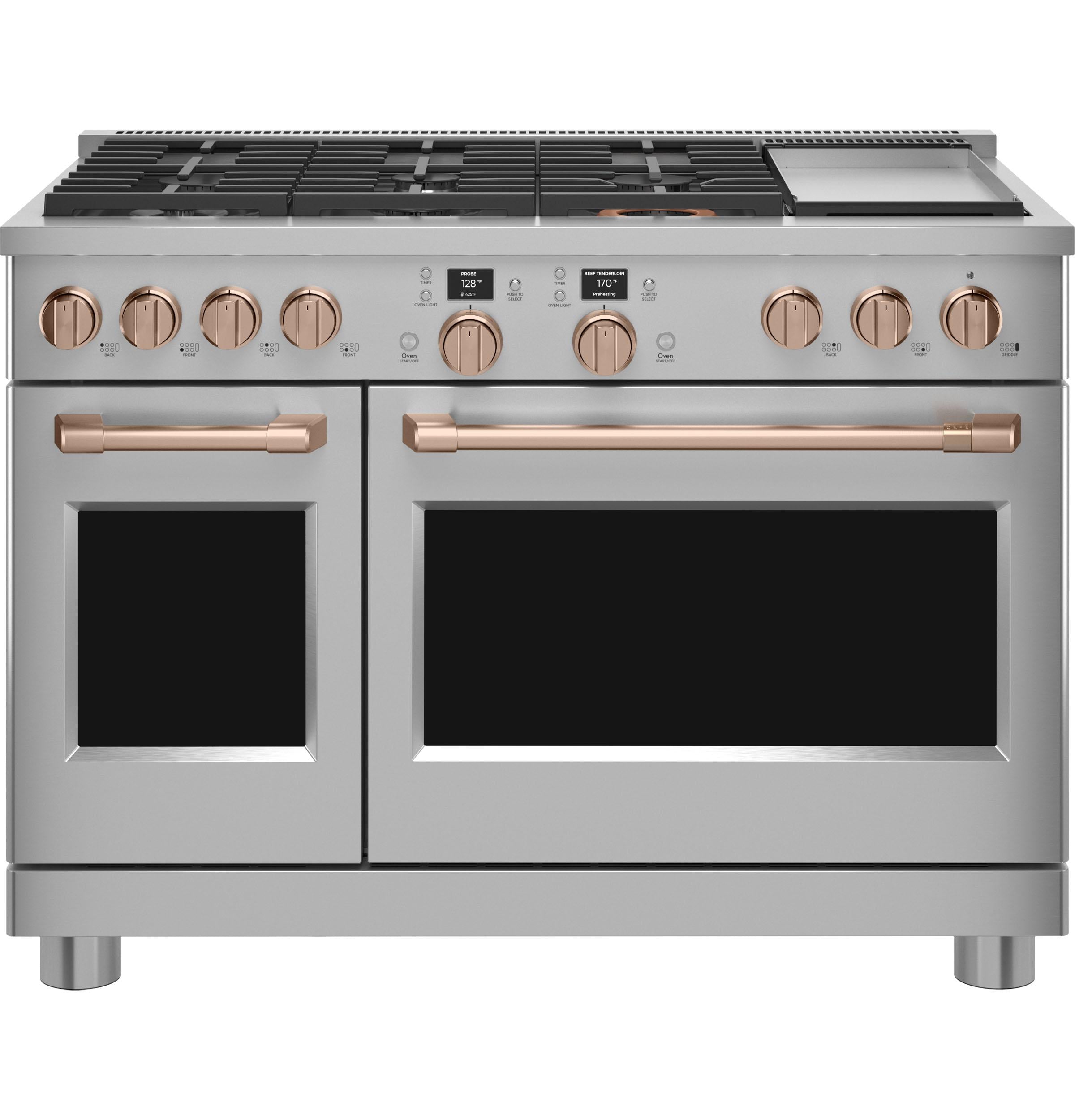 Elevate your culinary experience with the Café C2Y486P2TS1, a 48-inch smart dual-fuel professional range designed for superior performance and precision cooking. This dual-fuel range combines a gas cooktop with an electric convection oven, offering the best of both worlds for optimal cooking results.