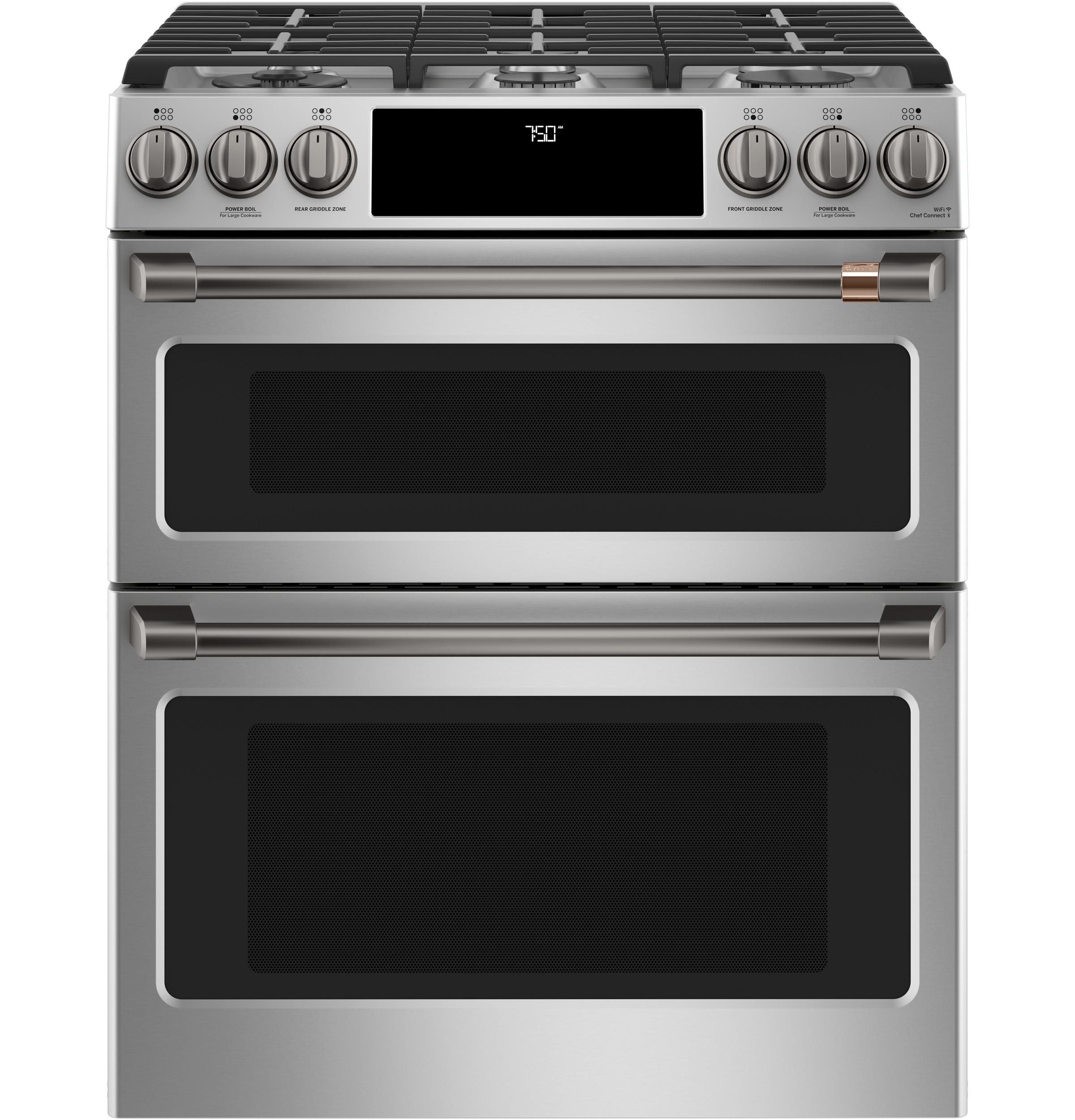 Elevate your culinary experience with the Café™ 30" Smart Slide-In, Front-Control, Gas Double-Oven Range with Convection (model CGS750P2MS1). This range boasts the industry's first six-burner, edge-to-edge cooktop, accommodating cookware of all sizes. The integrated cast-iron griddle provides ample space for preparing crowd favorites. The double ovens offer a combined capacity of 7.0 cu. ft., allowing you to cook multiple dishes simultaneously. The lower oven features True European Convection with Precise Air for even heat distribution. Built-in WiFi, powered by the SmartHQ™ App, enables remote management of oven functions and access to downloadable cooking upgrades, including a no-preheat Air Fry feature. The sleek backlit glass touch control panel adds a modern touch, illuminating only when in use. An integrated temperature probe ensures meats are cooked to perfection without opening the oven door. Chef Connect allows synchronization of appliance clocks, surface lights, and vents for a chef-like experience.
