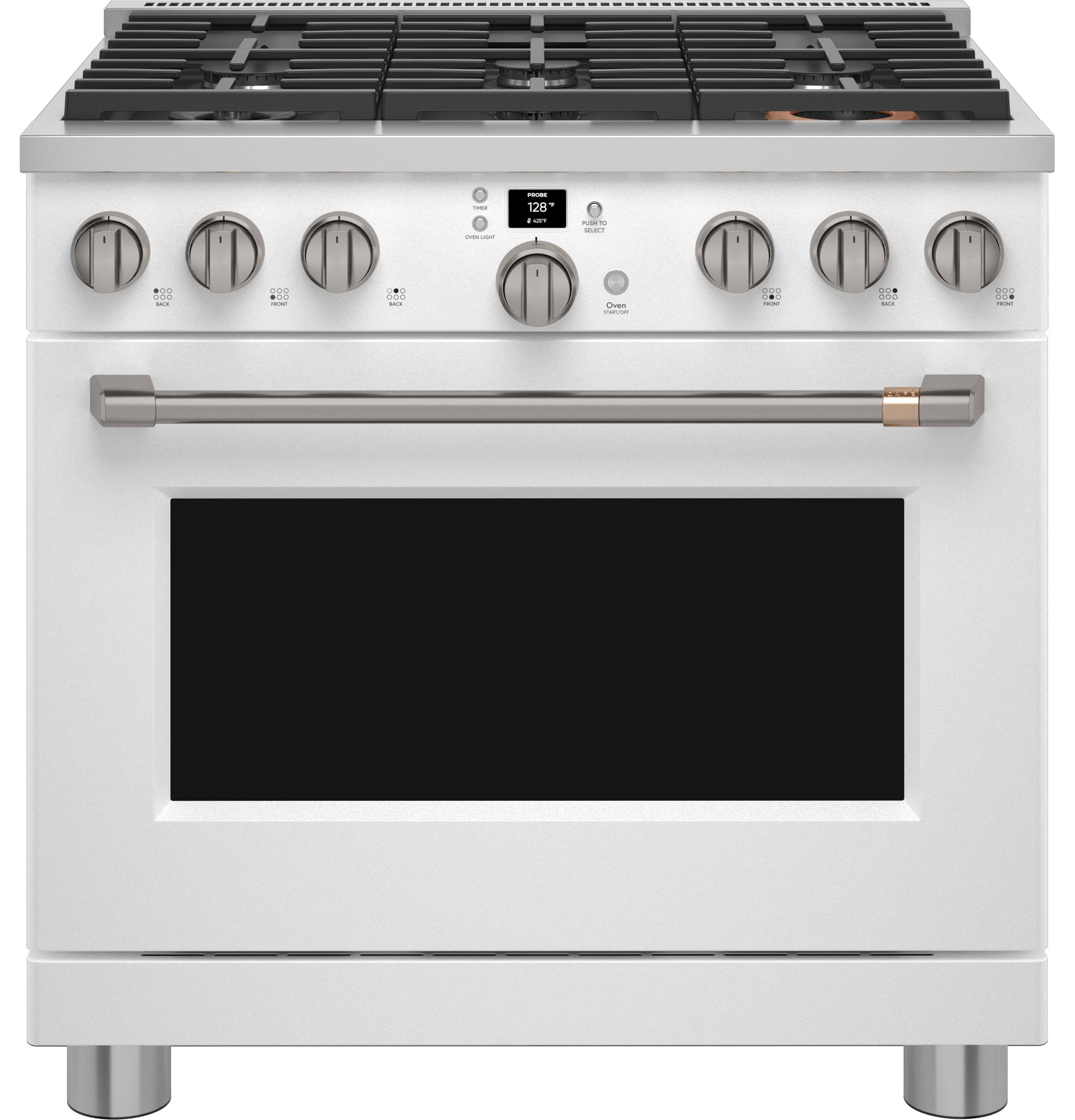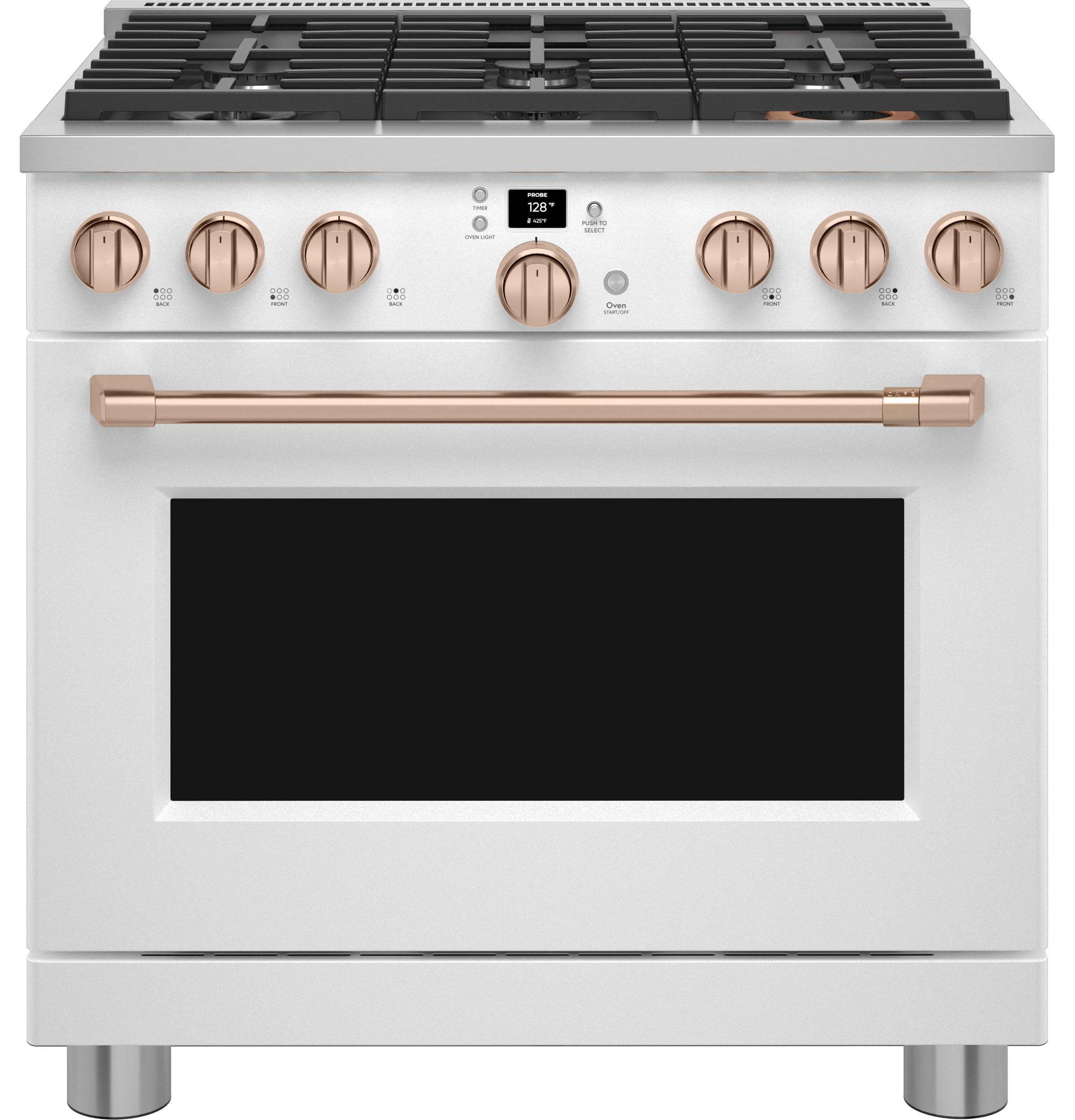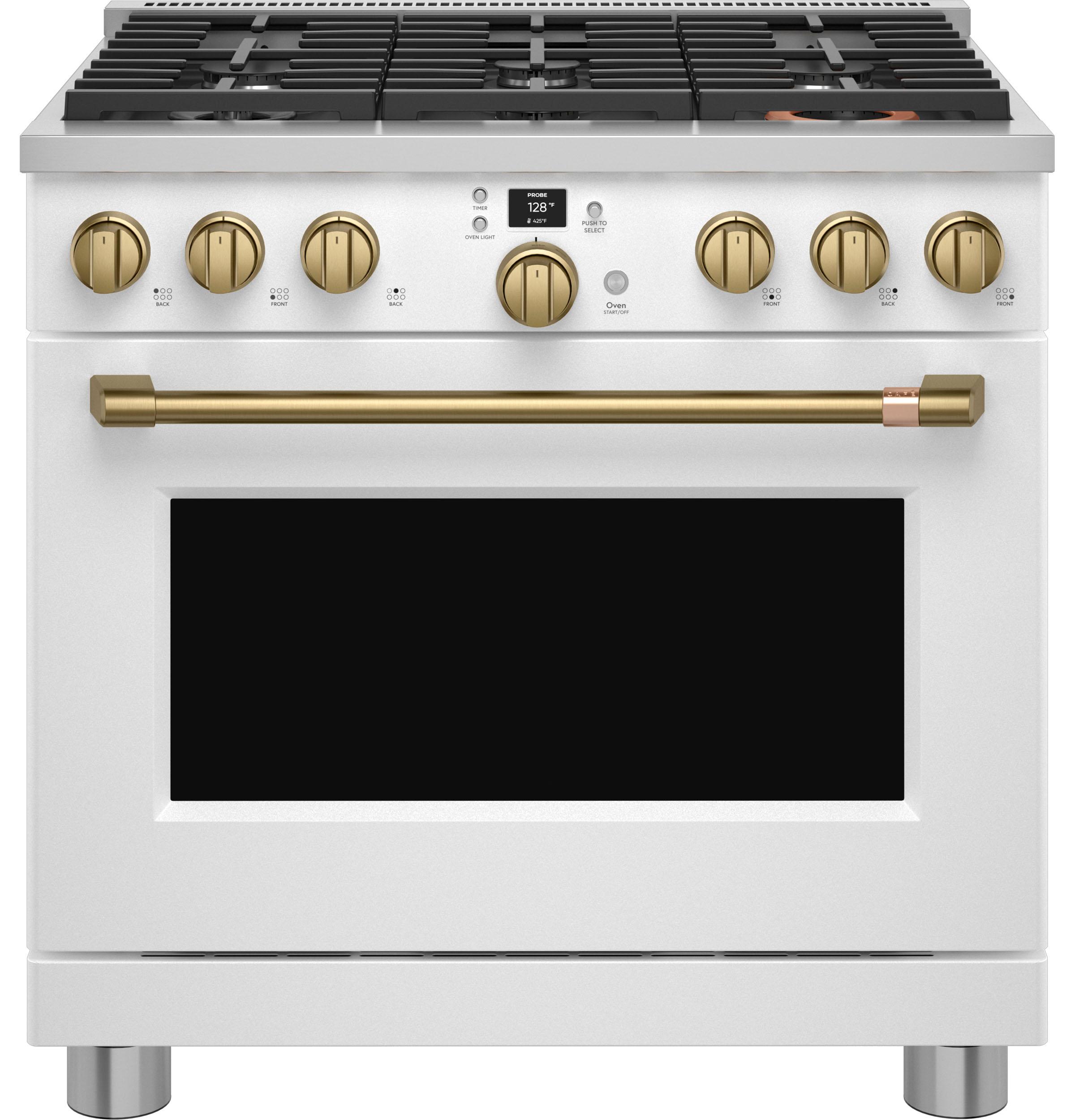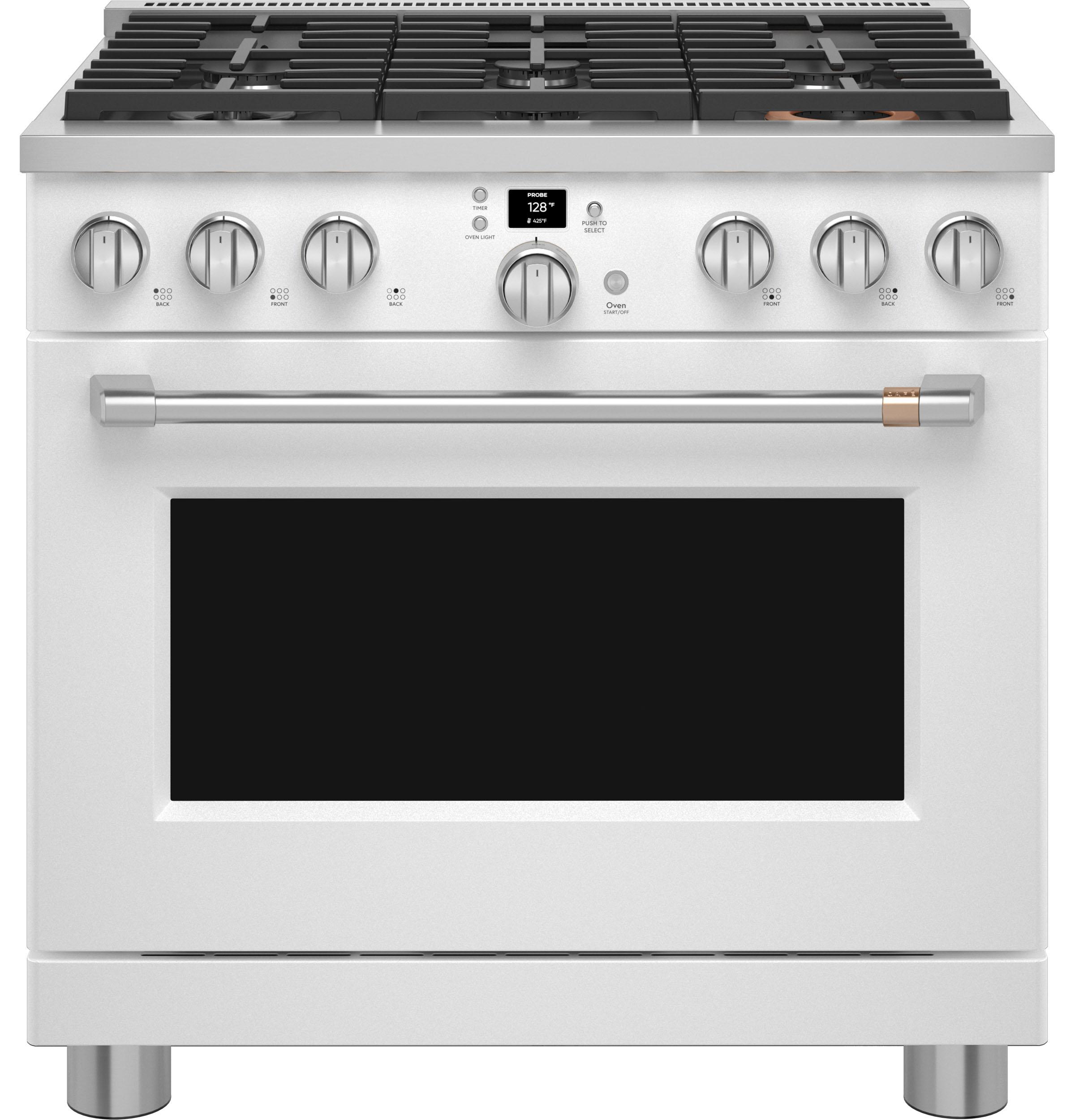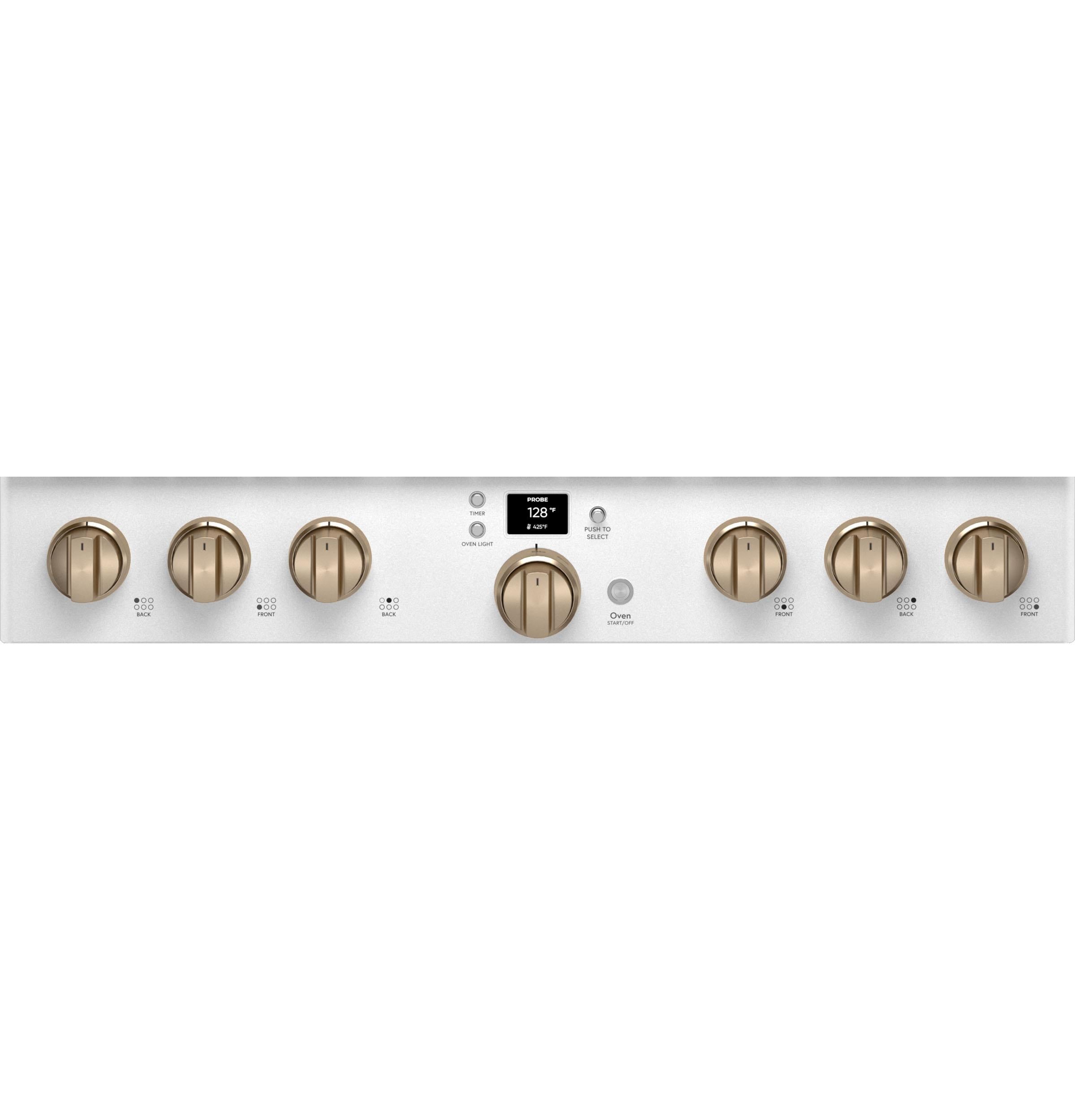 Designed for both professional chefs and home cooking enthusiasts, the Café™ CGY366P4TW2 offers a blend of style and functionality. The cooktop includes an industry-exclusive Inspiral burner that evenly distributes heat by swirling the flame beneath cookware. A multi-ring burner provides different-sized flame rings on a single element, offering the flexibility of multiple burners in one. The oven's 6.2 cu. ft. capacity accommodates full-size catering pans and features Precision Cooking modes along with a temperature probe to ensure optimal results. With built-in Wi-Fi, users can control oven functions via the SmartHQ app, enhancing convenience and connectivity.
