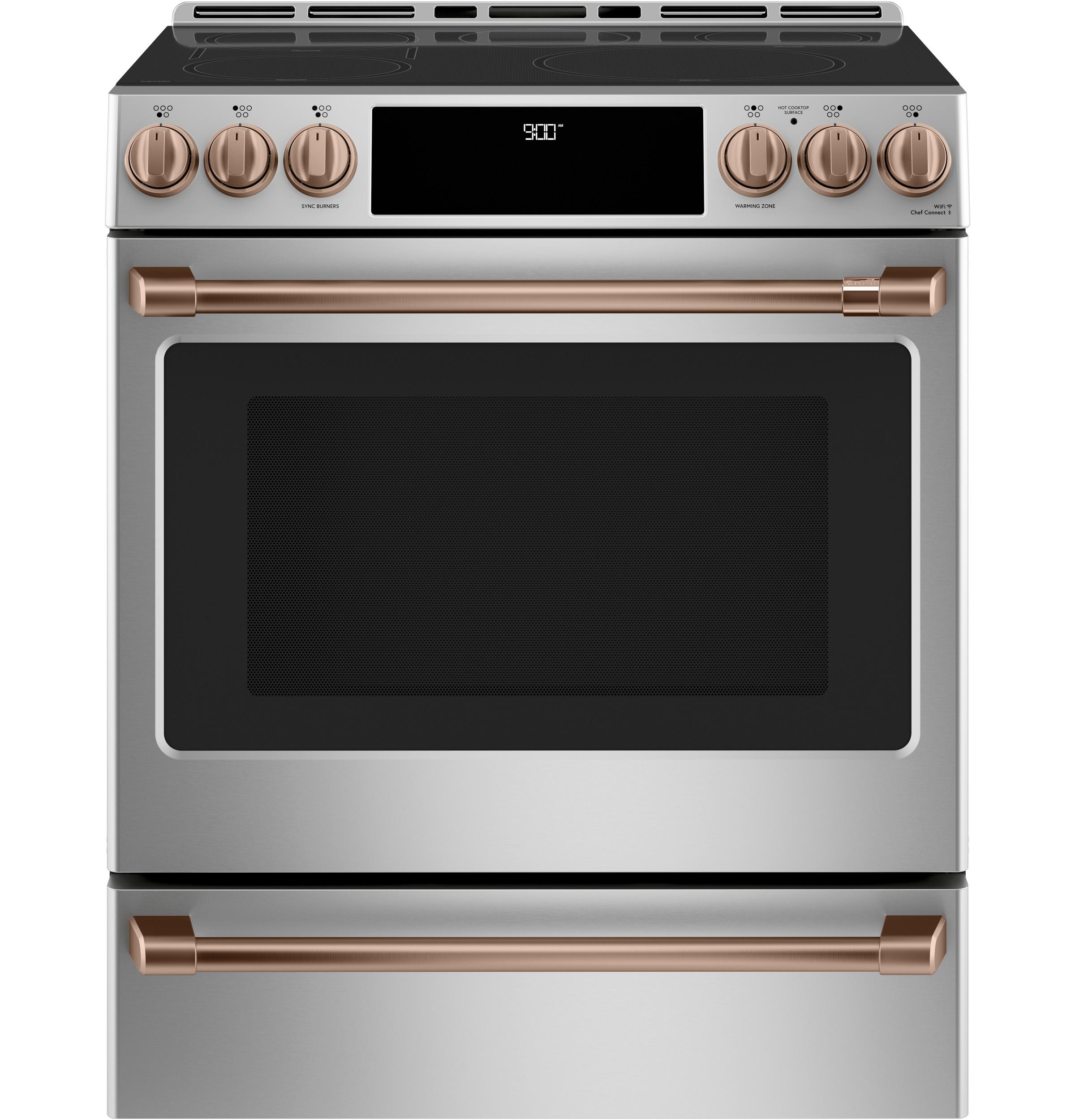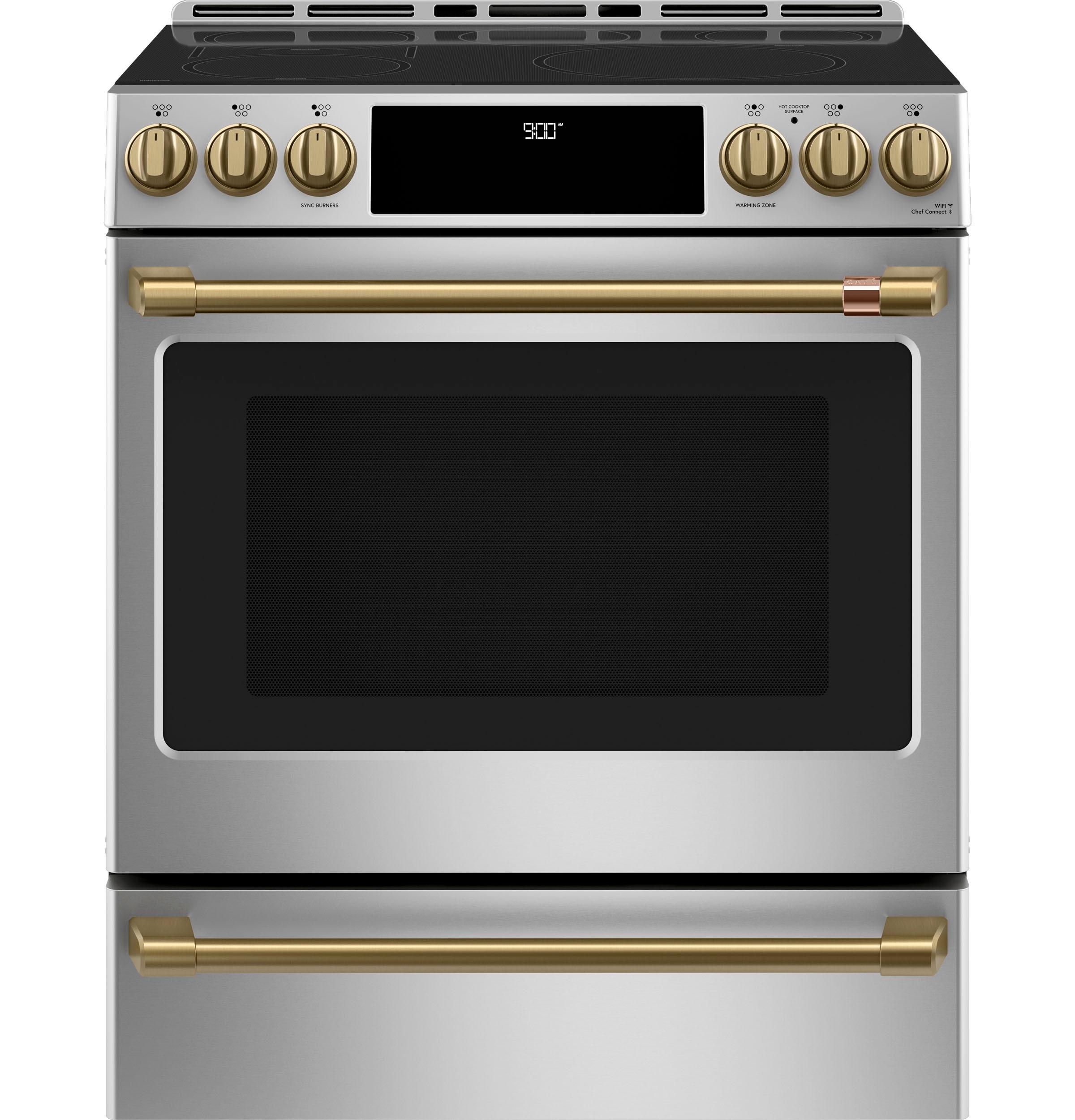 Elevate your cooking experience with the Café™ 30" Smart Slide-In Induction and Convection Range (model CHS900P2MS1). This range boasts an 11" 3,700-watt induction element, capable of boiling a quart of water in just 101 seconds, and maintaining precise temperatures for delicate tasks like melting and simmering. The Gourmet Guided Cooking feature offers video-guided recipes that automatically adjust time, temperature, and cooking pace for perfect results. A sleek backlit glass touch control panel visually disappears when not in use and illuminates upon prompting, adding a modern touch to your kitchen. Additional features include Built-In WiFi powered by the SmartHQ™ App for remote management, No-Preheat Air Fry for healthier, crispier food, and a Warming Drawer to keep dishes at the ideal temperature until ready to serve. The oven provides a spacious 5.7 cu. ft. capacity with True European Convection for even baking and roasting. The range also offers a Precision Cooking Probe (sold separately) for sous vide cooking and other precise culinary techniques. With customizable hardware options, you can select from various premium finishes and hardware combinations to match your personal style.