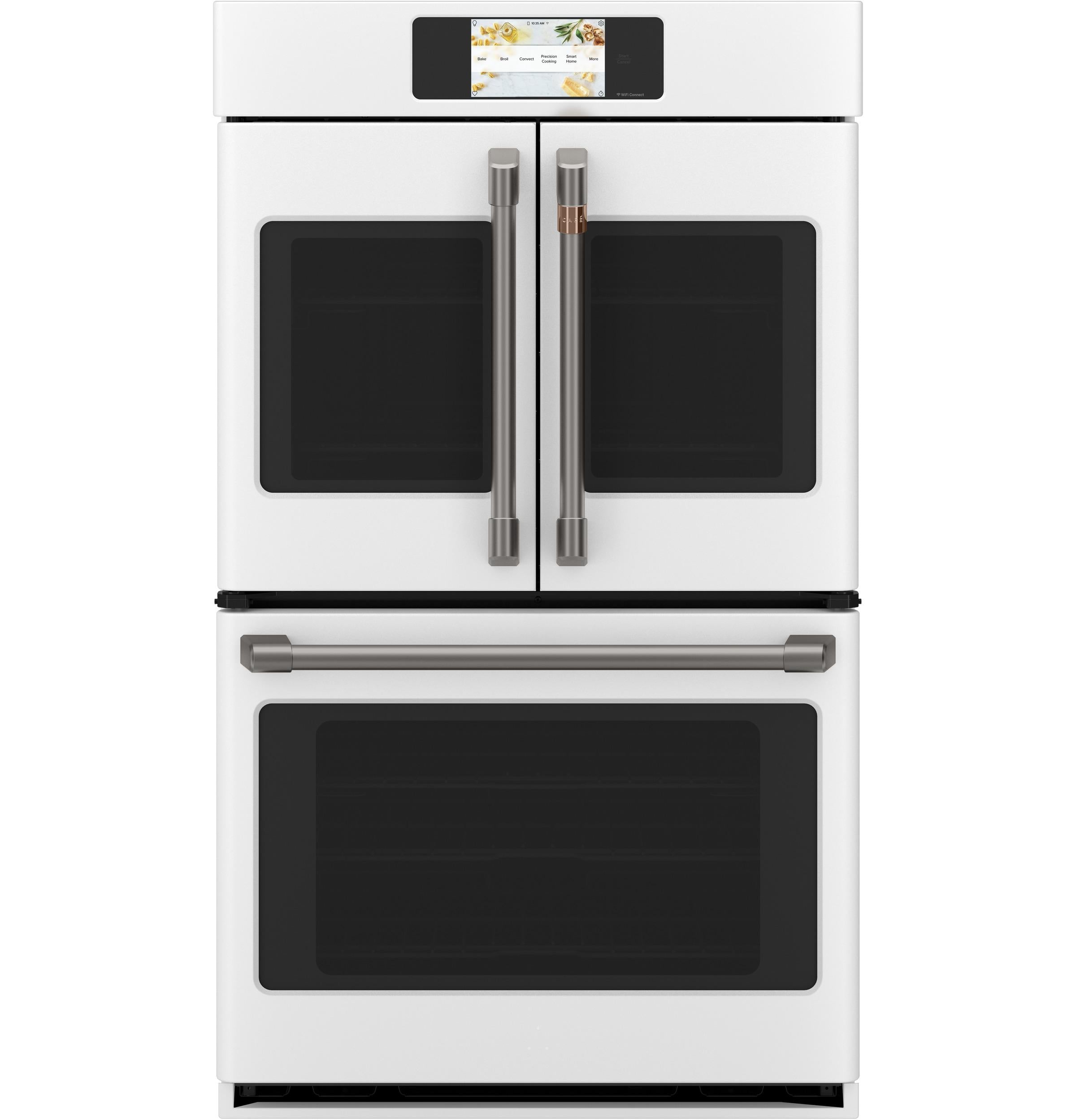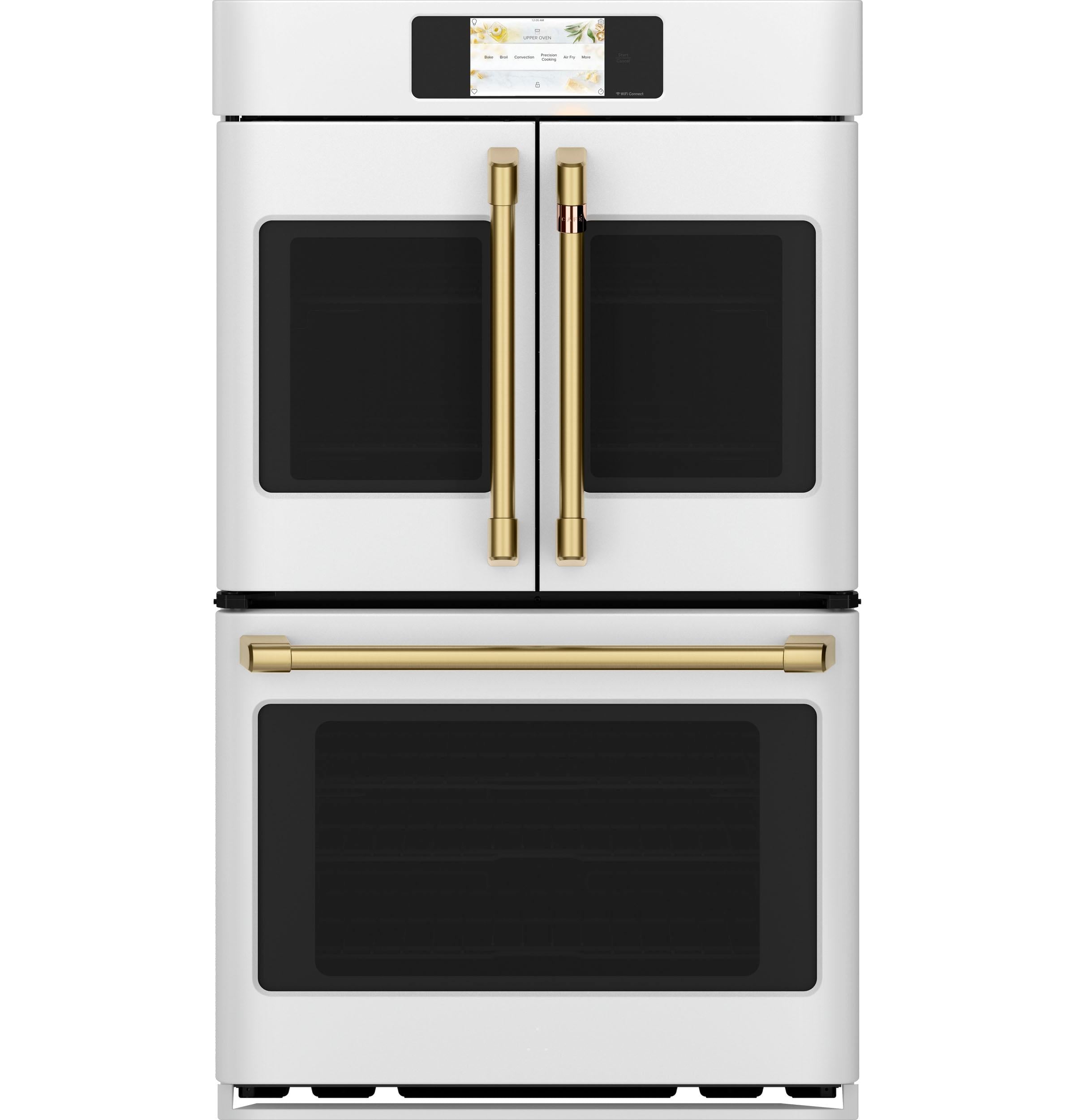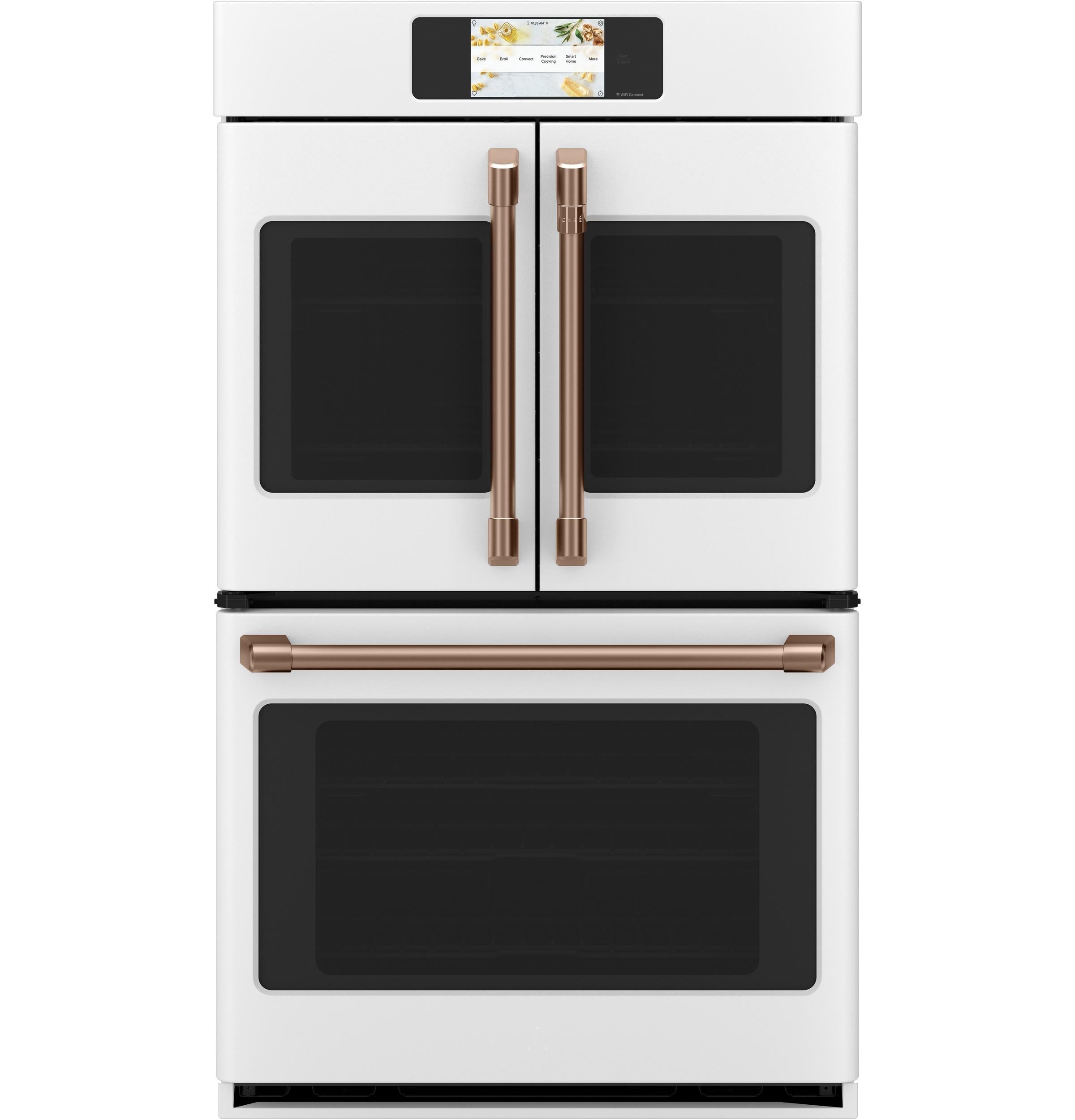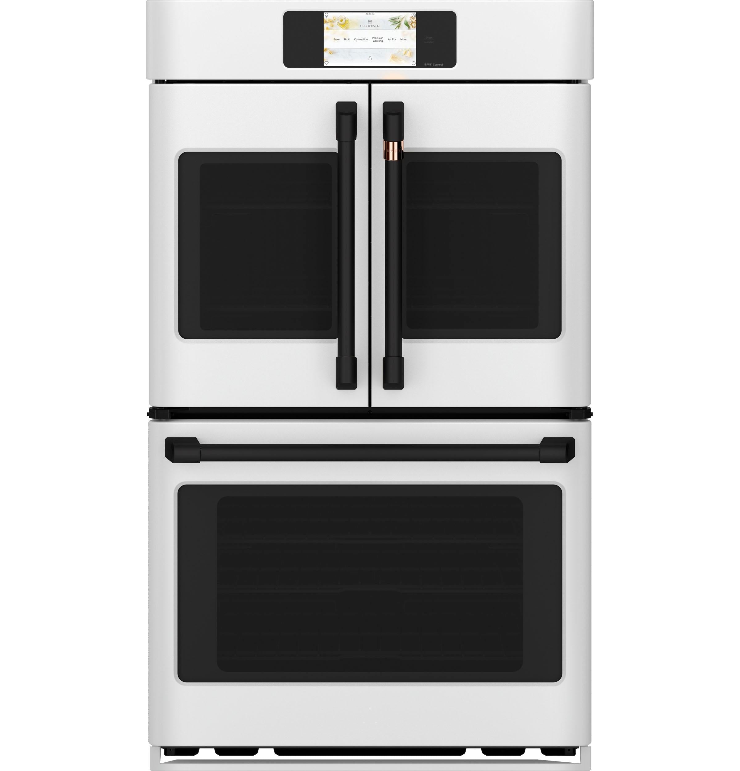 The Café CTD90FP4NW2 30-Inch Smart Built-In Convection French-Door Double Wall Oven combines professional-grade performance with customizable style. The upper oven's French-door design allows for single-hand opening of both doors, facilitating easy access to dishes. Both ovens are equipped with True European Convection with Direct Air, ensuring consistent heat distribution for perfectly baked and roasted dishes. The built-in Wi-Fi, powered by the SmartHQ™ app, enables remote monitoring and control, recipe updates, and notifications. The full-color touch display provides intuitive navigation through cooking modes and settings, while the matte white finish with customizable hardware options allows for a personalized kitchen design.