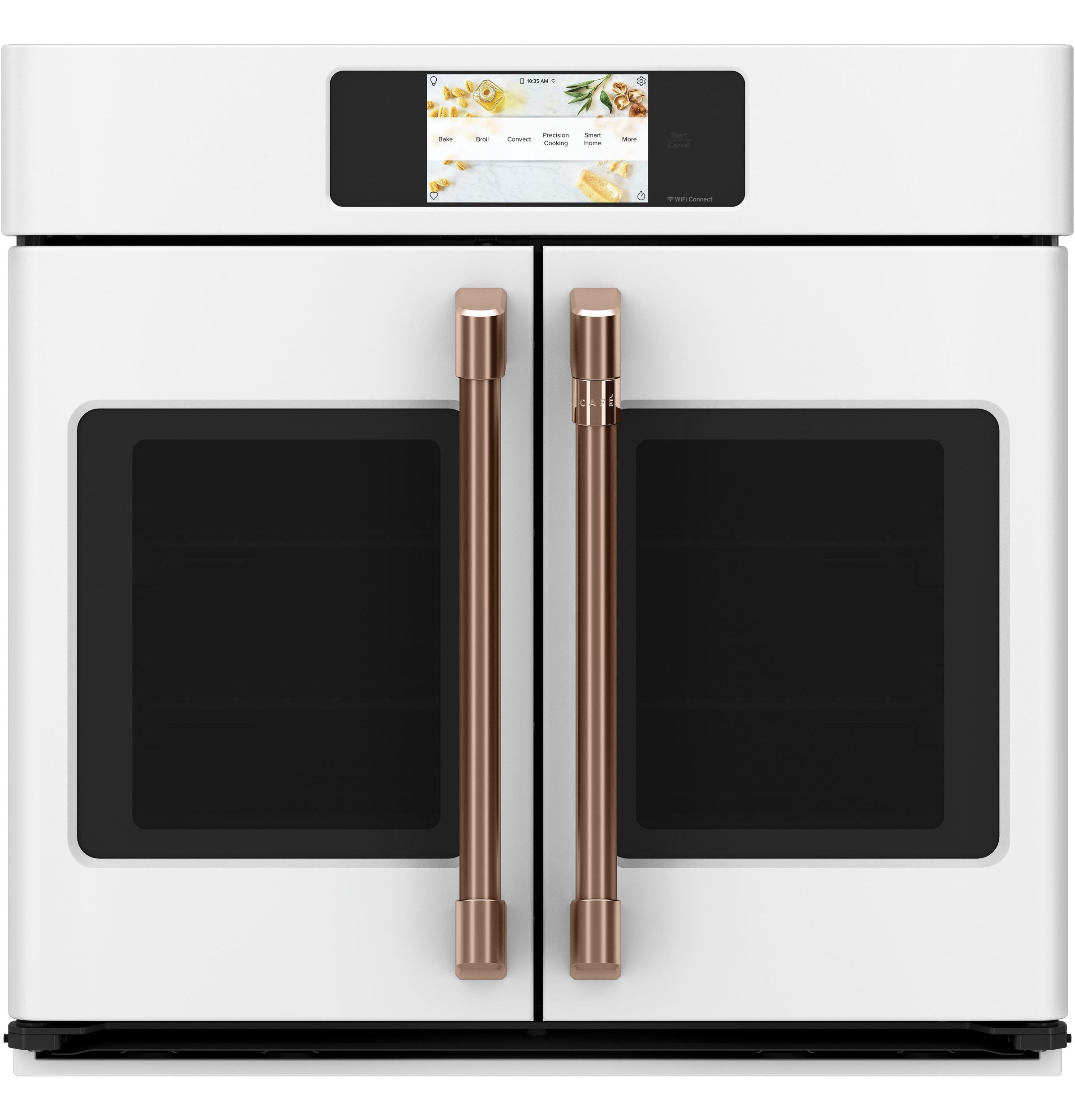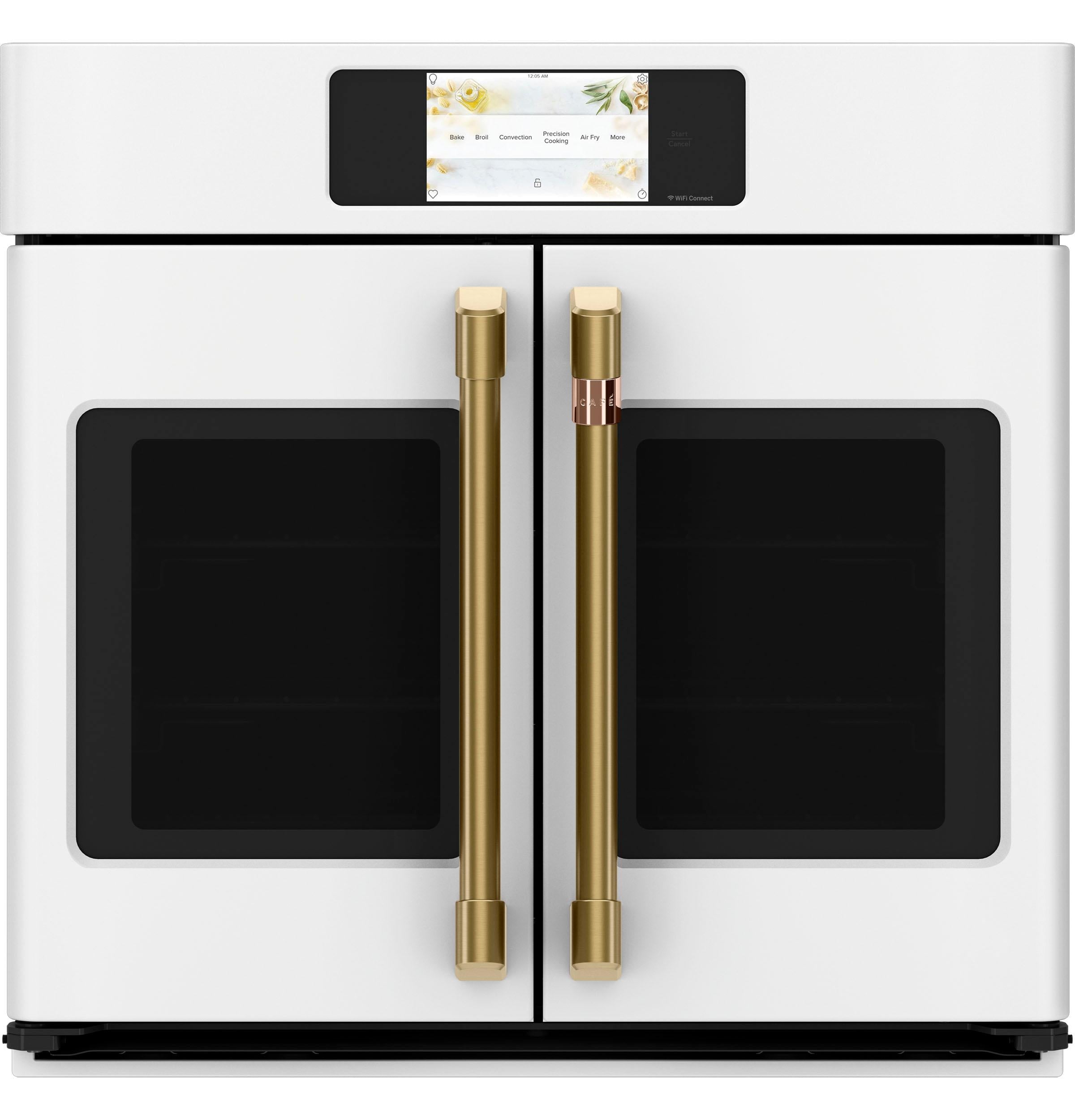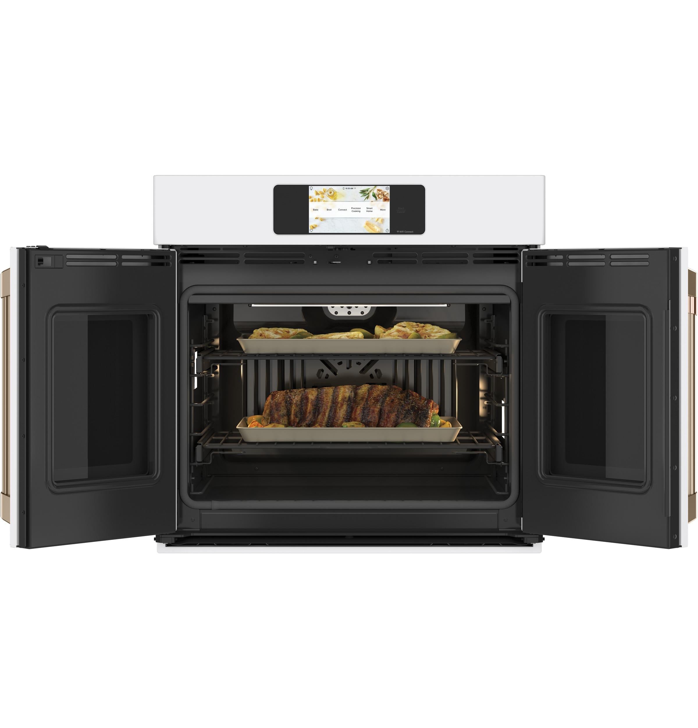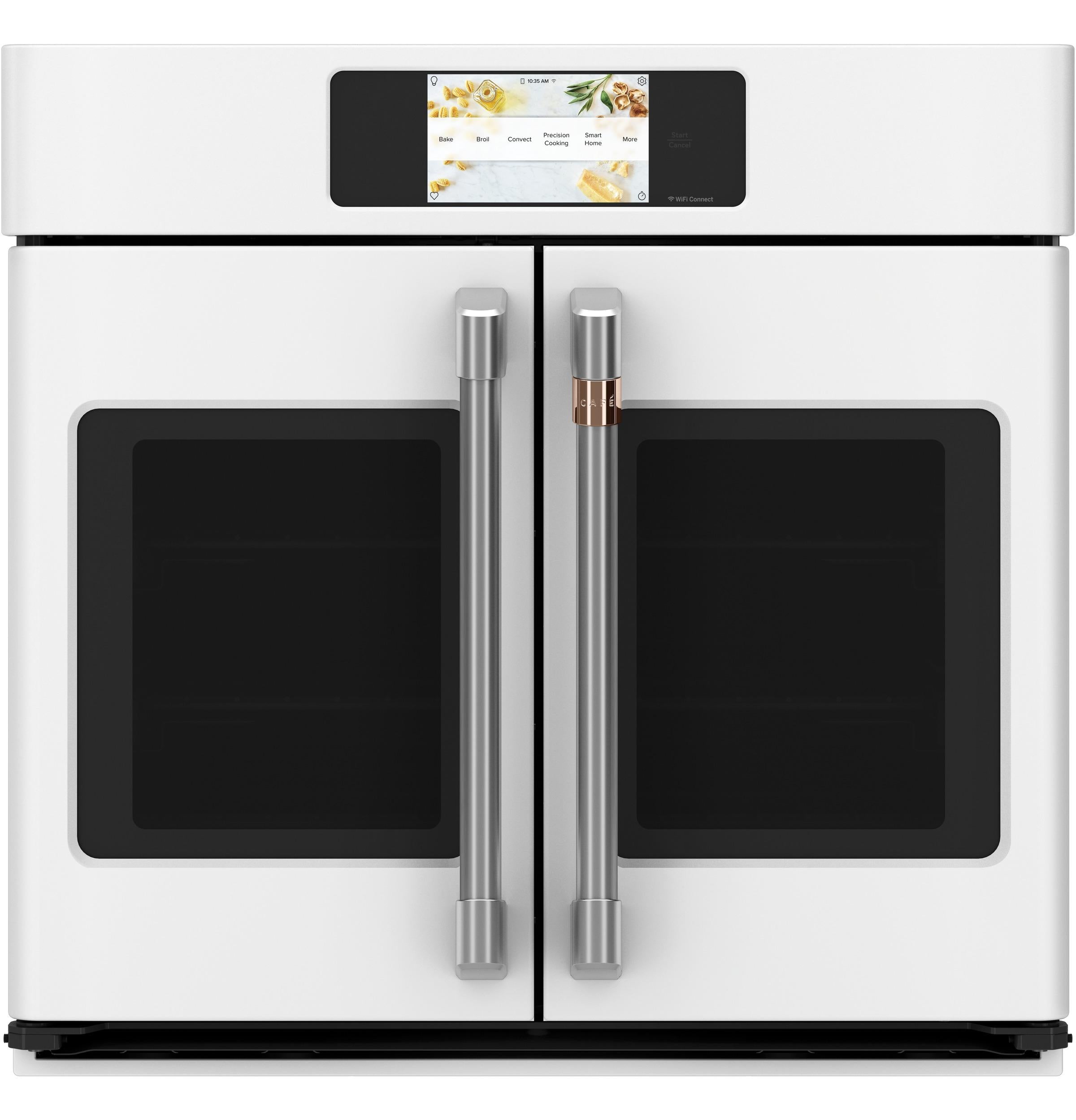 Elevate your kitchen's functionality and style with the Café™ Professional Series 30" Smart Built-In Convection French-Door Single Wall Oven (model CTS90FP4NW2). This oven features a distinctive French-door design, allowing you to open both doors simultaneously with a single hand, providing convenient access to your culinary creations. The Matte White finish, complemented by customizable handle options, adds a touch of sophistication to any kitchen decor. Equipped with True European Convection with Direct Air, this oven ensures even heat distribution for consistent baking and roasting results. The Precision Cooking Modes automatically track progress, modify temperatures, and adjust cook times, enabling you to confidently try new recipes and achieve perfect outcomes. With built-in WiFi, powered by the SmartHQ™ App, you can manage all aspects of your kitchen remotely, including downloading the latest features such as No-Preheat Air Fry, which allows you to cook healthier, crispier versions of your favorite foods without preheating. The oven also boasts a stunning full-color touch display, adding an unexpected touch of style to your kitchen and making it easy to navigate settings. Additional features include a 10-pass dual broil element for even browning, self-cleaning with a steam clean option for easy maintenance, and two Never Scrub Roller Racks that glide smoothly for effortless loading and unloading of dishes.