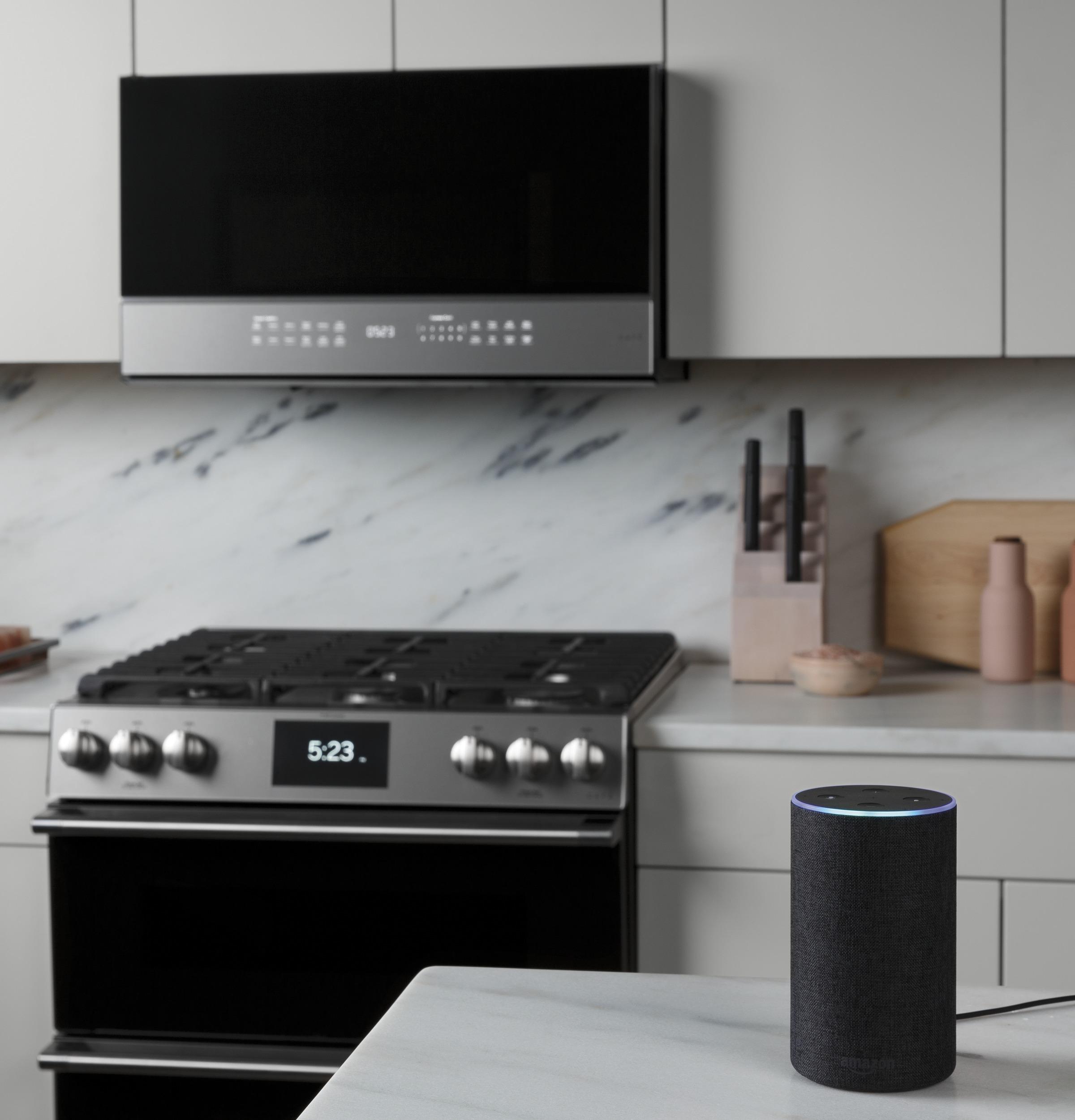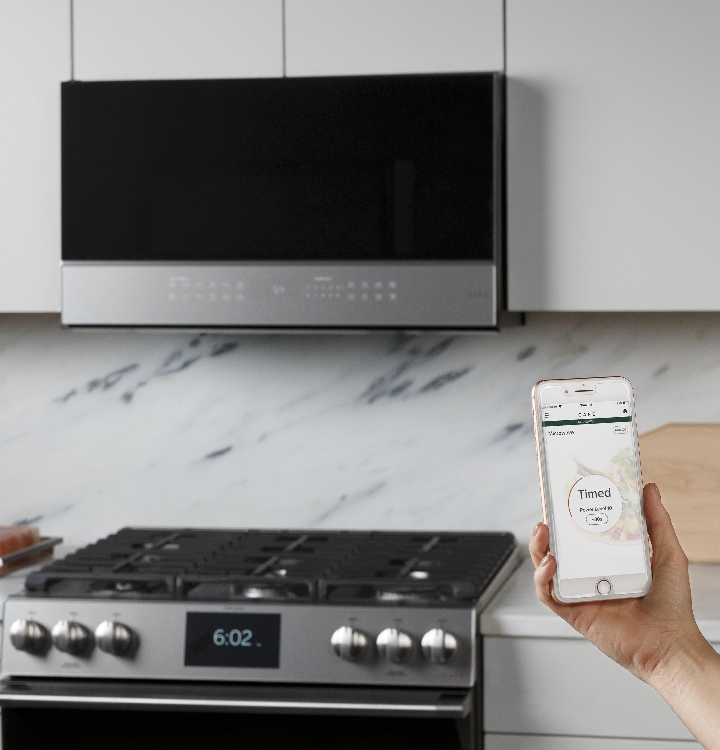 Elevate your kitchen with the Café™ 2.1 Cu. Ft. Smart Over-the-Range Microwave Oven (model CVM721M2NS5). Its contemporary Platinum Glass finish provides an easy-to-clean, modern look. With WiFi Connect, you can control the microwave using your smart device or voice commands. The Scan-to-Cook Technology allows you to prepare food items with the scan of a barcode, automatically adjusting cook settings based on package instructions. Chef Connect enhances your cooking experience by automatically activating vents and surface lights when a range element is turned on, and synchronizing your microwave and range clocks. Additional features include a steam cook button for perfectly prepared fresh vegetables and rice, sensor cooking controls that automatically adjust time and power for consistently delicious results, and a three-speed, 400-CFM venting system to remove smoke, grease, odors, and moisture from your kitchen. The easy-clean enamel interior with steam clean lets you swiftly wipe away spills and splatters, while the LED cooktop lighting illuminates your cooking surface with crisp, clear light.