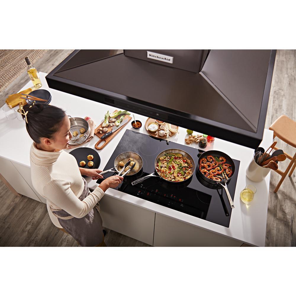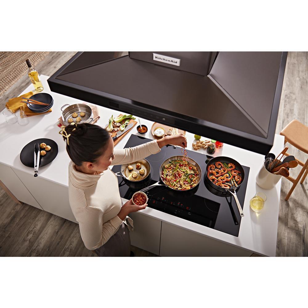 The brand KitchenAid KVIB606DBS delivers premium kitchen ventilation in a 36‑inch island-mount canopy hood designed to support cooktops up to 65,000 BTU. It features a robust 585 CFM centrifugal motor with auto speed setting and automatic turn‑on to adjust airflow as needed. The elegant design includes 4-speed electronic glass touch controls, plus Power Boost for rapid extraction. Task lighting is enhanced by four LED lights, while two halogen night lights create ambient illumination. Durable and easy to maintain, the hood incorporates removable grease filters and a refined black stainless steel finish that integrates beautifully into modern kitchens.