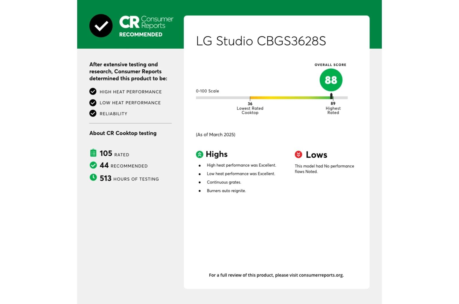 Consumer Reports rated the LG STUDIO CBGS3628S as a top-contender in heat performance and reliability. SEE REVIEW SUMMARY