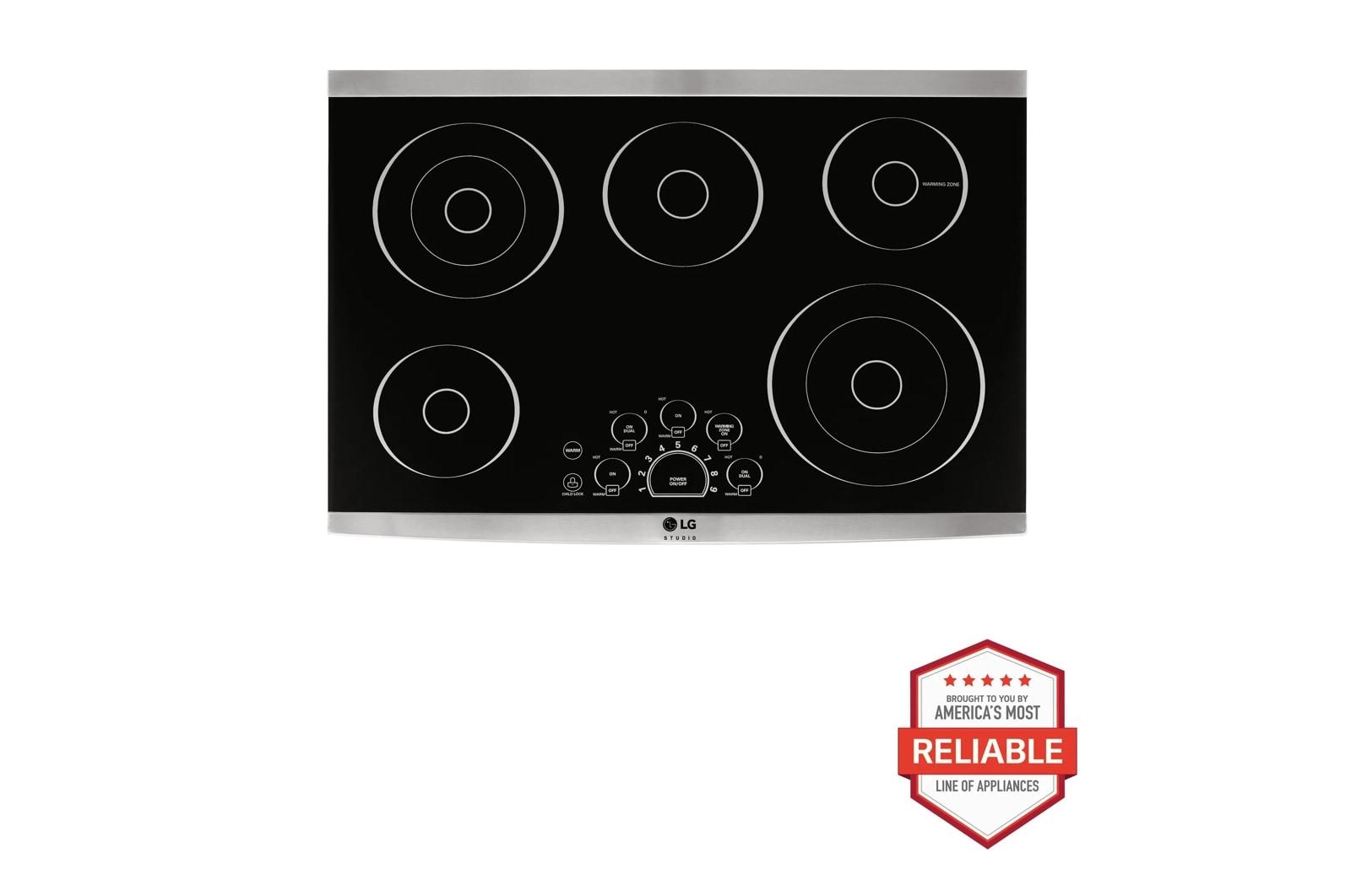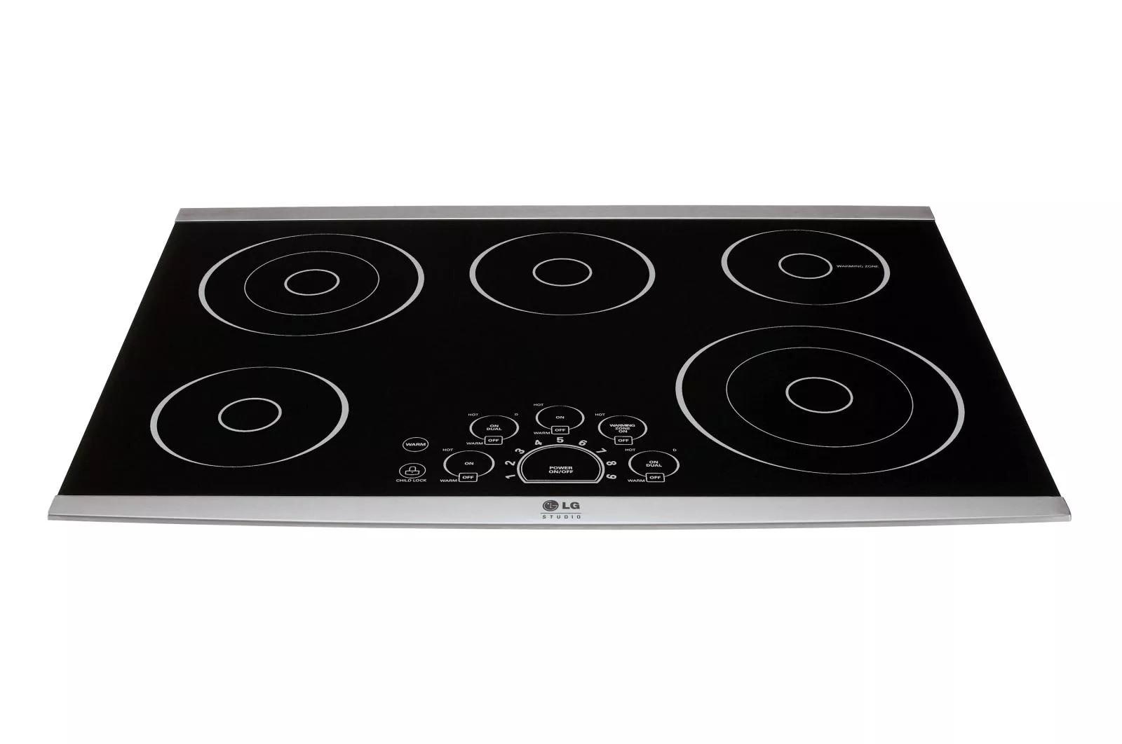The brand LG LSCE305ST is a 30-inch radiant electric cooktop built with a black ceramic glass surface and framed in stainless steel trim. It offers five heating zones, including a dual 8"/5" element, 6" warm zone, 7" center element, and 9"/6" dual element with bridge capability for large cookware. Front-center SmoothTouch™ glass controls enable intuitive operation, while safety features like hot surface indicators, auto shut-off, and child lock enhance peace of mind. ADA compliant with steady heat elements and durable construction, it is an ideal fit for modern kitchens.