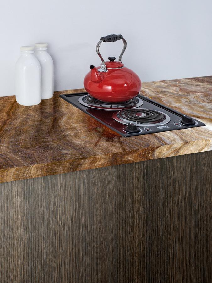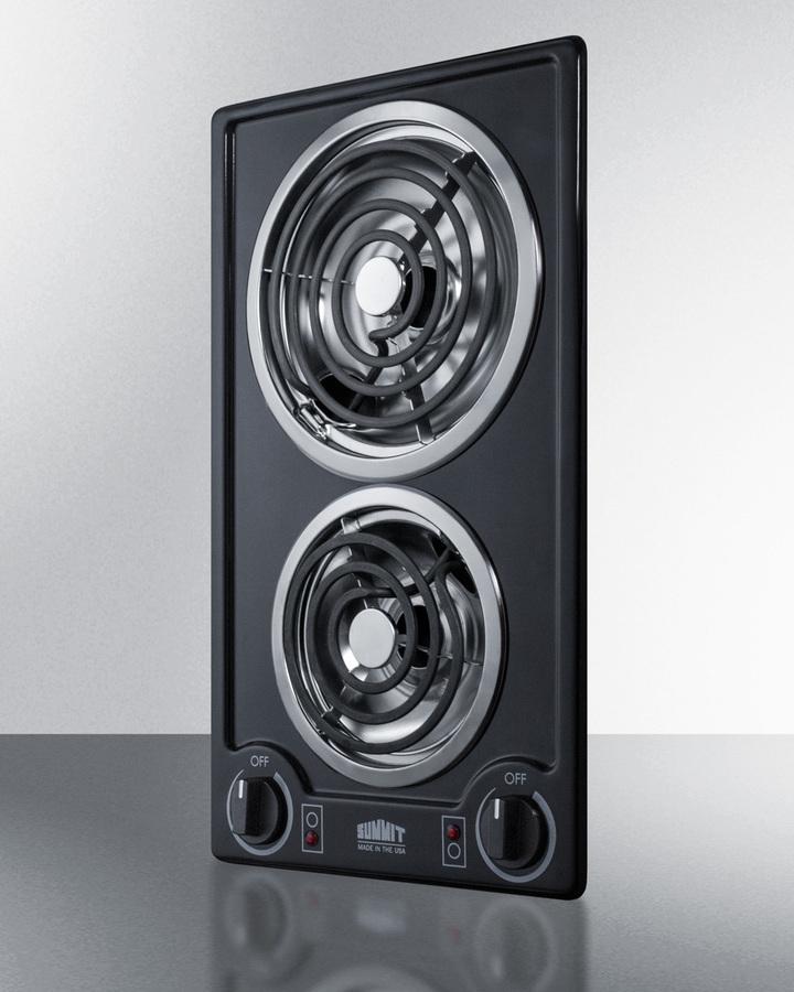 Summit offers an extensive selection of slim-fitting cooktops designed and manufactured in the USA. The CCE226BL is a 220-240V cooktop with a porcelain surface in a jet black finish. Two coil elements (6" 675W in front and 8" 950W in rear) offer durable heating that holds up to everyday use. Designed to meet the most recent UL safety standards, the elements operate at low wattage, allowing for a slow but steady heating process that will not cycle off. Each element includes a removable chrome drip pan for easier cleanup. Upfront push-to-turn knobs are simple and intuitive, with indicator lights that show which burner is in use for added safety. The recessed design helps to contain spills for a cleaner cooking experience. This cooktop is designed to fit common 11 1/8" W x 19 1/8" D counter cutouts. This unit does not ship with a power cord and must be hard-wired by a professional. Additional choices are available in 115V, as well as white and stainless steel. Browse our website for our complete selection of slim-fitting cooking appliances.