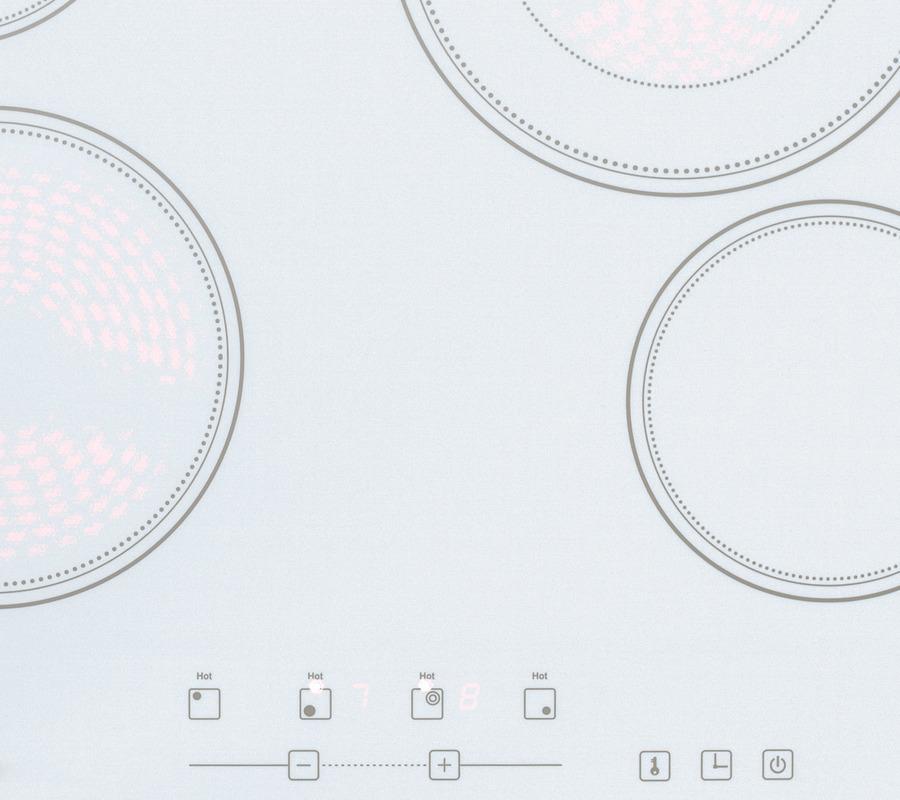 SUMMIT's collection of smooth-top radiant cooktops offers an easy-to-clean design with modern style built for smaller kitchen spaces. The CR4B23T6W is a 24" wide 230V radiant cooktop designed to fit popular 22" W x 19 1/2" D counter cutouts. The surface is made from smooth Schott ceramic glass in a classic white finish for a durable, modern look. This unit does not ship with a power cord and must be hard-wired by a professional. Unlike many other 24" wide cooktops, the CR4B23T6W includes an extra large 2200W 8" element to accommodate large cooking vessels and offer faster heating when boiling water. For added versatility, this dual zone element can also be used at a 5" diameter for smaller pots and pans. The front right and rear left 5 1/2" elements cook at 1200W, while the front left zone is 7" wide with an 1800W operation to handle larger meals. The digital touch controls are located in the front for easier accessibility, preventing users from reaching over hot burners when cooking. The temperature is easy to adjust at the touch of a button, with 9 power levels for each burner. This unit also includes a timer function that lets you program a power level and cook time (up to 99 minutes). The burner turns off automatically when the cooking duration has finished. Safety features include a child lock function, automatic shutoff after two hours, and residual heat indicators for all four elements. With its attractive design, smartly designed burner configuration, and intuitive touch controls, the CR4B23T6W brings a user-friendly cooking performance with reliable safety to small kitchen spaces.