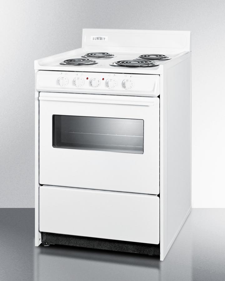 Summit Appliance offers a wide selection of American-made household ranges built for long-lasting durability in space-challenged kitchens. The WEM610W is an apartment-sized 220V electric range sized at just 24" wide, with a generous 2.92 cu.ft oven interior that can accommodate large trays. The oven window and interior light with an on/off switch make it easy to monitor your cooking without opening the door. Two adjustable oven racks are included. The waist-high broiler is located inside the oven, allowing you to switch functions without moving contents to a separate compartment on the floor. The lower drop-down storage compartment is ideal for keeping pots and pans out of the way in small kitchens. Designed to meet the most current UL safety standards, this unit features one 8" 950W and three 6" 650W coil elements. These operate at lower wattage than standard electric ranges, allowing for a slow but steady heating process that will not cycle off. Upfront push-to-turn knobs offer additional protection, ensuring users won't reach over hot burners to adjust the heat. This unit complies with ADA guidelines. The WEM610W comes in a classic white finish to suit any kitchen. It has a recessed oven door and is conveniently sized at just 24" deep for a better fit in galley in L-shaped kitchens, where every inch counts. Porcelain and steel construction help the unit hold up to years of daily use. We include an anti-tip bracket for added safety. This unit does not include a line cord (a standard 40 amp 3 or 4-prong cord can be installed by your electrician). With its classic style and quality construction, Summit's made in the USA cooking line offers reliable cooking for smaller homes. Additional choices are available in 20", 30", and 36" wide fits.