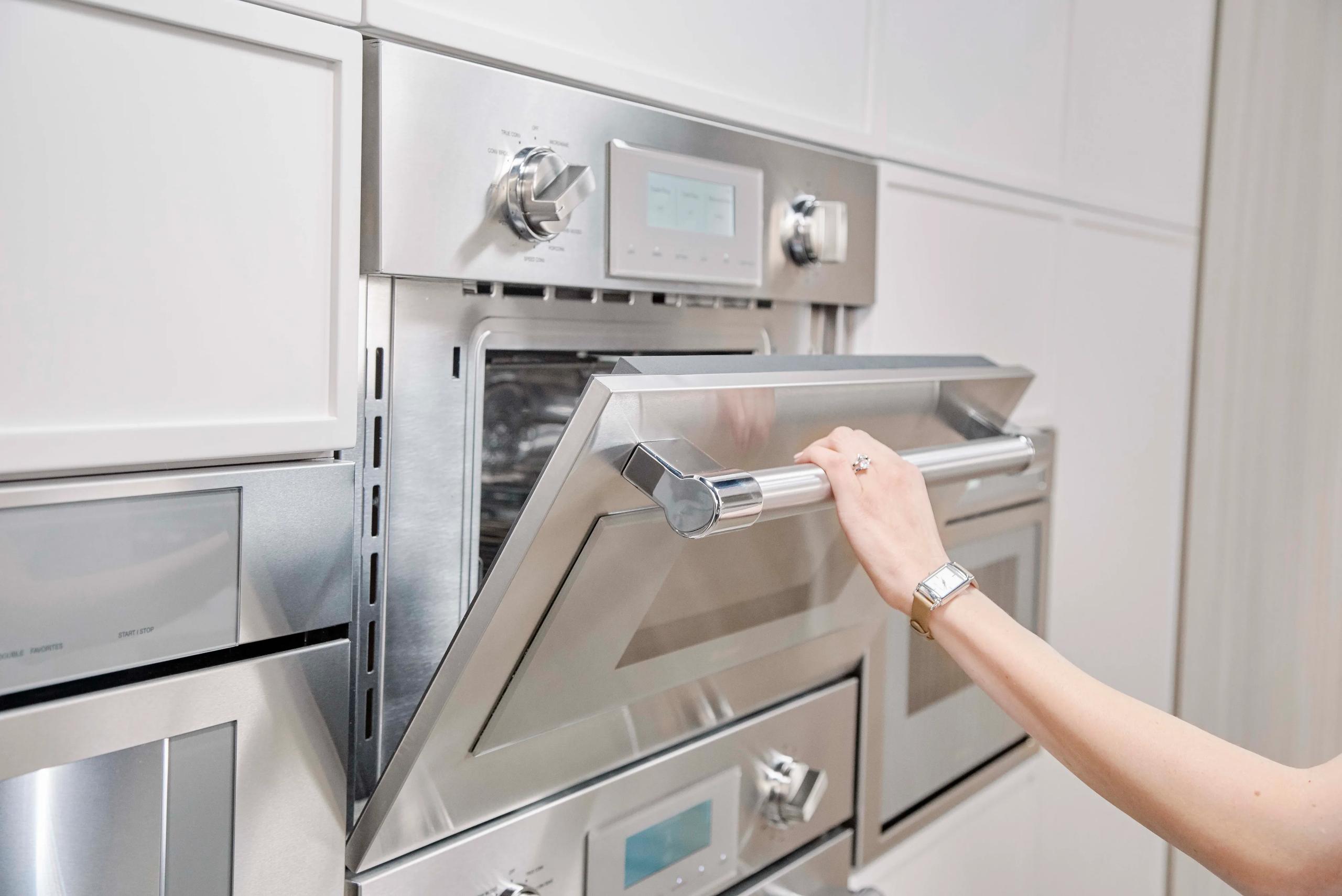 Professional style control knobs and bold brushed stainless steel handles with a touchscreen display. Part of the Professional Collection with options for standard or flush installation.