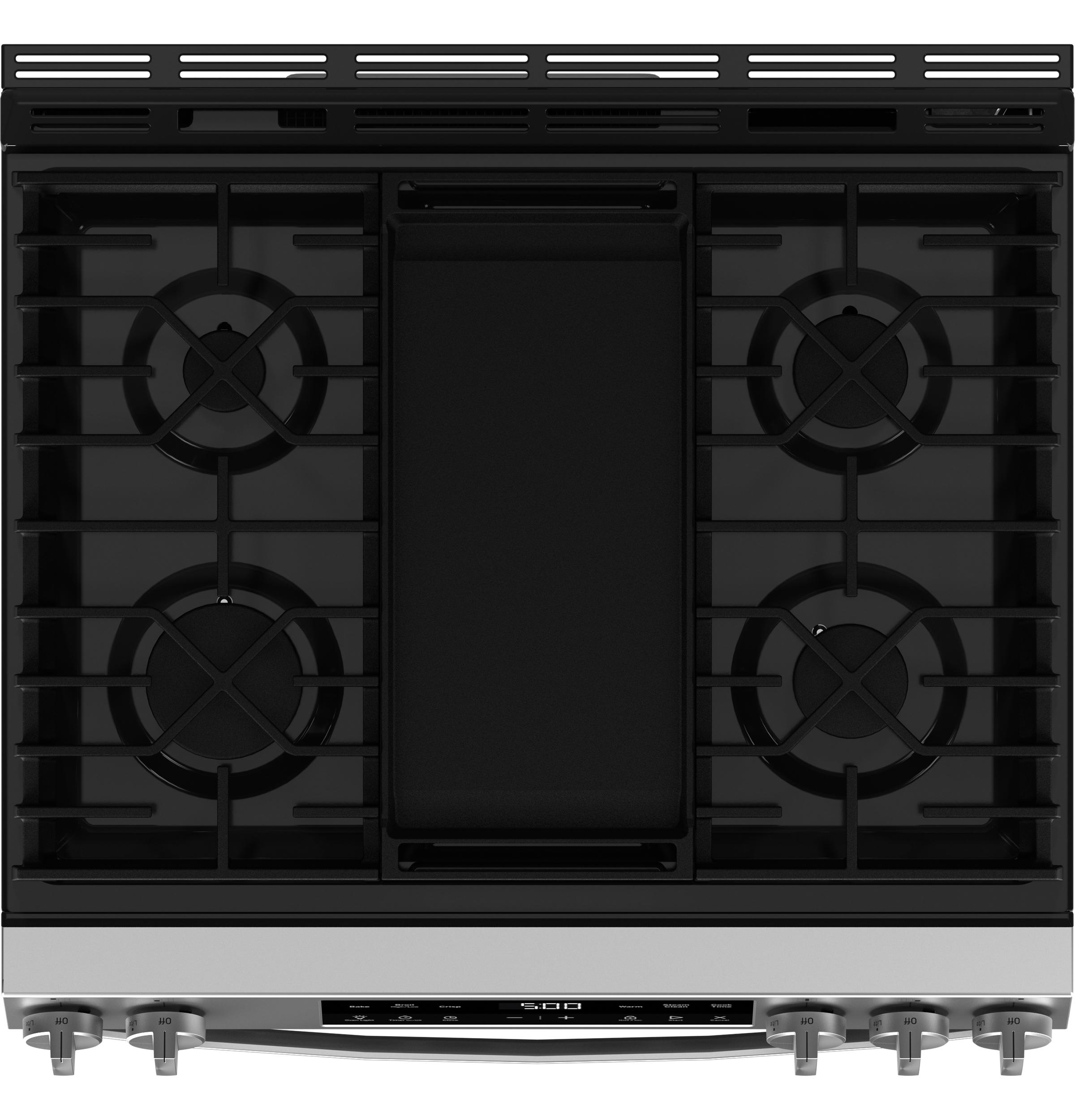 The brand GE GGS500SVSS is a 30" slide‑in front control gas range equipped with Total Convection and the convenient Crisp Mode, providing crispy, golden results without deep frying. It boasts a spacious 5.0 cu. ft. oven capacity with a hidden bake element for easier cleaning and a self-clean cycle for added convenience. Featuring five sealed burners, including a quick boil burner for fast heating, and a 12" touch display with backlit controls, this sleek fingerprint-resistant stainless steel range combines performance with user-friendly controls. Smart home integration through Alexa, Google, and SmartThings adds remote control capability, making this range a modern centerpiece for any kitchen.