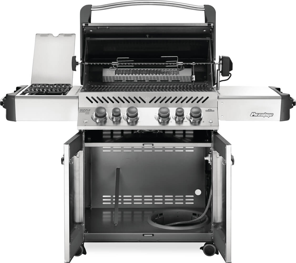 The Napoleon Prestige 500 Propane Gas Grill with Infrared Side and Rear Burners is the total grilling package; with a stunning all stainless steel hood and stainless steel construction, this cart model has the capabilities of a full outdoor kitchen. With four main burners, an infrared rear and side burner, this grill can cook meals using eight unique cooking styles. Grill for a crowd with a capacity for up to thirty hamburgers, and up to eight more on the side burner. You'll know it's a Napoleon with the Iconic WAVE cooking grids for those distinctive sear marks. Not just durable on the outside; under the lid, is the same quality stainless steel used for the tube burners, dual-level sear plates and cooking grids. Seven stainless steel sear plates provide extra surface area for any drippings from your food to vaporize, avoiding flare-ups. Never leave your barbecue on again as all the Prestige series grills come with the SafetyGlow feature where the control knobs glow red when the burner is on. Enjoy evenly cooked restaurant style meals with the rear infrared burner and rotisserie.