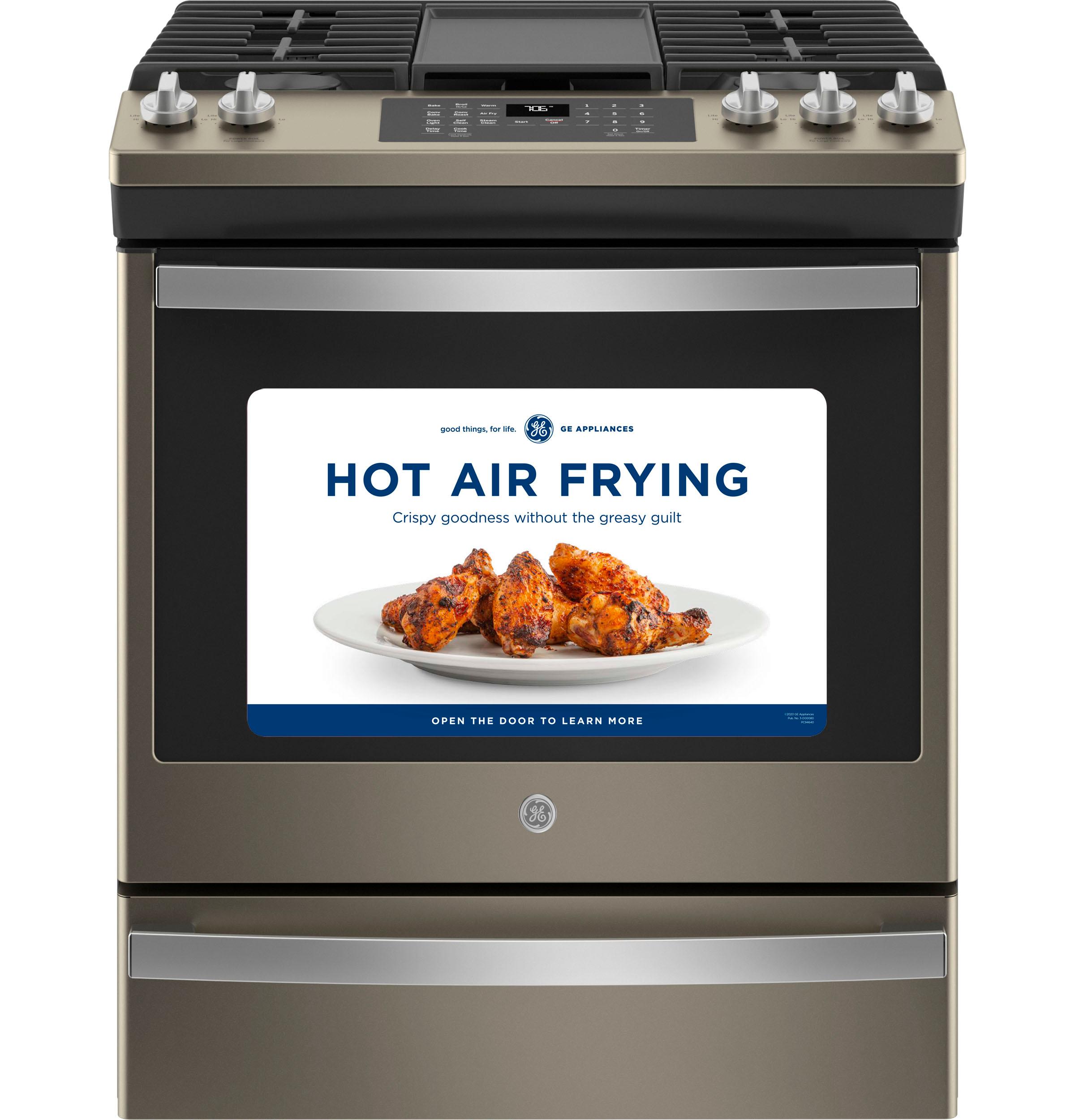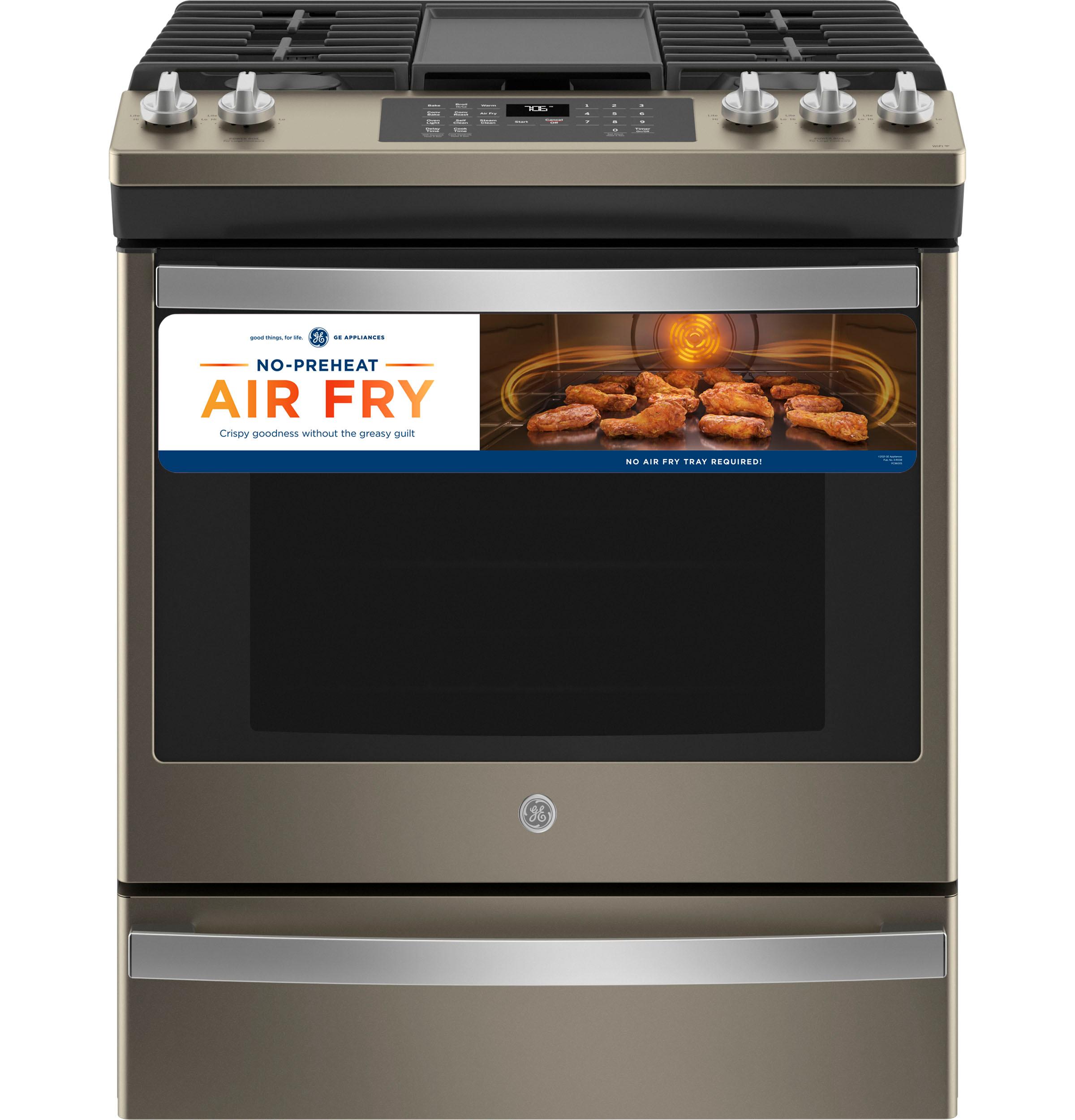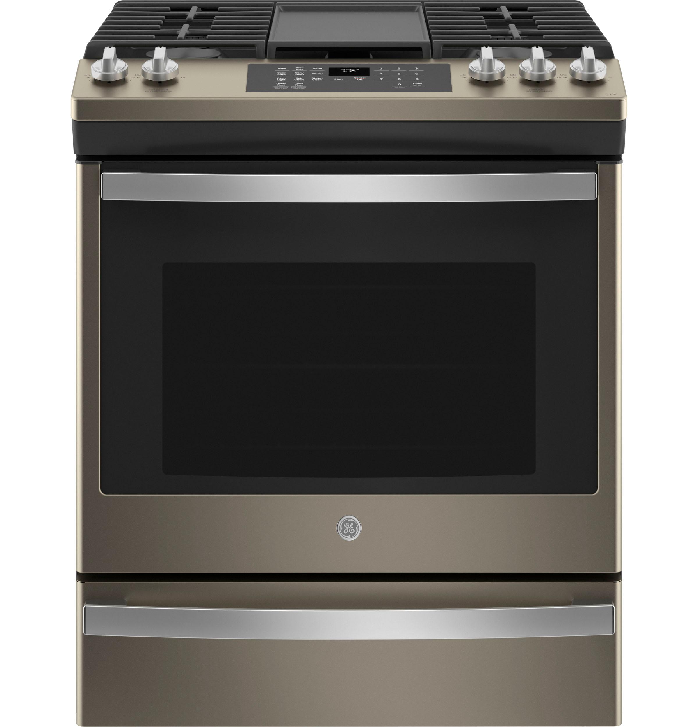 The brand GE JGS760EPES combines modern style and performance in this 30-inch slide-in gas range with a striking slate finish. Designed for flexibility, it features a powerful 21,000 BTU tri-ring burner for precise simmering and intense searing, along with an edge-to-edge cooktop that maximizes usable cooking space. The included integrated non-stick griddle offers a convenient surface for pancakes, grilled sandwiches, and more. The spacious convection oven ensures even baking results with faster cook times, while self-clean with steam clean option simplifies maintenance. With front controls for a built-in look, continuous cast iron grates for easy pan movement, and a storage drawer for added functionality, this range delivers premium performance in a stylish, slide-in design.
