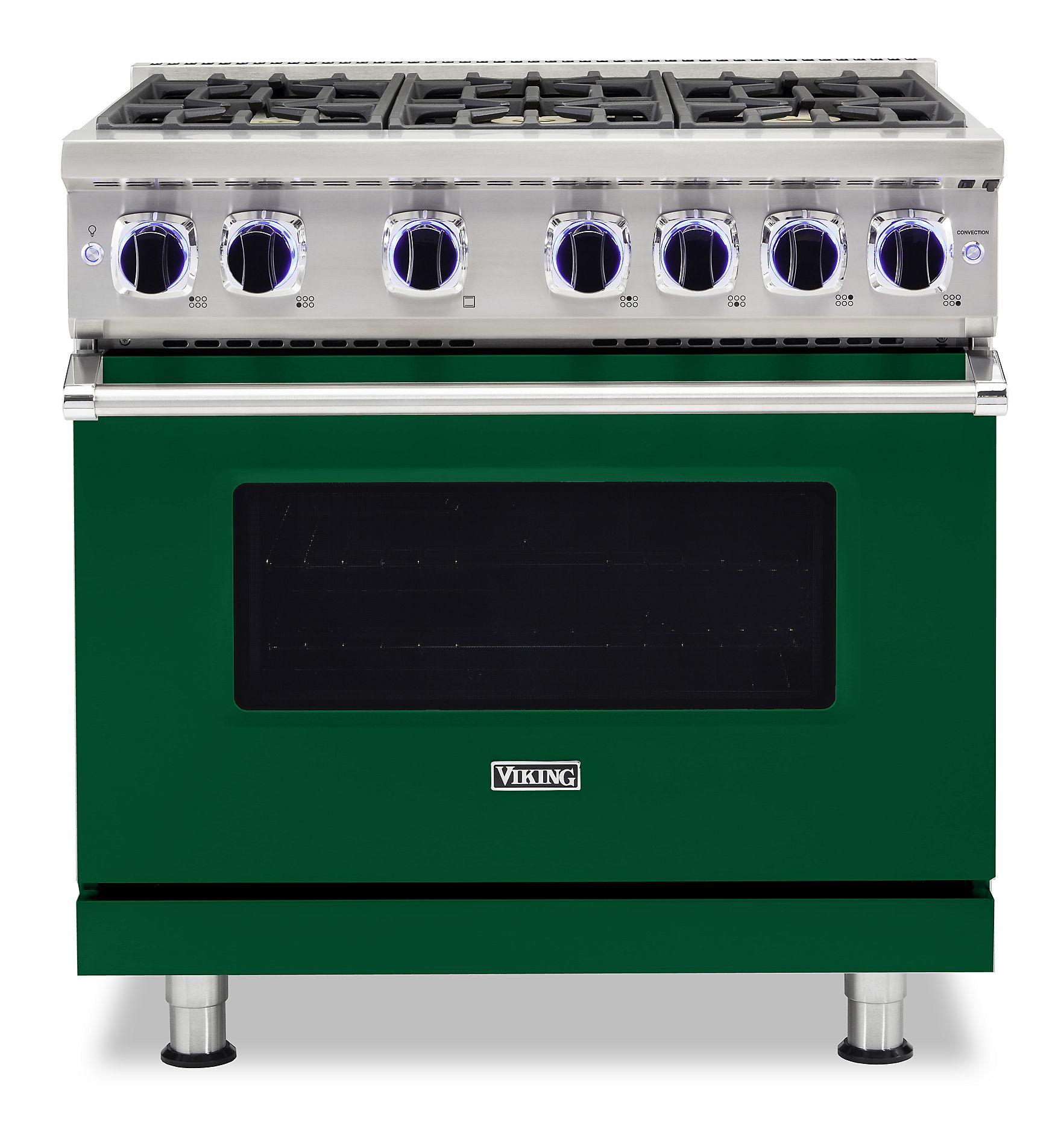 The Viking VGR73626BIVLP is a 36-inch freestanding sealed burner gas range from Viking's 7 Series, designed to deliver professional-grade performance in a residential setting. This model, finished in a distinctive Ivy hue, features six high-performance burners, including three 23,000 BTU Elevation™ burners for rapid boiling and searing, two 15,000 BTU burners for versatile cooking, and one 8,000 BTU burner for precise simmering. The SureSpark™ ignition system ensures reliable ignition and automatic re-ignition if a flame is extinguished. The spacious 5.1 cu. ft. convection oven utilizes a 30,000 BTU U-shaped burner and ProFlow™ Convection Air Baffle to provide even heat distribution, while the Gourmet-Glo™ infrared broiler delivers intense searing heat for broiling applications. Additional features include continuous porcelainized cast-iron grates for easy movement of cookware, halogen oven lighting for enhanced visibility, and six cooking functions to accommodate various cooking techniques. The VGR73626BIVLP combines robust functionality with a bold aesthetic, making it a standout addition to any kitchen.
