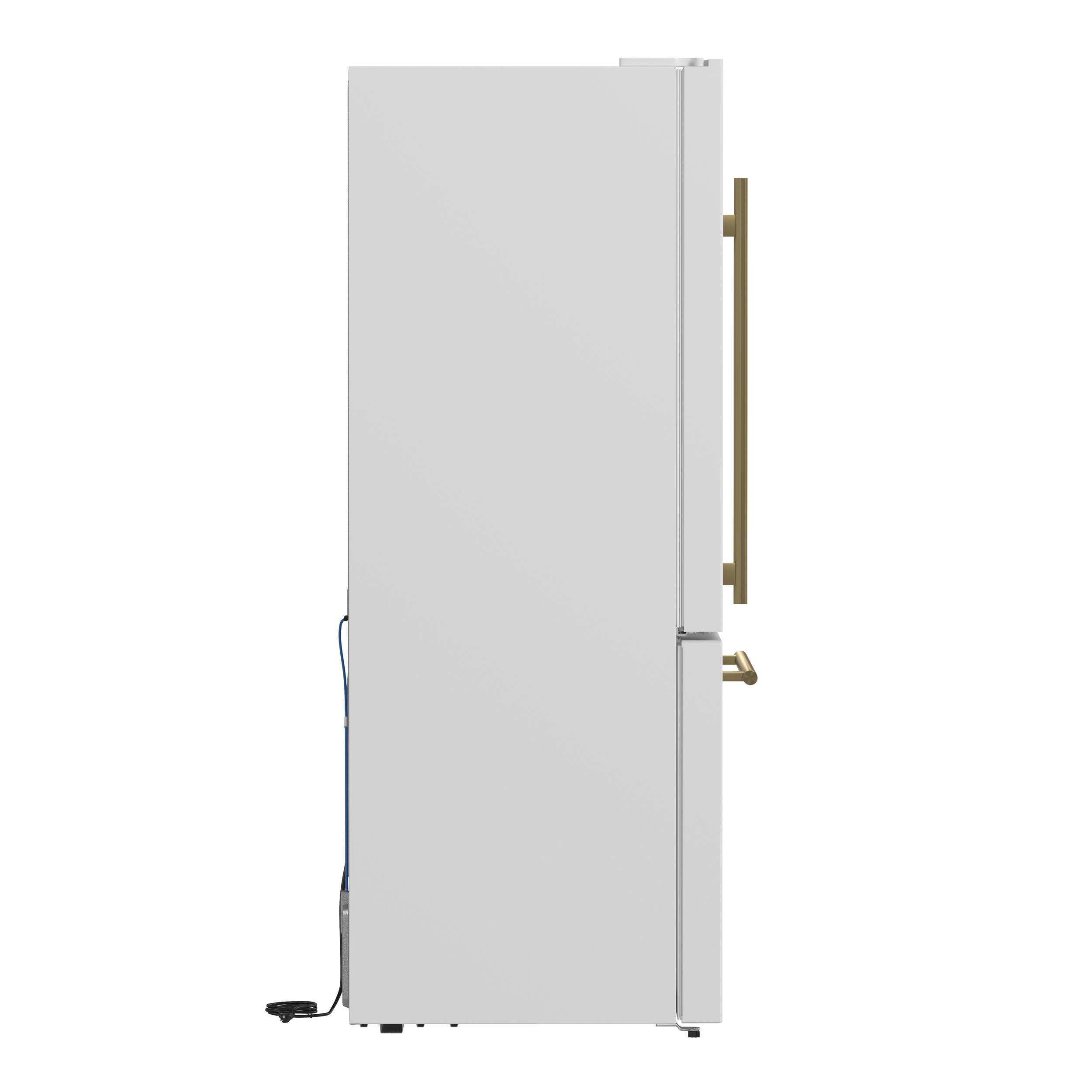 The Forno Espresso Milano 31" Bottom Freezer Refrigerator with Ice Maker offers 17.2 cu. ft. of efficient storage in a sleek, space-saving design. Featuring a crisp white finish and elegant antique brass handles, it adds a sophisticated touch to any kitchen. Two full-width freezer drawers provide easy organization for frozen foods, while digital touch controls ensure accurate temperature management. Super Cool and Super Freeze functions help lock in freshness faster. Energy Star Certified for efficiency, it also includes high-efficiency LED lighting to help reduce food spoilage. Adjustable shelves, door bins, and a full-width drawer make customizing storage simple and convenient.