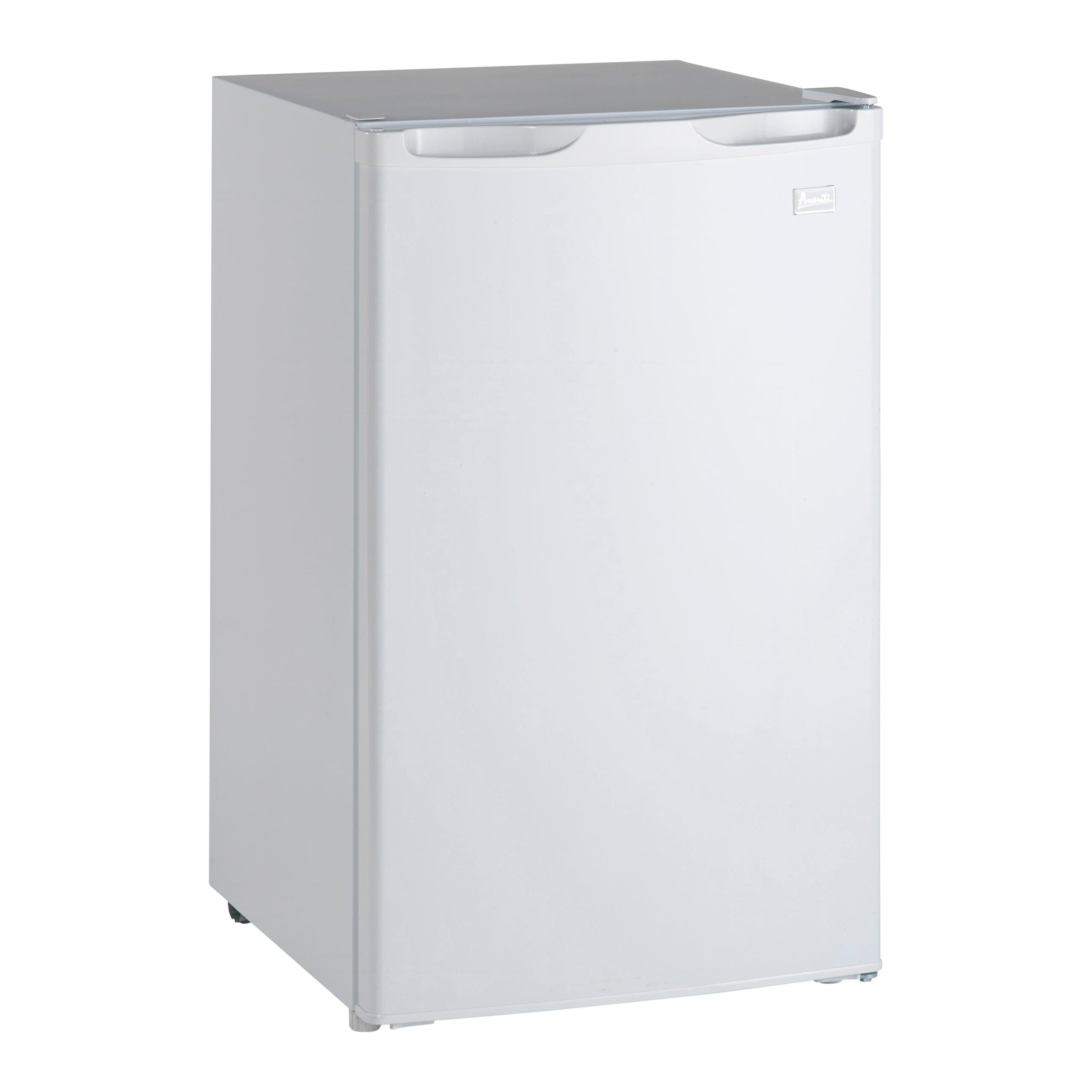Keep your snacks and favorite beverages close by in the compact, 4.4 cubic foot refrigerator from Avanti. The perfect mini fridge for the office, dorm, man cave, she-shed, bar, bedroom, or anywhere you need a little extra refrigerator space. The 1 full-width and 2 half-width door storage bins can hold up to 6 standard size cans, and the lower bin storage can hold a gallon-sized bottle. Use the adjustable slide-out glass shelves to arrange salads, fruits, snacks, and other foods for easy access throughout the day. This compact fridge features manual defrost, so your food and beverages remain fresh and cold. Select the right settings for your items with the adjustable thermostat control with push-button to defrost mode.