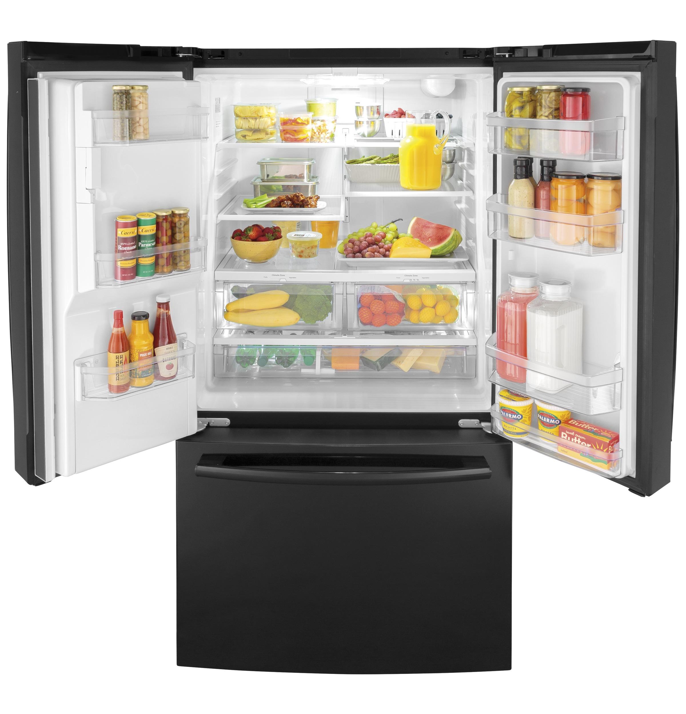 The brand GE GFE26JGMBB offers a 25.8 cubic feet French-door refrigerator with a hands-free Autofill water dispenser that quickly fills containers with a simple voice command or motion. It boasts a fingerprint-resistant black stainless steel finish for easy maintenance and a modern look. This model includes Adjustable Spillproof Glass Shelves to tailor storage space, a full-width drawer ideal for deli and produce, and LED lighting for clear visibility. The refrigerator also features temperature-controlled drawers and a door alarm to ensure food stays fresh and energy efficient operation to reduce utility costs.