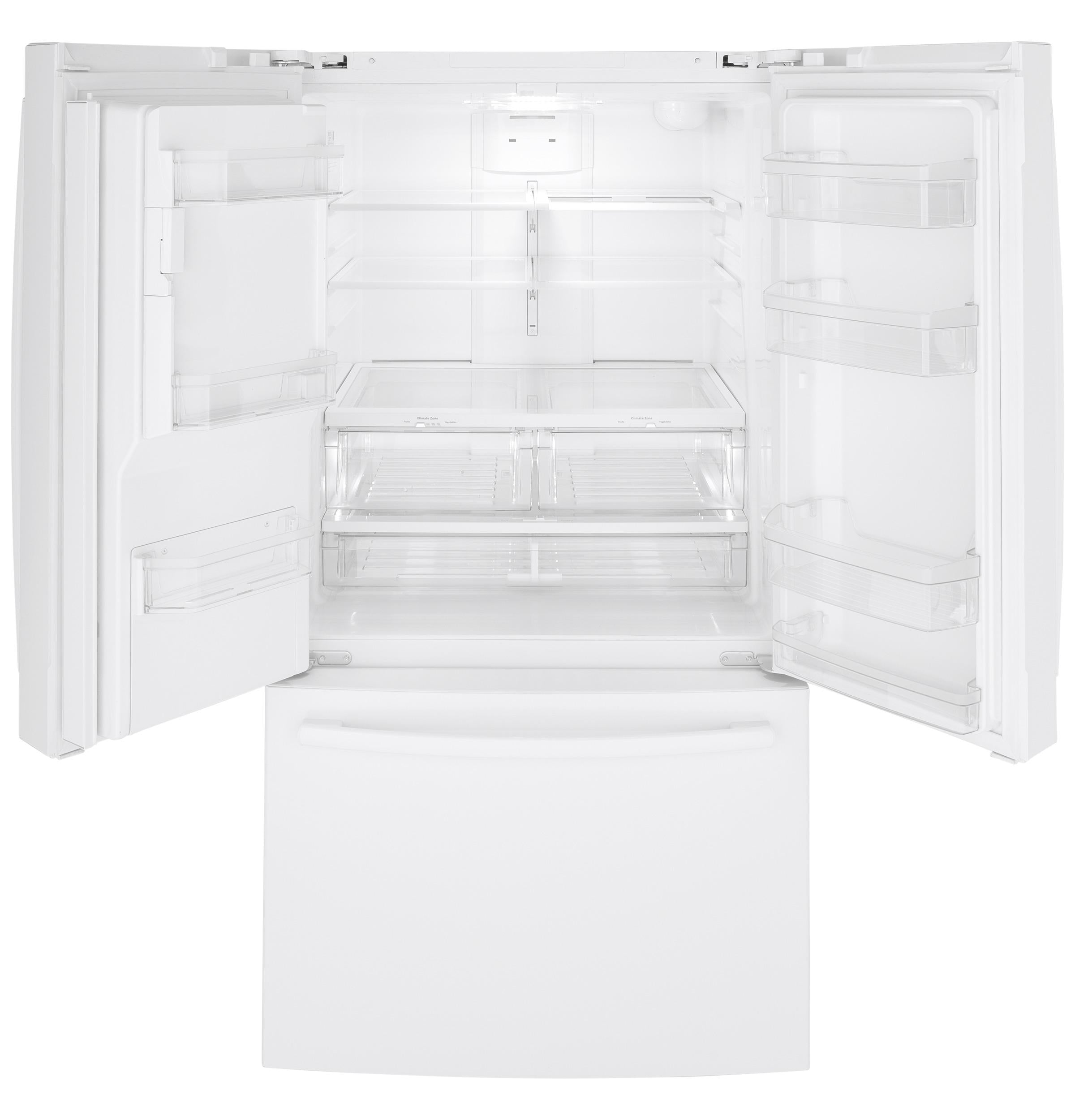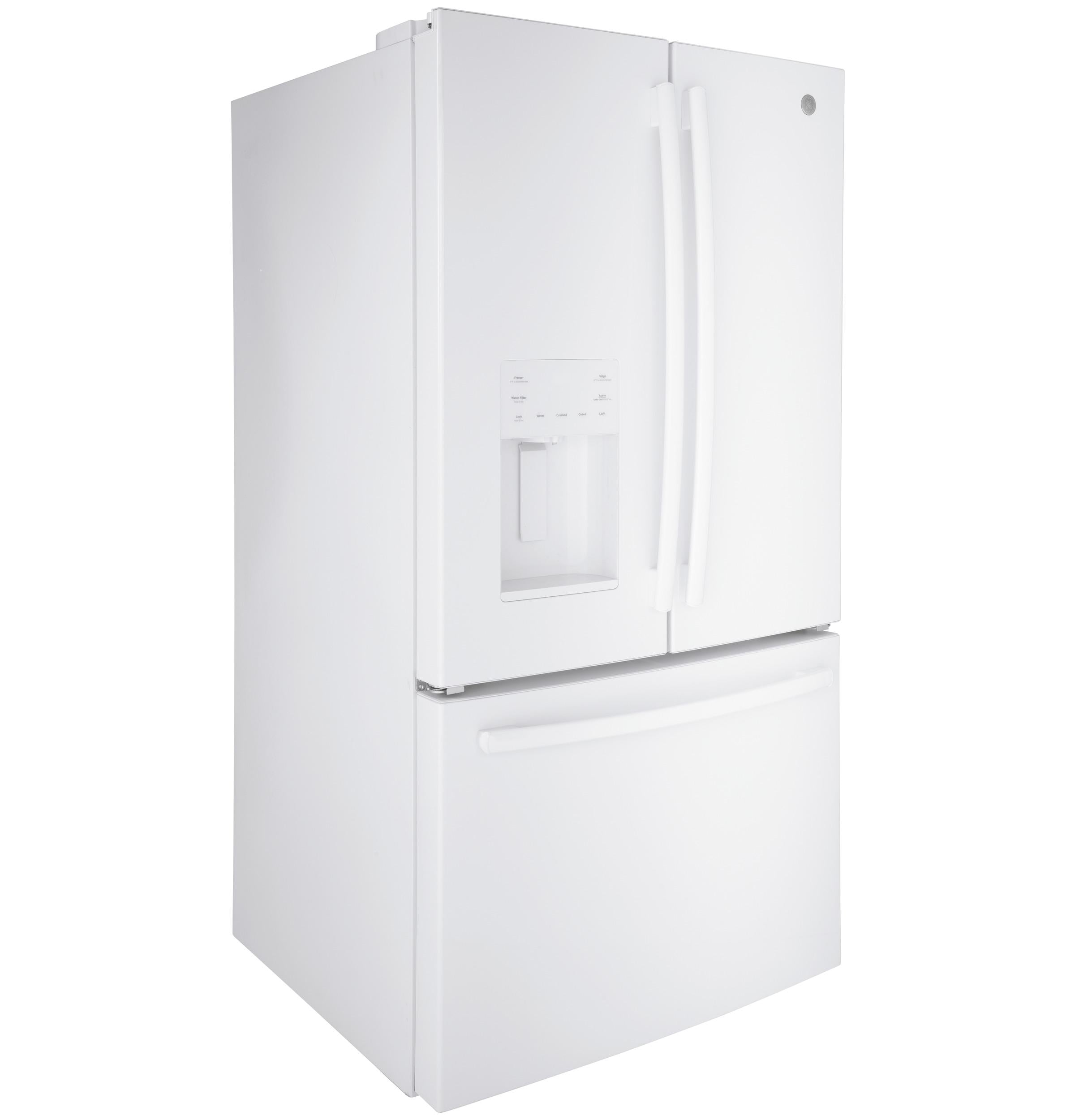 The brand GE GFE26JGMWW provides a premium French‑door refrigerator with a total 25.7 cu. ft. capacity (17.5 cu. ft. fresh‑food, 8.17 cu. ft. freezer) :contentReference[oaicite:0]{index=0}. Equipped with a space‑saving door icemaker, external dispenser for cubed/crushed ice and chilled water, and external electronic temperature controls (with child lock and door alarm), this model combines convenience and performance :contentReference[oaicite:1]{index=1}. It also features LED interior lighting, spill‑proof glass shelves, two humidity‑controlled crispers, a full‑width deli drawer, a Quick‑Space slide‑out shelf, and a Turbo‑Cool setting to maintain freshness after frequent openings :contentReference[oaicite:2]{index=2}. The exterior is finished in contoured white steel with hidden hinges, while the energy‑efficient design earned ENERGY STAR® certification :contentReference[oaicite:3]{index=3}.