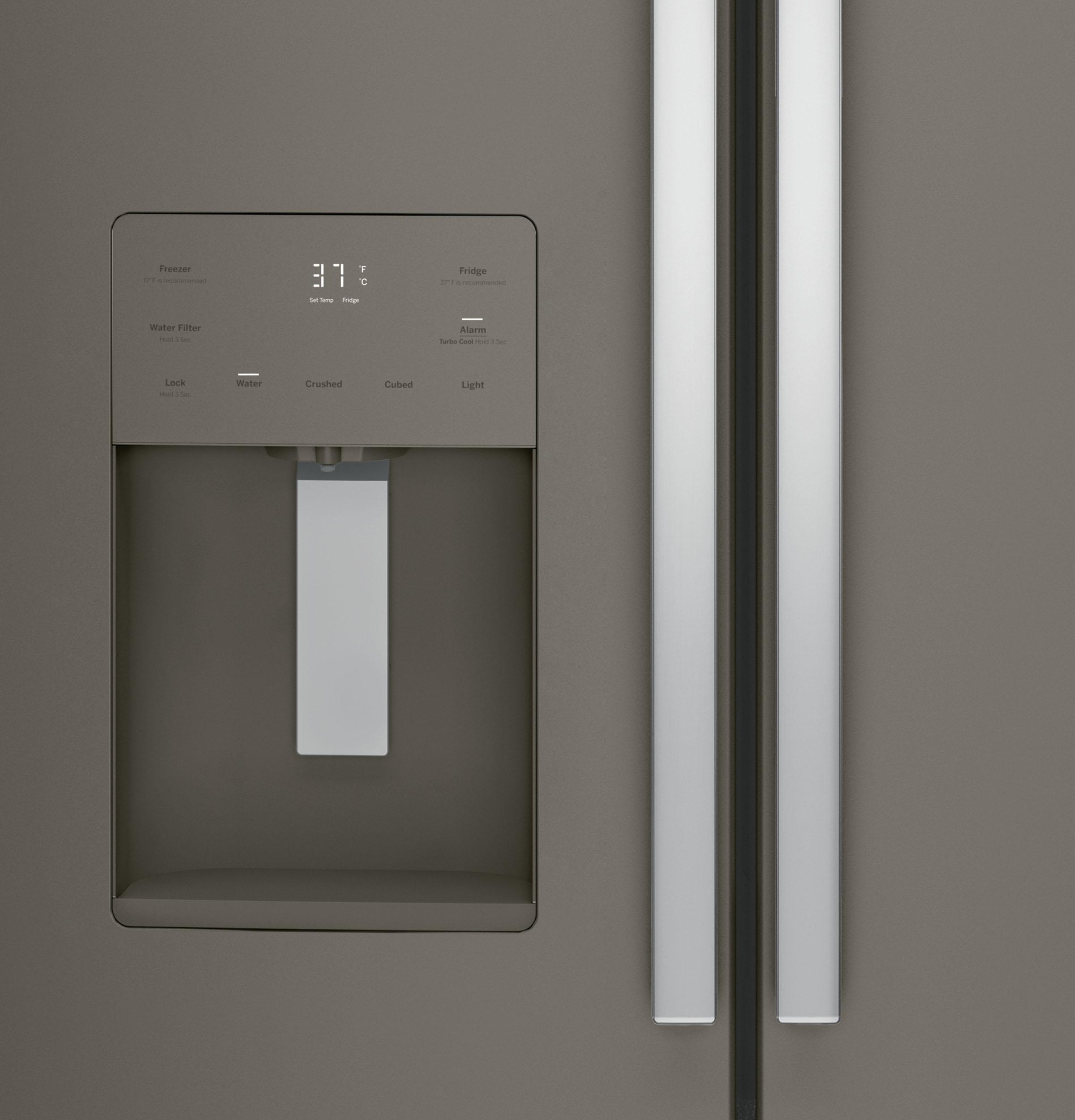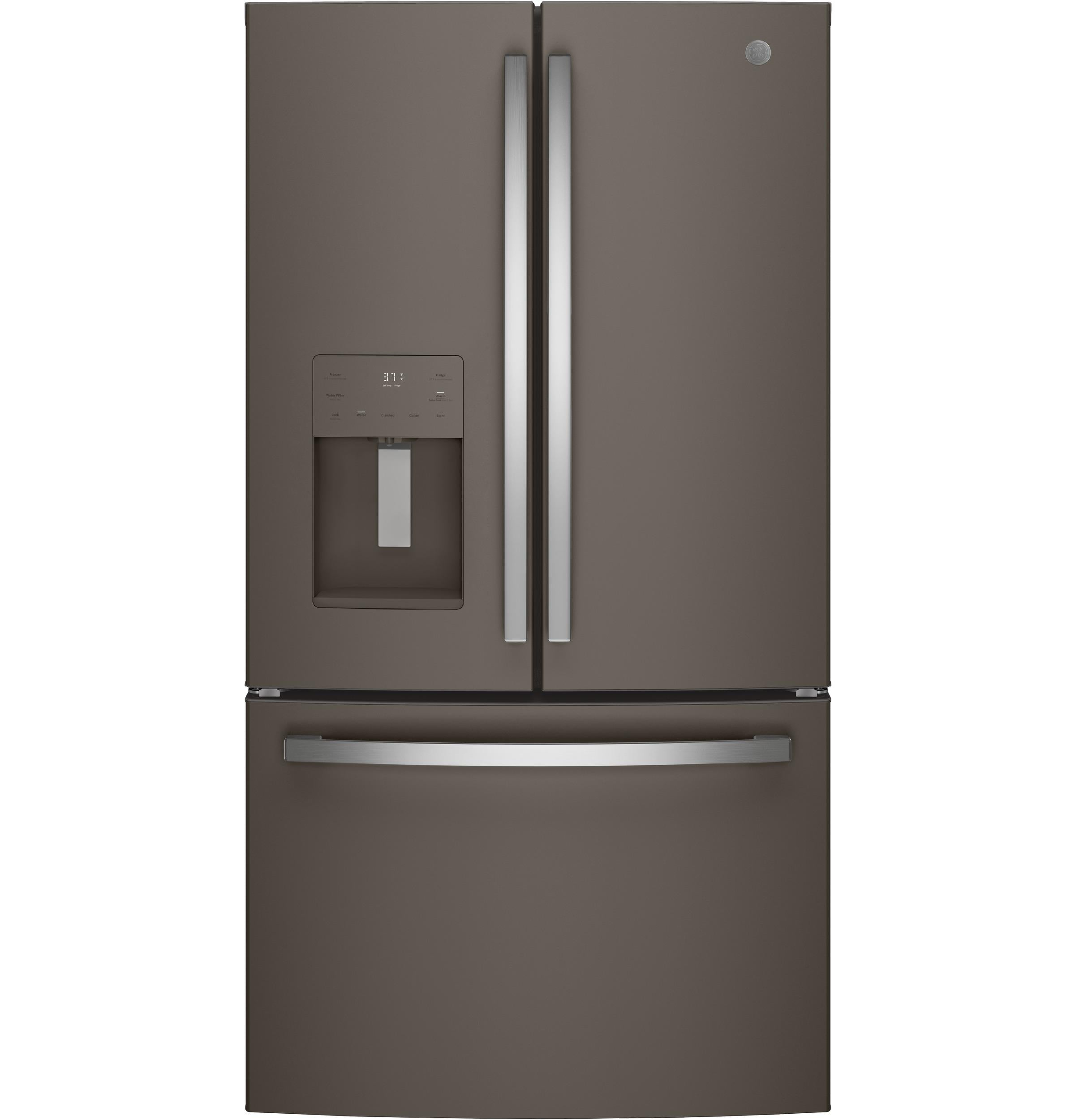 The GE GFE26JMMES is a 25.6 cu. ft. French door refrigerator engineered to combine style, functionality, and convenience. Its fingerprint-resistant slate finish keeps your kitchen looking clean and modern, while the space-saving icemaker located in the door frees up valuable shelf space inside. Bright and energy-efficient LED lighting illuminates every corner, making it easy to find items. The refrigerator includes spill-proof shelves designed to contain spills and simplify cleanup, plus a quick space shelf that slides to create extra space for tall items. Advanced water filtration provides clean, fresh-tasting water and ice. Additionally, the model features enhanced Sabbath mode for compliance with religious observances. With spacious storage and thoughtful design, this refrigerator fits perfectly in contemporary kitchens.