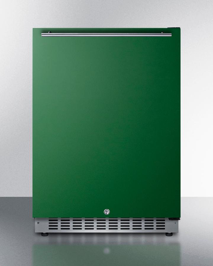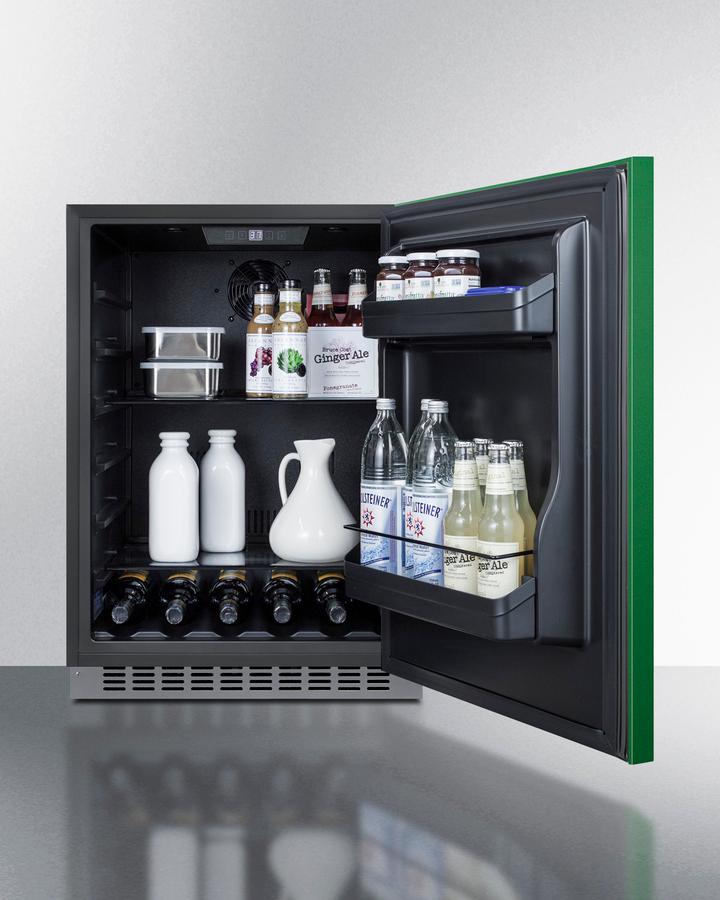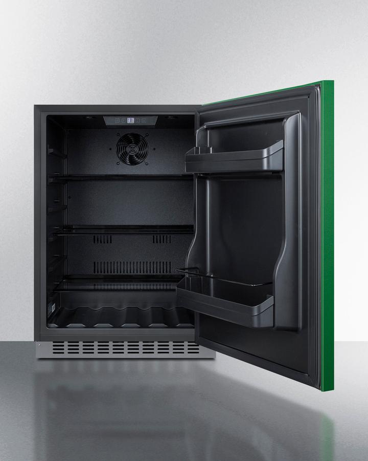 Make a statement under the counter with Summit's exclusive collection of boldly colored refrigerators and matching freezers. Model AL54G is a 24" wide refrigerator sized at just 32" high for easy installation under lower ADA compliant counters. The front-breathing cooling system allows built-in use, while the fully finished black cabinet also enables freestanding applications. The door finish comes in a striking emerald green, with a sleek horizontally mounted stainless steel handle and matching stainless steel kickplate to complete the unique look. Inside, the AL54G utilizes frost-free operation with fan-forced cooling to ensure low maintenance and even temperature distribution. Recessed LED lighting offers an attractive yet efficient look. The digital thermostat makes it easy to manage the interior temperature. This unit includes adjustable glass shelves for flexible, spill-proof storage and two large door racks ideal for keeping condiments in easy reach. The floor is specially slotted to hold bottles in place. An open door alarm and high temperature alarm audibly warn if stored items are being exposed. An optional Sabbath mode setting lets you disable some of the electrical elements during periods of observance. Additional features include a factory-installed lock for optional security, user-reversible door swing to best fit your space, right angle plug to save on depth, and sealed rear to ensure easier cleaning. The AL54G can be paired with the ALFZ53G frost-free freezer to create a matching undercounter ADA compliant set. Additional colors are available, including saffron gold, cobalt blue, and lavender. Browse the full Summit selection to find the perfect addition to your kitchen.