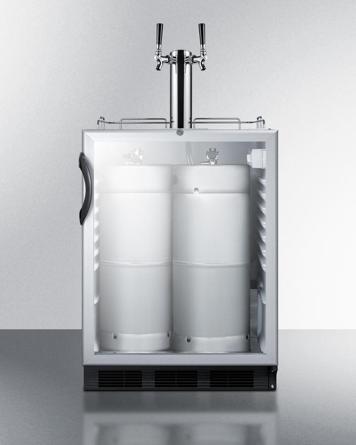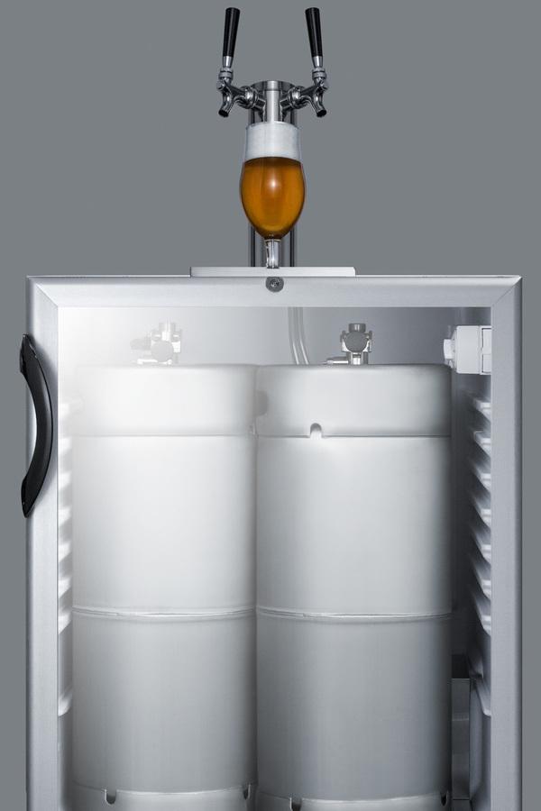 Summit Commercial brings unique appliance choices to ADA compliant settings with a new line of commercial beer dispensers made in Europe. Sized at 32 inches high, the SBC56GBIADA is designed to fit under lower ADA compliant counters. The front-breathing design allows built-in installation, while the fully finished black cabinet also enables freestanding use. This unit features a user-reversible double pane tempered glass door for a full display of the interior. A factory-installed lock is conveniently located towards the top of the door for added security. We include a guard rail (ships uninstalled) and removable two-piece stainless steel drip tray for cleaner service. The SBC56GBIADA ships with a complete Sankey American dual tap kit complete with a draft tower, regulator, 5 lb. CO2 tank, and all the equipment you need to serve beer on tap. Inside, the SBC56GBIADA is designed to hold two 1/6 (sixtel) kegs (note: interior does not accommodate a standard half barrel). Automatic defrost ensures easy user maintenance, with a seamless interior for easier cleaning. The stainless steel floor offers added durability when loading kegs. This unit includes an interior light with an on/off rocker switch and a dial thermostat for easy and intuitive temperature management. A CO2 tank bracket is located inside, allowing you to keep the tank inside and save on exterior depth. The SBC56GBIADA is ETL-S listed to NSF-7 commercial standards. Additional ADA compliant kegerator choices are available with panel-ready or glass doors. Browse our complete line for more choices.