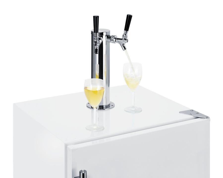 Summit Commercial brings unique appliance choices to ADA compliant settings with a new line of commercial wine dispensers made in Europe. Sized at 32 inches high, the SBC58WHBIADAWKDTWIN is designed to fit under lower ADA compliant counters. The front-breathing design allows built-in installation, while the fully finished cabinet also enables freestanding use. This unit comes in a clean white finish accented by a stainless steel kickplate and pro style handle. We include a removable two-piece stainless steel drip tray for cleaner service. The SBC58WHBIADAWKDTWIN ships with a complete Sankey American dual tap kit complete with a draft tower, 5 lb. nitrogen/CO2 tank and regulator, and all the equipment you need to serve white wine on tap. Inside, the SBC58WHBIADAWKDTWIN is designed to hold two 1/6 (sixtel) kegs (note: interior does not accommodate a standard half barrel). Automatic defrost ensures easy user maintenance, with a seamless interior for easier cleaning. The stainless steel floor offers added durability when loading kegs. This unit includes an interior light with an on/off rocker switch and a dial thermostat for easy and intuitive temperature management. A tank bracket is located inside, allowing you to keep the tank in the unit and save on exterior depth. The SBC58WHBIADAWKDTWIN is ETL-S listed to NSF-7 commercial standards. Additional ADA compliant European kegerators are available with stainless steel, panel-ready, or glass doors. Browse our complete line for more choices.