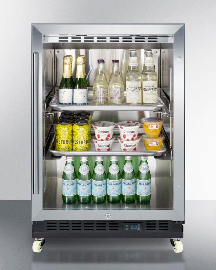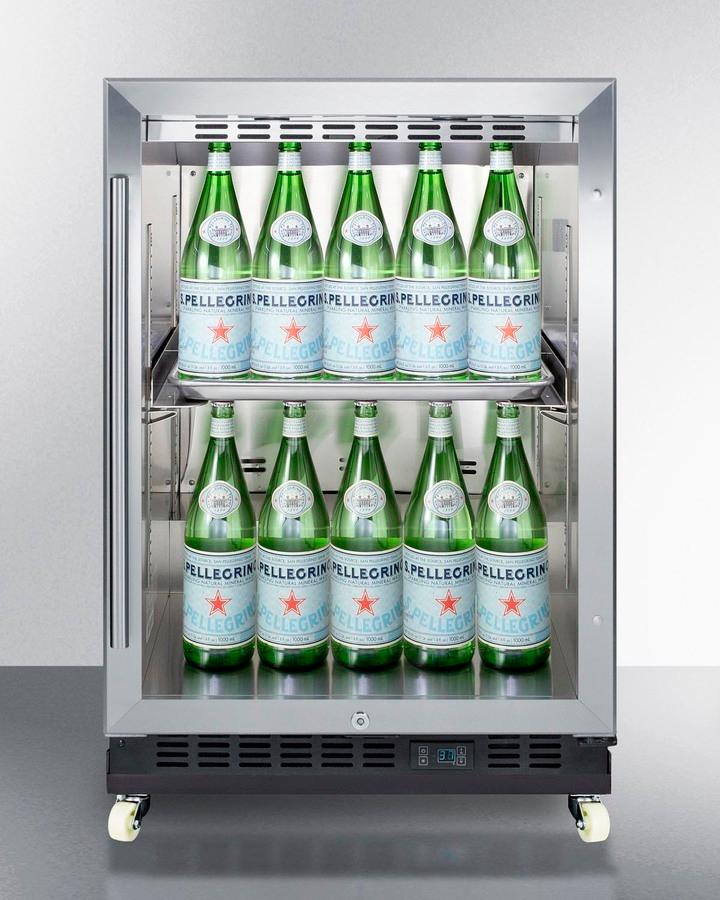 Summit Commercial's line of mini reach-in refrigerators brings versatile convenience to new dining setups, with stainless steel construction for lasting durability and factory-installed dollys to ensure easy portability. The SCR610BLRI comes in an easy-fitting 24" footprint, with a front-breathing design that can be built-in under counters or used freestanding. The reversible double pane tempered glass door includes a professional handle and a factory-installed lock, with stainless steel door trim to help highlight stored products. This unit comes pre-installed on a dolly with four 3" casters for easy mobility, perfect for restaurants and bars. The dolly can also be removed and reattached as needed. A digital thermostat is located in the kickplate for easy temperature management. Inside, the SCR610BLRI utilizes low maintenance automatic defrost operation with an internal fan to ensure even temperature distribution. Its reach-in design allows convenient user access to the interior, with three adjustable U-shaped steel tray holders that can be rearranged on cantilevered clips to accommodate a variety of sizes. This unit comes with three aluminum half-sheet pans, ideal for storing beverages and other sealed items. Three chrome shelves are also included for user convenience. Recessed LED lighting offers the perfect display conditions inside the durable and easy-to-clean stainless steel interior. High temperature and open door alarms offer added protection. The SCR610BLRI is ETL-S listed to NSF-7 for use in commercial settings and is ENERGY STAR certified as a commercial refrigerator. Its reach-in design makes it a great choice for bringing flexible, portable, and convenient beverage storage to commercial settings. For this unit with a solid door, see the SCR610BLSDRI.