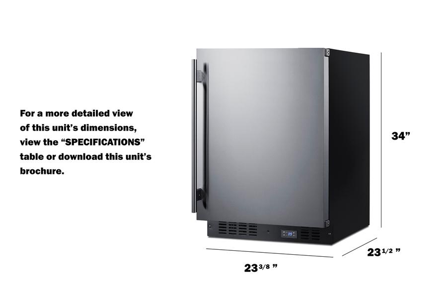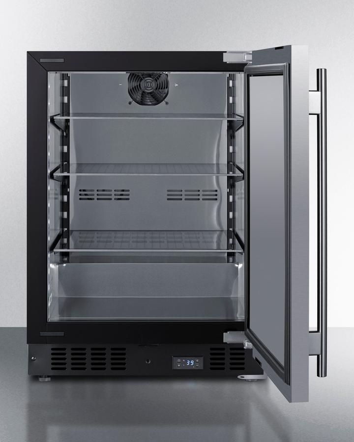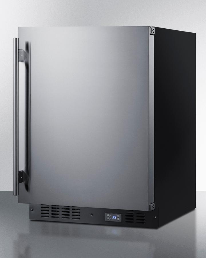 Summit Commercial's extensive lineup of beverage centers and refrigerators offers the perfect storage conditions for restaurants and other foodservice establishments. The SCR610BLSD comes in an easy-fitting 24" footprint, with a front-breathing design that can be built-in under counters or used freestanding. The reversible door includes a professional handle, fully articulating European style hinge, and factory installed lock. A digital thermostat is located in the kickplate for easy temperature management. Inside, the SCR610BLSD utilizes low maintenance automatic defrost operation with an internal fan to ensure even temperature distribution. Recessed LED lighting offers the perfect display conditions inside the durable and easy-to-clean stainless steel interior. This unit includes three cantilevered chrome shelves to ensure flexible storage that accommodates any item size. The interior is taller than many refrigerators in its class, allowing the unit to easily store two rows of 12" high bottles. High temperature and open door alarms offer added protection in busy commercial settings. The SCR610BLSD is ETL-S listed to NSF-7 for use in commercial settings. For this unit with a glass door, see the SCR610BL.