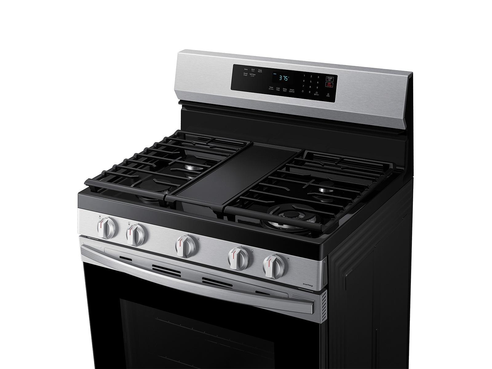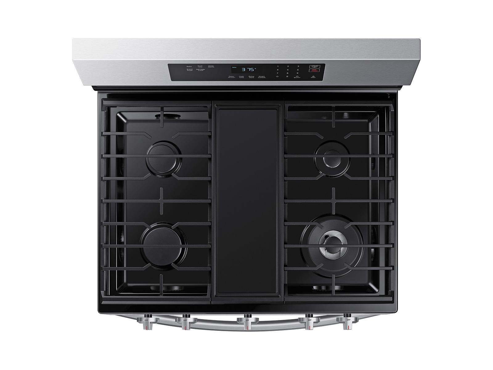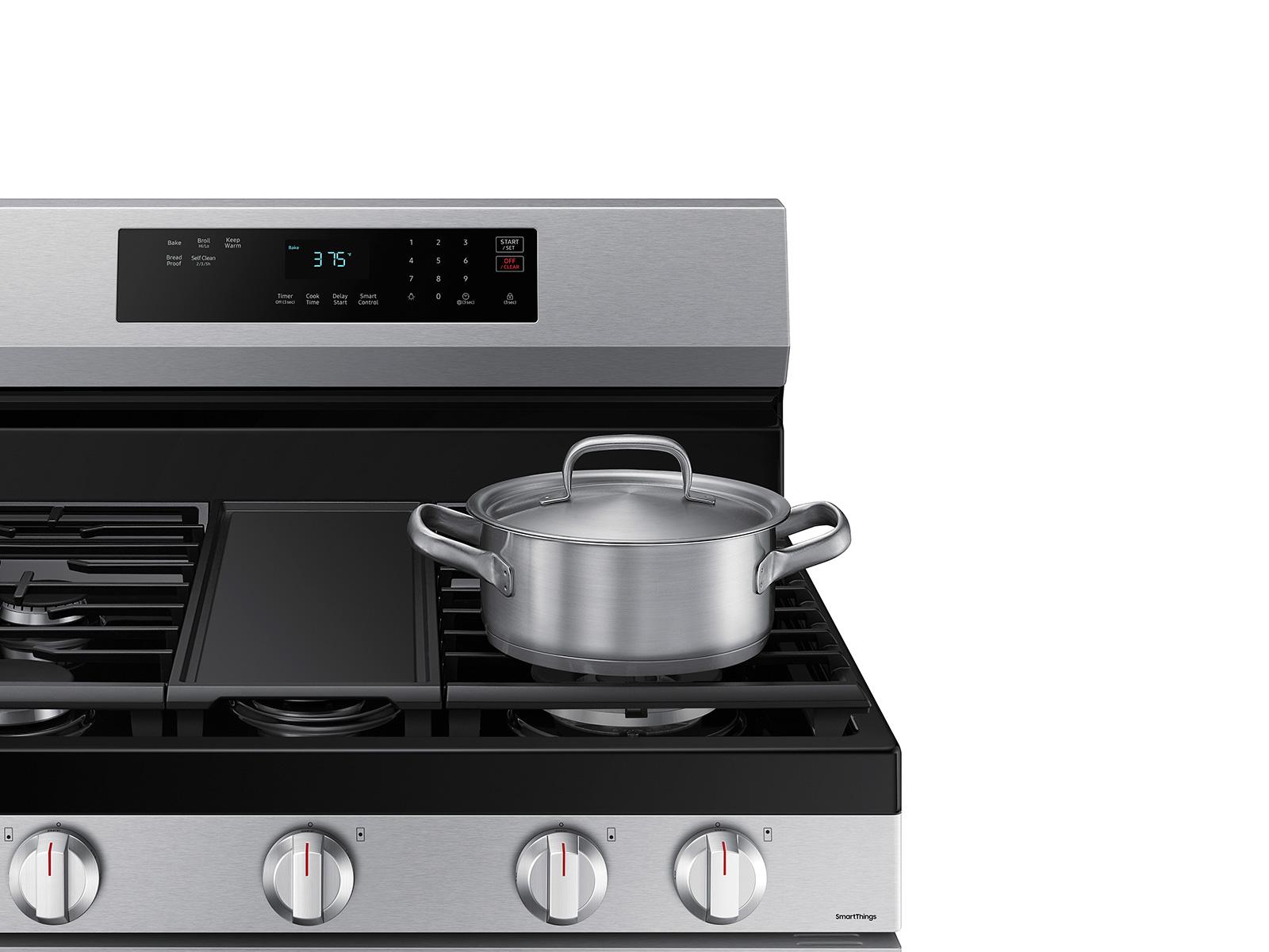 The Samsung NX60A6311SS is a 30-inch freestanding gas range designed to enhance your cooking experience with advanced features and modern design. It boasts a spacious 6.0 cu. ft. oven capacity, providing ample space for large meals. The cooktop includes five sealed burners, featuring two power burners and continuous cast iron edge-to-edge grates, allowing for easy movement of cookware across the surface. The integrated griddle offers additional cooking versatility. With Wi-Fi connectivity, you can monitor and control your oven remotely using the SmartThings app, making cooking more convenient and efficient.