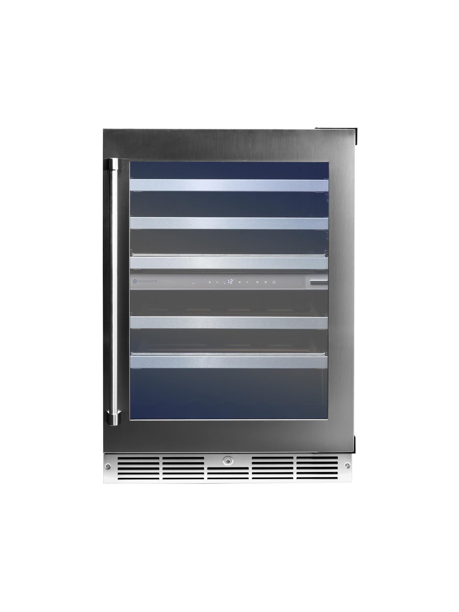 Discover unparalleled elegance with the Silhouette Pro Gen 3 - SPRWC052D3SS 24" Built-in Wine Cellar. This sleek, stainless steel wine cellar is designed to seamlessly integrate into your home, storing up to 51 standard Bordeaux or 42 wide Burgundy bottles. Its dual-zone temperature control ranges from 41(degree)F to 64(degree)F (5(degree)C to 18(degree)C), ensuring optimal preservation for both reds and whites. The patent-pending shelf system features adjustable spacing and an angled Easel Display(TM) to showcase your collection beautifully. Enjoy the convenience of soft-close doors and full extension shelving, along with zero-clearance concealed hinges and a reversible door swing. Anti-glare LED side lighting with Gallery Mode enhances visibility, while the charcoal filter, UV-blocking glass, and anti-vibration components maintain the ideal cellar environment. Perfect for any wine enthusiast, this built-in wine cellar combines functionality with modern sophistication.