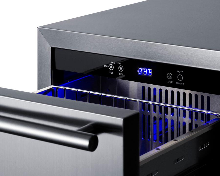 Summit manufactures one of the industry's most extensive and unique selections of outdoor refrigeration, with weatherproof choices designed to bring user convenience and lasting durability to outdoor kitchens. Sized at just 18" wide and 32" high, model ADRD18OS a two-drawer outdoor all-refrigerator that can be built-in under ADA compliant counters or used freestanding. Complete stainless steel construction inside and out is designed to hold up to the elements in style. Soft close glides allow you to gently close each drawer with a light touch. The drawers can also be customized with overlay panels to match or accent existing cabinetry design, while the stainless steel kickplate and stylish handles complete the look. This unit includes a right angle cord for a better fit. The sealed rear offers additional protection from outdoor elements. Frost-free operation ensures minimum user maintenance inside the 3.4 cu ft. interior. Each drawer includes a divider to make it easier to separate and organize your storage, with attractive and efficient LED lighting to illuminate the interior. Intuitive digital controls display a temperature readout switchable from Fahrenheit to Celsius to best suit your preference. High/low temperature alarms audibly warn if the interior goes out of the recommended range. Additional features include an open drawer alarm, child lock to secure the controls, sabbath mode for optional observance, and eco-mode for energy savings. Model ADRD18OS is ETL-S listed to NSF-7 commercial standards and also meets DOE guidelines for residential use. Additional outdoor drawer refrigerators and freezers are available, including 15" and 24" wide choices. Browse the complete Summit lineup for more options.