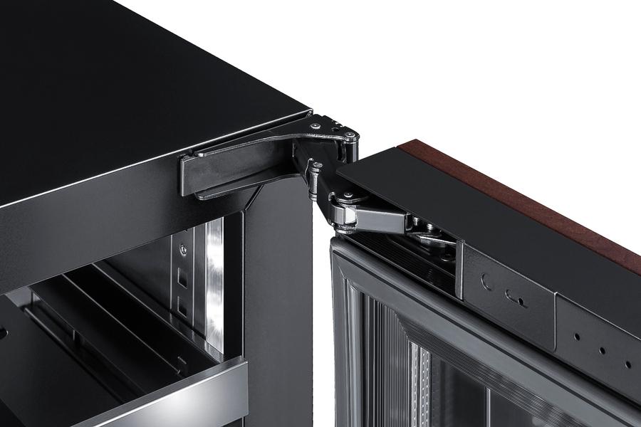 Summit's shallow depth series of built-in undercounter refrigeration brings full functionality to kitchen islands, wet bars, and other settings with space limitations. Model ASDW2412PNR is a 24" wide 33-bottle single zone wine cellar sized under 18" deep. It comes in a 32" height to fit under lower ADA compliant counters, with adjustable legs and a sliding kickplate cover that also allows you to raise the overall height up to 34" to fit standard counter spaces. The front-breathing system allows built-in installation, while the fully finished black cabinet also allows freestanding use. This unit features our European style fully articulating hinge, allowing for easy installation of custom door trim panels to match your cabinetry. The sealed rear and right angle cord ensure a better fit. The door is user-reversible and includes a front lock to protect your collection. Inside, the ASDW2412PNR features stainless steel construction for improved durability and sanitation. White LED lighting located in the side walls provides elegant display conditions, with dimmable levels that let you create the perfect presentation. The digital control panel lets you adjust the temperature between 41 and 64 F to accommodate red, white, or sparkling wine. Our uniquely designed steel shelves in a jet black finish extend smoothly on ball-bearing glides, with stainless steel front trim to complete the classic look. Fan-forced cooling ensures even temperature distribution and fast temperature recovery. Additional features include an open door alarm, high temperature alarm, and Sabbath mode setting that lets you disable some of the electrical elements during periods of observance. The ASDW2412PNR is ETL-S listed to NSF-7 commercial standards but can also be used in the home. With its deluxe style, user-friendly features, and uniquely shallow depth, this unit offers premium value for a variety of settings. Create a matching set by pairing this with our ASDW2411PNR beverage center. Additional 18" deep choices are available in 15", 19", and 24" widths, including outdoor refrigerators, refrigerator drawers, and more. NOTE: The interior can store up to 33 Bordeaux-style bottles. Due to the shallow depth of this unit, we recommend loading the bottles with the corks facing the rear for a better fit. Wider Burgundy bottles will also fit on most shelves, but as these may vary more in size, loading capacity will ultimately depend on your specific bottle design. You may also remove shelves to accommodate thicker bottles, such as champagne and sparkling wine. The lower shelf is designed to hold Bordeaux-style bottles horizontally. Please use care when loading and unloading this section.