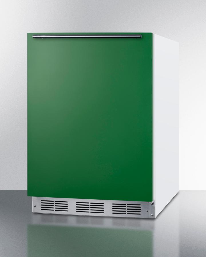 Make a statement under the counter with Summit's exclusive European collection of boldly colored refrigerators, available in standard or ADA compliant height. Model BAR611WHGADA is a 24" wide all-refrigerator sized at just 32" high for use in ADA compliant settings. The door finish comes in a striking emerald green, with a sleek horizontally mounted stainless steel handle and matching stainless steel kickplate to complete the unique look. This unit has a white exterior cabinet. It is manufactured in Europe and modified in the United States with domestic steel finishing. Inside, the BAR611WHGADA utilizes automatic defrost operation to ensure minimum user maintenance with a cold wall design for more reliable cooling. The 5.5 cu.ft. interior offers more storage space than most models in this size class. Adjustable glass shelves ensure spill-proof storage, while a large crisper drawer is ideal for keeping produce at its best. A removable wine shelf lets you keep bottles securely in place. The door includes three storage racks for condiments and tall bottles. The seamless interior also features a dial thermostat and automatic light. Additional colors are available, including saffron gold, cobalt blue, and lavender. Browse the full Summit selection to find the perfect addition to your kitchen.