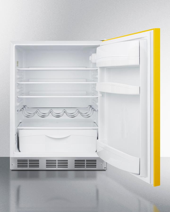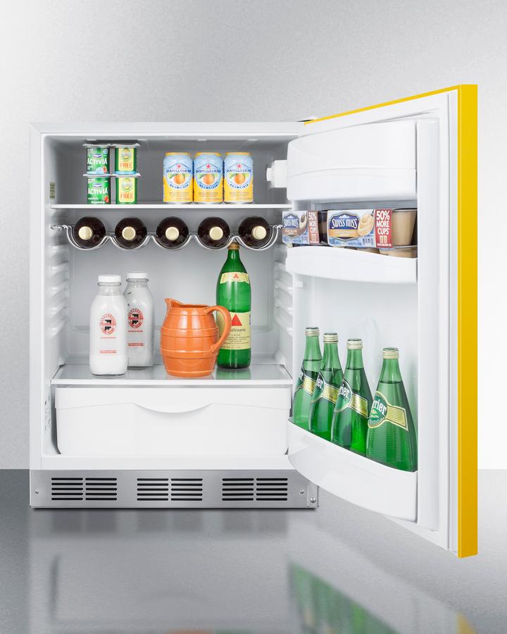 Make a statement under the counter with Summit's exclusive European collection of boldly colored refrigerators, available in standard or ADA compliant height. Model BAR611WHYADA is a 24" wide all-refrigerator sized at just 32" high for use in ADA compliant settings. The door comes in a bright saffron gold hue, with a sleek horizontally mounted stainless steel handle and matching stainless steel kickplate to complete the unique look. This unit has a white exterior cabinet. It is manufactured in Europe and modified in the United States with domestic steel finishing. Inside, the BAR611WHYADA utilizes automatic defrost operation to ensure minimum user maintenance with a cold wall design for more reliable cooling. The 5.5 cu.ft. interior offers more storage space than most models in this size class. Adjustable glass shelves ensure spill-proof storage, while a large crisper drawer is ideal for keeping produce at its best. A removable wine shelf lets you keep bottles securely in place. The door includes three storage racks for condiments and tall bottles. The seamless interior also features a dial thermostat and automatic light. Additional colors are available, including emerald green, cobalt blue, and lavender. Browse the full Summit selection to find the perfect addition to your kitchen.