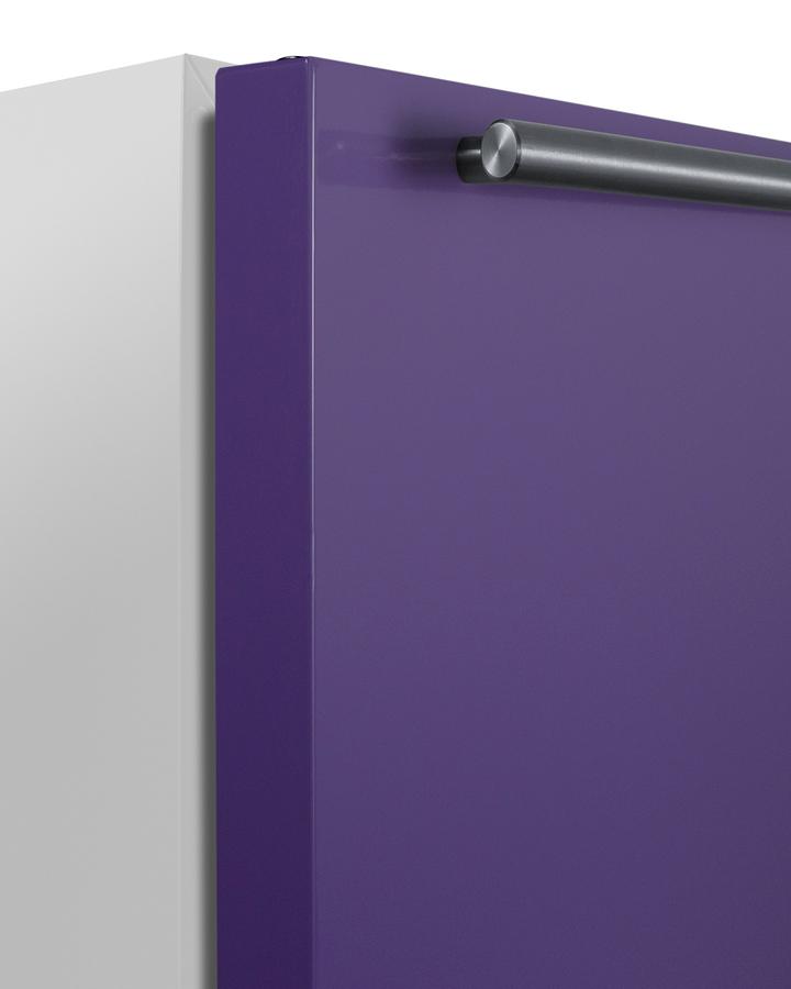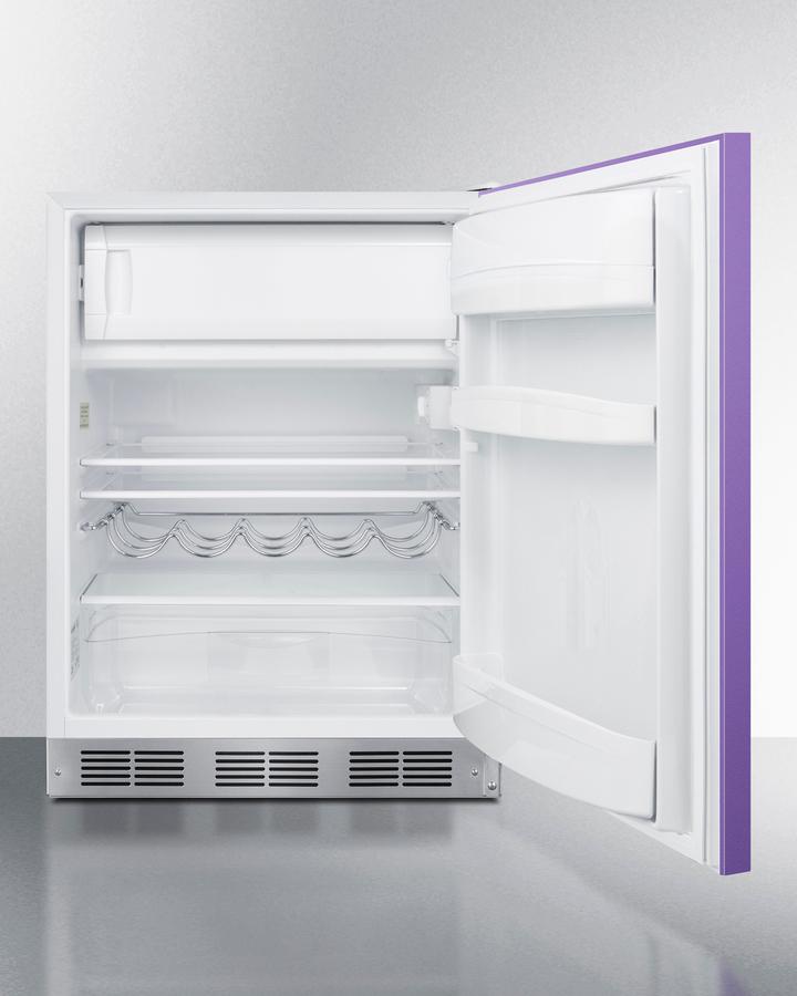 Make a statement under the counter with Summit's exclusive European collection of boldly colored refrigerators, available in standard or ADA compliant height. Model BRF611WHPADA is a 24" wide refrigerator-freezer sized at just 32" high for use in ADA compliant settings, with a generous capacity of more than 5 cu.ft. to meet general storage needs. The door finish comes in an attractive lavender purple hue, with a sleek horizontally mounted stainless steel handle and matching stainless steel kickplate to complete the unique look. This unit has a white cabinet. It is manufactured in Europe and modified in the United States with domestic steel finishing. Inside, the BRF611WHPADA features a dual evaporator to allow separated cooling of the fresh and frozen food sections. The refrigerated compartment utilizes low maintenance automatic defrost, while the interior freezer compartment is manual defrost to achieve lower storage temperatures ideal for ice cream and other frozen food. The deluxe interior includes adjustable glass shelves for spill-proof storage and easier cleaning, as well as a scalloped wine shelf to hold wine and champagne bottles safely in place. Door racks offer additional convenience for tall bottles and condiments and a clear crisper drawer ensures your produce is stored under the ideal conditions. This model includes automatic interior lighting and an adjustable dial thermostat. Additional colors are available, including saffron gold, cobalt blue, and lavender. Browse the full Summit selection to find the perfect addition to your kitchen.