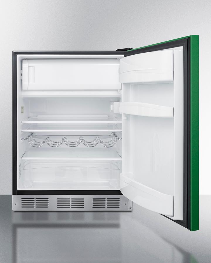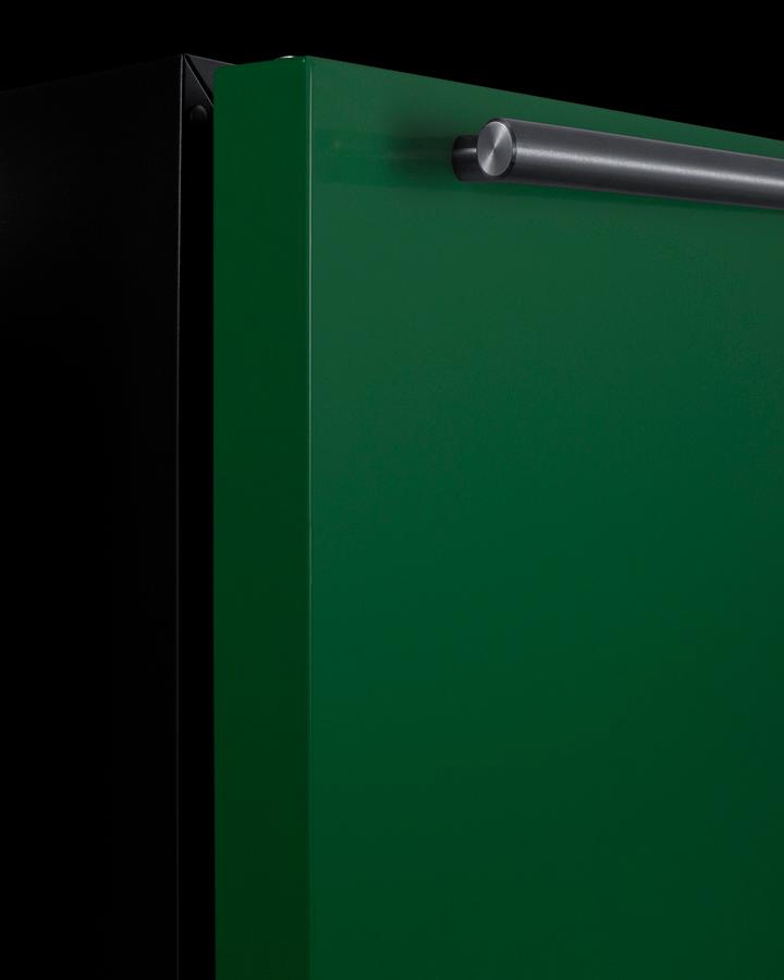Make a statement under the counter with Summit's exclusive European collection of boldly colored refrigerators, available in standard or ADA compliant height. Model BRF631BKGADA is a 24" wide refrigerator-freezer sized at just 32" high for use in ADA compliant settings, with a generous capacity of more than 5 cu.ft. to meet general storage needs. The door finish comes in a striking emerald green, with a sleek horizontally mounted stainless steel handle and matching stainless steel kickplate to complete the unique look. This unit has a jet black exterior cabinet. It is manufactured in Europe and modified in the United States with domestic steel finishing. Inside, the BRF631BKGADA features a dual evaporator to allow separated cooling of the fresh and frozen food sections. The refrigerated compartment utilizes low maintenance automatic defrost, while the interior freezer compartment is manual defrost to achieve lower storage temperatures ideal for ice cream and other frozen food. The deluxe interior includes adjustable glass shelves for spill-proof storage and easier cleaning, as well as a scalloped wine shelf to hold wine and champagne bottles safely in place. Door racks offer additional convenience for tall bottles and condiments and a clear crisper drawer ensures your produce is stored under the ideal conditions. This model includes automatic interior lighting and an adjustable dial thermostat. Additional colors are available, including saffron gold, cobalt blue, and lavender. Browse the full Summit selection to find the perfect addition to your kitchen.