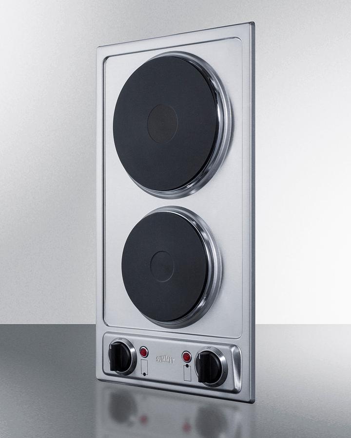 Summit's selection of electric 115V cooktops offers the perfect fit for every application, including our unique line of solid disk elements designed for maximum durability. Sized at 12" wide, the CSD2B115 is a 115V cooktop with two solid disk elements. The pre-installed power cord includes a right angle 3-prong plug for easy installation in common cutouts sized at 10 1/2" W x 19 1/4" D. Upfront push-to-turn knobs meet ADA guidelines for user accessibility while also ensuring maximum safety. This cooktop surface comes in brushed stainless steel for an attractive look built to last. The rear 900W burner is sized with an 8" diameter to fit large cookware, while the front 500W 6" element accommodates smaller pots and pans. The solid disk elements are constructed from cast iron, ensuring extreme durability. These elements also retain heat longer than traditional coil or glass top surfaces, making them ideal for keeping the contents in your pots and pans warmer before serving. Even heat distribution helps to improve your cooking results. With its modern style and durable design, the CSD2B115 is a great choice for hotels, mobile homes, tiny houses, ADUs, temporary housing, and other small kitchens with specific cooking needs. Additional 115V cooktops are available in coil, radiant, and induction style, as well as 230V solid disk cooktops in 2 and 4-burner configurations. Browse the full Summit line to find the perfect choice for your kitchen.