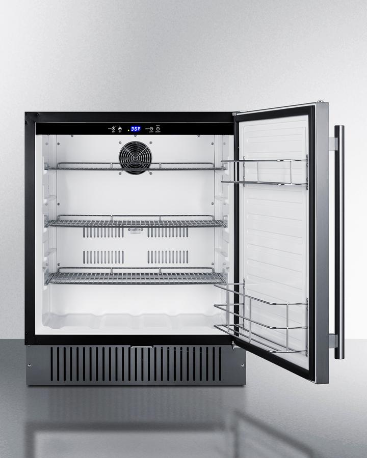 Summit is expanding its popular lineup of built-in undercounter refrigeration with new luxury choices for 27" wide spaces in residential or commercial kitchen spaces. Model FF27BSS is an all-refrigerator sized just under 27" wide and under 24" deep for an easy fit under the counter in any kitchen with limited depth. The front-breathing design allows built-in installation, while the fully finished black cabinet also enables freestanding use. The user-reversible door comes in a stainless steel finish with a vertical grain and a pro style handle. This unit has an integrated flat door hinge in stainless steel that does not add any additional height. The sealed back and right angle plug help to ensure an easy fit. We include a factory-installed lock on the door and two keys for optional security as needed. The refrigerator interior comes in a clean white finish, perfect for providing full visibility. The LED lighting can be adjusted between three levels of brightness to best suit your preferences. Additional features include a 96-hour Sabbath mode setting, high/low temperature alarm, and a child lock to secure the digital control panel. Adjustable chrome shelves make it easy to rearrange the interior as needed for the optimum storage. The door includes two racks ideal for holding condiments and the floor is slotted to keep bottles in place. The FF27BSS is ETL-S listed to NSF-7 commercial standards and is also approved for residential use. The weatherproof construction allows use in indoor or outdoor kitchens. Additional 27" wide choices are available in drawer style (SPR275OS2D) and ADA height (FF27BSSADA), with more options available soon. For this unit with a set of four commercial casters, see the FF27BSSCAS.
