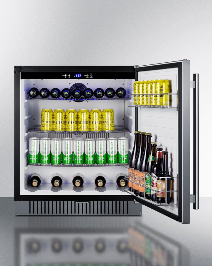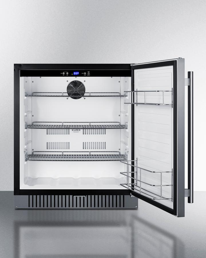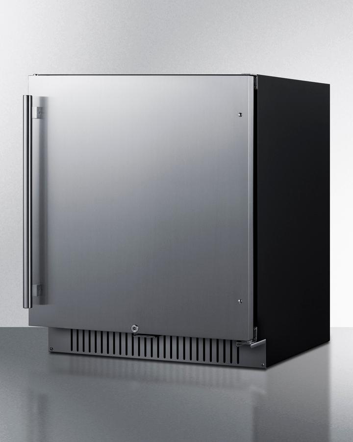 Summit is expanding its popular lineup of built-in undercounter ADA height refrigeration with new luxury choices for 27" wide spaces in residential or commercial kitchen spaces. Model FF27BSSADA is an all-refrigerator sized just under 27" wide and under 24" deep for an easy fit under in any kitchen with limited depth. The 32" height makes this perfect for use under lower ADA compliant counters. The front-breathing design allows built-in installation, while the fully finished black cabinet also enables freestanding use. The user-reversible door comes in a stainless steel finish with a vertical grain and a pro style handle. This unit has an integrated flat door hinge in stainless steel that does not add any additional height. The sealed back and right angle plug help to ensure an easy fit. We include a factory-installed lock on the door and two keys for optional security as needed. The refrigerator interior comes in a clean white finish, perfect for providing full visibility. The LED lighting can be adjusted between three levels of brightness to best suit your preferences. Additional features include a 96-hour Sabbath mode setting, high/low temperature alarm, and a child lock to secure the digital control panel. Adjustable chrome shelves make it easy to rearrange the interior as needed for the optimum storage. The door includes two racks ideal for holding condiments and the floor is slotted to keep bottles in place. The FF27BSSADA is ETL-S listed to NSF-7 commercial standards and is also approved for residential use. The weatherproof construction allows use in indoor or outdoor kitchens. Additional 27" wide choices ADA compliant choices are available in drawer style (SPR275OS2DADA). Browse the full Summit line to explore endless options for ADA compliant spaces.