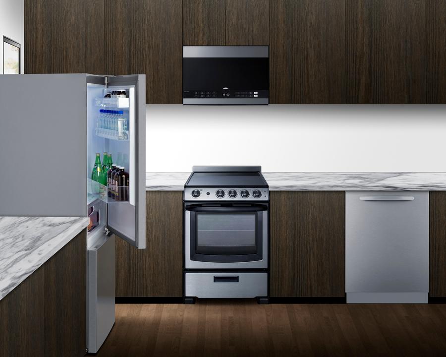 Summit's fully-featured, European-made bottom freezer refrigerators are specially designed to bring true convenience to any kitchen. The ENERGY STAR certified FFBF154SS is conveniently sized at 27.5" wide and just under 28" deep. Stainless steel doors feature a pocket handles and an attractive horizontal grain, with a smooth silver cabinet for a stylish modern look in any kitchen. The sealed back offers added space savings and easier cleanup. The doors are user-reversible to best suit your space. Inside, the FFBF154SS boasts a generous 15.1 cu.ft of storage space to meet the storage needs of any family, no matter the size. This model utilizes frost-free operation for low maintenance use. The digital controls ensure easy and intuitive temperature management. The fresh food section has LED lighting for an attractive, energy-efficient view. The interior includes three adjustable glass shelves and a full-width, humidity-controlled crisper drawer for easy produce storage. The door includes three full shelves to safely store bottles and other condiments. The bottom rack accommodates gallon-sized containers. The FFBF154SS's large freezer section features two plastic slide-out drawers that help protect your stored items from warmer temperatures when the door is opened. A SuperFreeze setting lets you run the freezer at colder temperatures, ideal for freezing newly loaded groceries. With its ENERGY STAR certified performance, attractive design, and convenient features, the FFBF154SS is the ideal choice for apartments looking for an energy-efficient refrigerator-freezer. For this unit in a classic white finish, see model FFBF151W. Explore summitappliance.com to browse our complete series of apartment-sized refrigerators.