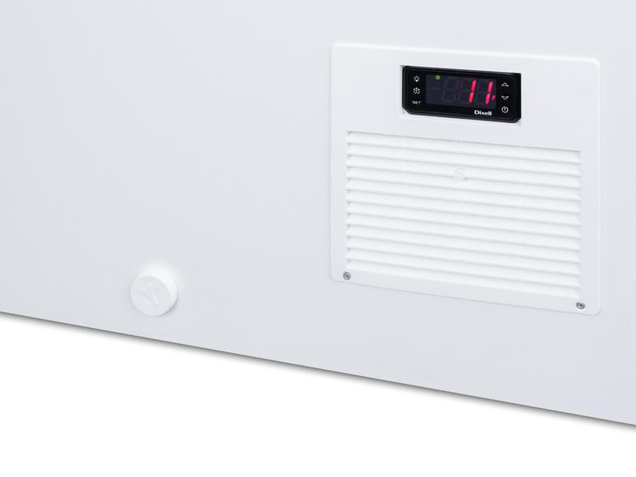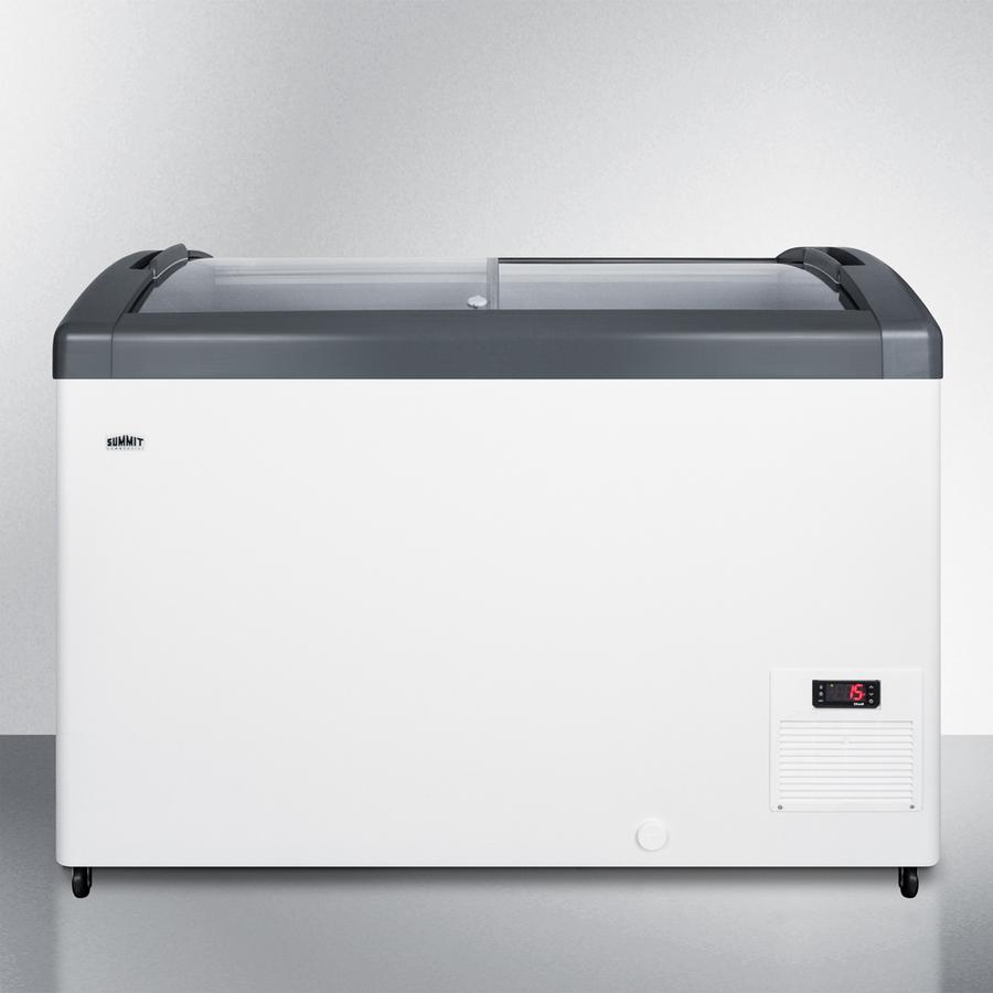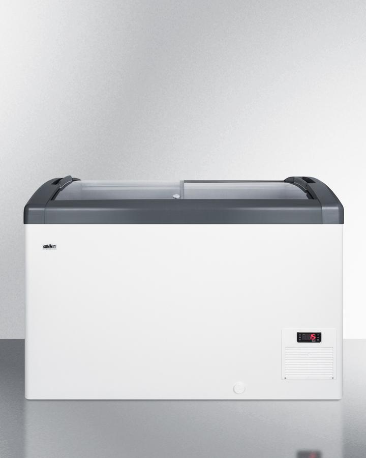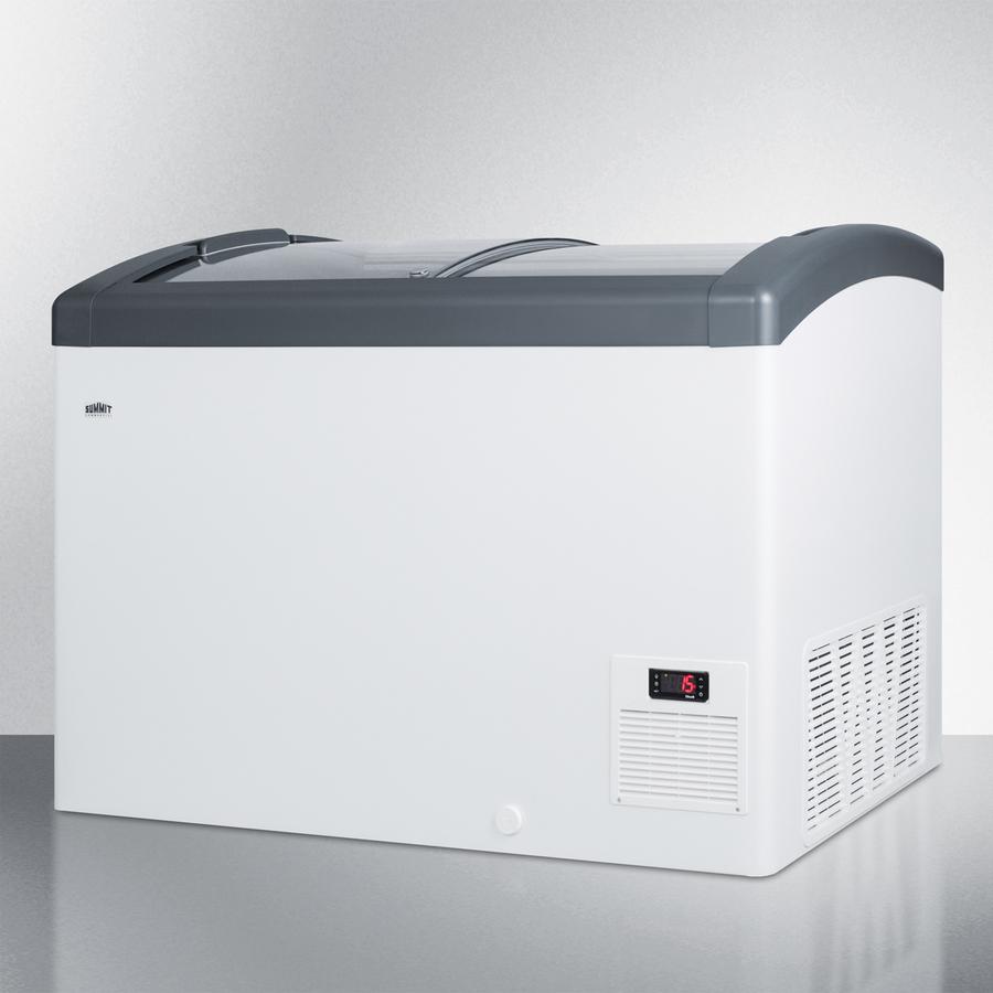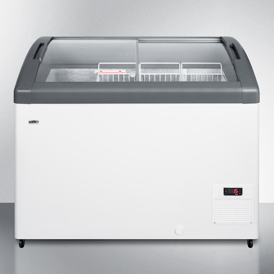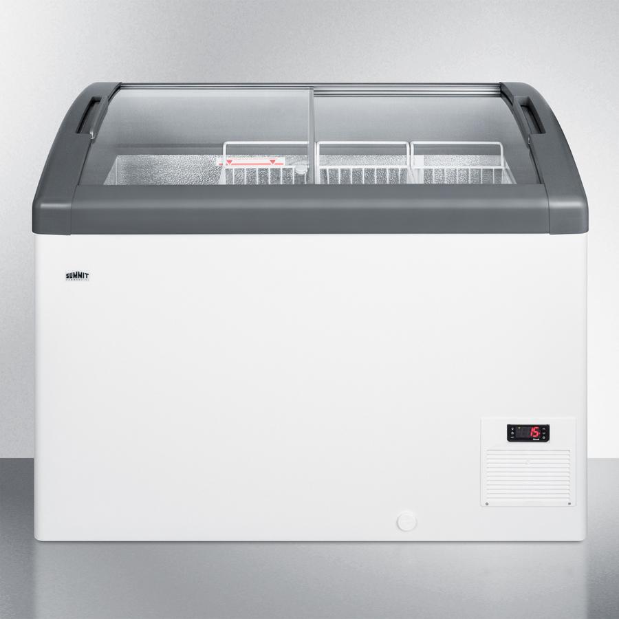 Summit Commercial's line of curved top ice cream freezers features a deluxe European design to provide quality storage and an optimum product display. Made for us by Elcold in Denmark, the FOCUS106 features two tempered glass lids on ball-bearing glides that open smoothly for added efficiency. The angled top offers increased visibility to help maximize impulse sales. This unit includes a removable keyed lock to allow users the option of securing their goods. The white cabinet suits any setting, while the gray lid trim offers an added touch of clean style. We include a set of sturdy commercial casters for users to install if they prefer the freezer more mobile. The digital thermostat is externally located for easy temperature management, with a wide range from -13 to 23 F to accommodate a variety of desserts. We pre-set the unit to -4 F. Inside, the FOCUS106 features hammered aluminum walls designed for lasting durability in busy commercial settings. We include three epoxy coated wire novelty baskets, ideal for storing frozen treats and designed to easily glide back and forth as needed. This unit utilizes a manual defrost cooling system with environmentally friendly R290a cooling agent and extra thick insulation to ensure added reliability. A drain is included for easy defrosting. The FOCUS106 is UL-S listed to NSF-7 commercial standards. Additional sizes are available.