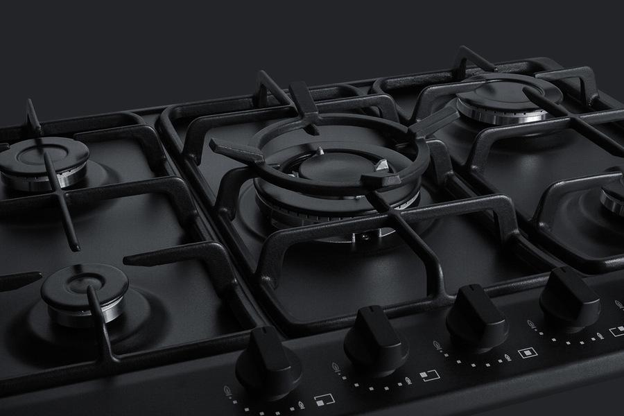 Made in Italy for SUMMIT, our deluxe gas cooktops offer the ideal cooking experience for modern kitchens. The GC5272B is uniquely sized at 27" wide but with a design that fits many standard 24" cutouts, with five burners to help you maximize your cooking power in a more efficient use of counter space. Continuous cast iron grates are designed to hold up to heavy duty pots and pans, making it easy to side cookware from one burner to another. The steel surface features a black matte finish for a seamless look that blends into the grates and burner caps. The color-matched knobs are centrally located for easy use and require a gentle push-to-turn motion to prevent accidents. This unit is equipped with thermocouple flame failure protection to ensure gas will turn off if the flame is extinguished. It utilizes electronic spark ignition and comes with a pre-installed 115V power cord. Five sealed Sabaf burners provide a range of cooking power to help accommodate a variety of heating needs. The center ultra rapid 11,000 BTU burner includes a dual flame and removable cast iron wok stand to offer more even heating for large cooking vessels. The right rear burner offers a 10,000 BTU cooking performance, ideal for boiling pots of water or cooking large dishes. The front right and rear left semi-rapid 6,100 BTU burners meet most general cooking needs, while the auxiliary 1,200 to 3,550 BTU front left burner allows you to achieve more precision in gentle heating. The GC5272B comes preset for natural gas operation. We include a conversion kit that lets you adjust for LP gas connections. We also offer customized stainless steel trim kits to allow this cooktop to fit into a wider cutout. For details, see the TK Custom. To fit standard 30" wide cutouts, see the GC5272BTK30.