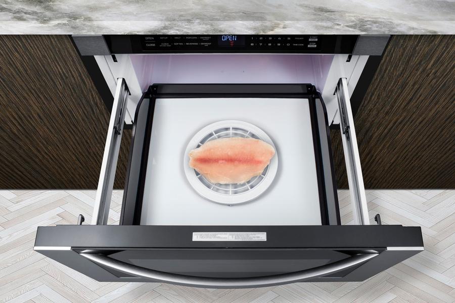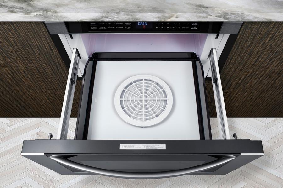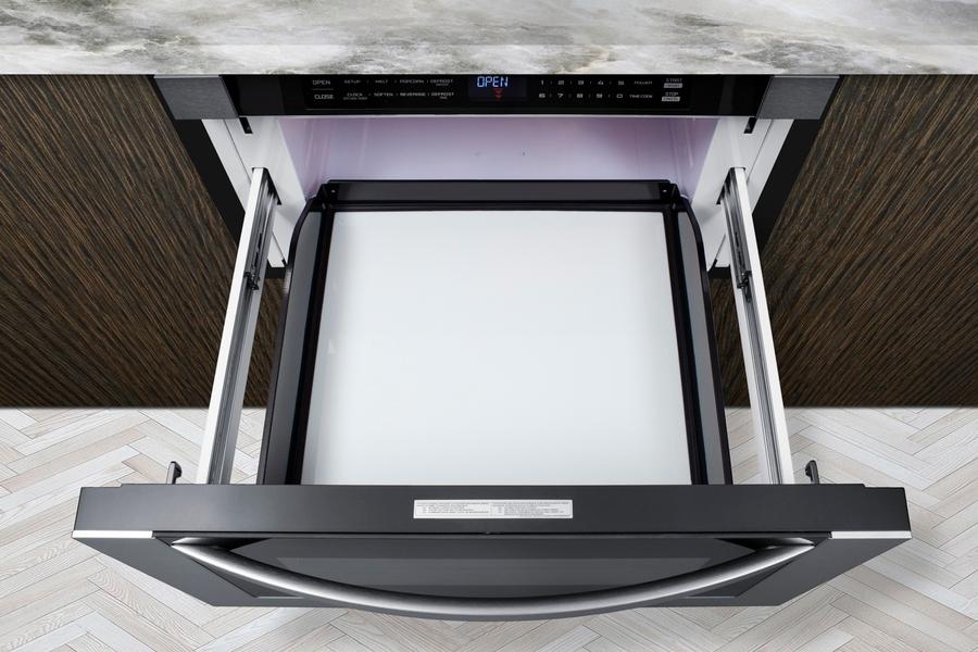 Summit's innovative one-touch drawer microwave brings new style and function under the counter. Sized for 24" wide openings, model MDR245SS is a 1.2 cu.ft. microwave with a pull-out drawer that can be installed in wall openings and kitchen islands, helping to free up counter space. One-touch open and close buttons make it easy to access and the top-loading design lets you monitor your cooking progress from the perfect position. The white interior includes a light, making it safer to remove hot items. This unit comes with a brushed stainless steel and jet black exterior for a modern look to suit any kitchen. This unit can be installed in compliance with ADA guidelines to ensure user accessibility. The control panel is set at a slight angle, making it easier to keep the settings in full view from any position. Enjoy full microwave functionality with the MDR245SS's convenient features. 11 power levels let you select the right conditions for any meal. The "defrost by weight" setting helps to ensure a more efficient thawing process. Additional one-touch settings include a +30 seconds setting, popcorn button, beverage button, and melt setting that lets you choose from butter, chocolate, cheese, or marshmallow. A "soften" setting lets you achieve the best conditions for butter, cream cheese, or ice cream. This unit has an audible buzzer, which can be disabled if you prefer a quieter operation. A child lock and clock/timer are also included. Model MDR245SS is designed to fit inside traditional 24" wide cabinet openings (for detailed installation guidelines, see page 12 of the use and care manual). In addition to our built-in drawer microwave, Summit offers other integrated appliances including gas and electric wall ovens, wine cellars, and single drawer refrigerators. Browse our full selection to explore your options.