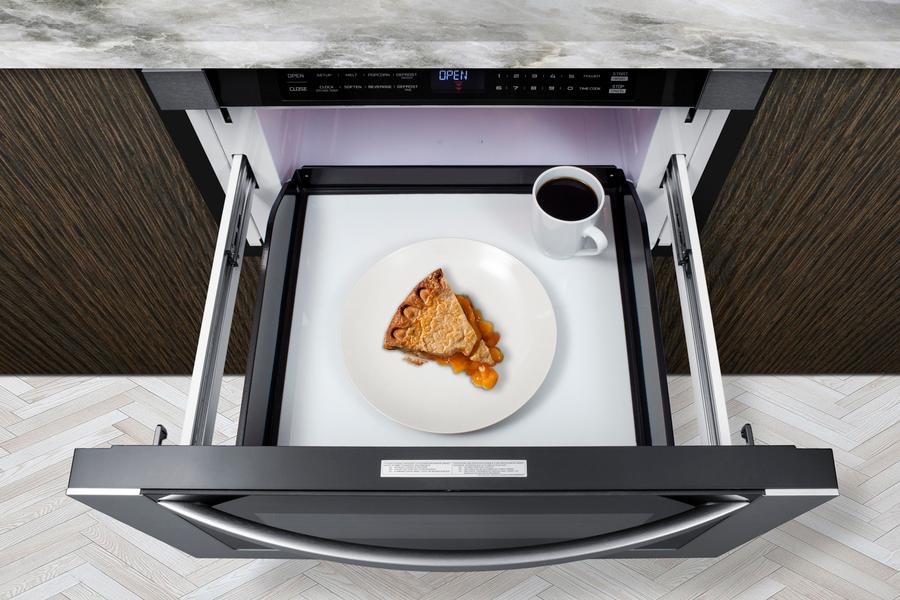 • Slide-out drawer lets you check your cooking without removing it from the microwave, helping to reduce spills