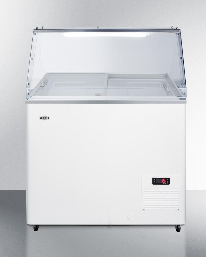 Summit Commercial's line offers the industry's best value on fully assembled dipping cabinets, with European ice cream freezers equipped with durable sneezeguards for convenient serving. Made for us by Elcold in Denmark, the NOVA22PDC is a 30" wide flat top ice cream freezer with a clear polycarbonate sneezeguard installed on top. Two tempered glass lids on ball-bearing glides open and close smoothly to save your staff time and ensure ice cream isn't overexposed to warmer air temperature. We include a removable keyed lock to allow users the option of securing their goods. The white cabinet suits any setting, while the gray lid trim offers an added touch of clean style. Casters are included for optional installation. The digital thermostat is externally located for easy temperature management, with a wide range from -13 to 23 F to accommodate a variety of desserts. We pre-set the unit to -4 F. Inside, the NOVA22PDC features a steel interior in a clean white finish designed for lasting durability in busy commercial settings. We include 2 wire tub holder baskets with plastic lids to hold 4 11" round/3 gallon ice cream tubs, with room to store an additional 2 under the baskets. This unit utilizes a manual defrost cooling system with environmentally friendly R290a cooling agent and extra thick insulation to ensure added reliability. A drain is included for easy defrosting. The NOVA22PDC is UL-S listed to NSF-7 commercial standards and ships fully assembled for easy use. Additional sizes are available. Note: Gelato pan holders are also available. To substitute the baskets, add complimentary upgrade "GLTO" or contact our sales team at 718-893-3900 ext. 507.