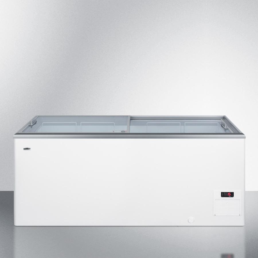 Summit Commercial's line of flat top ice cream freezers features a deluxe European design to provide quality storage and long-lasting convenience. Made for us by Elcold in Denmark, the NOVA53 features two tempered glass lids on ball-bearing glides that open and close smoothly to save your staff time and ensure ice cream isn't overexposed to warmer air temperature. This unit includes a removable keyed lock to allow users the option of securing their goods. The white cabinet suits any setting, while the gray lid trim offers an added touch of clean style. We include a set of sturdy commercial casters for users to install if they prefer the freezer more mobile. The digital thermostat is externally located for easy temperature management, with a wide range from -13 to 23 F to accommodate a variety of desserts. We pre-set the unit to -4 F. Inside, the NOVA45 features a steel interior in a clean white finish designed for lasting durability in busy commercial settings. We include four epoxy coated wire novelty baskets, ideal for storing frozen treats and designed to easily glide back and forth as needed. This unit utilizes a manual defrost cooling system with environmentally friendly R290a cooling agent and extra thick insulation to ensure added reliability. A drain is included for easy defrosting. The NOVA53 is UL-S listed to NSF-7 commercial standards. Additional sizes are available.